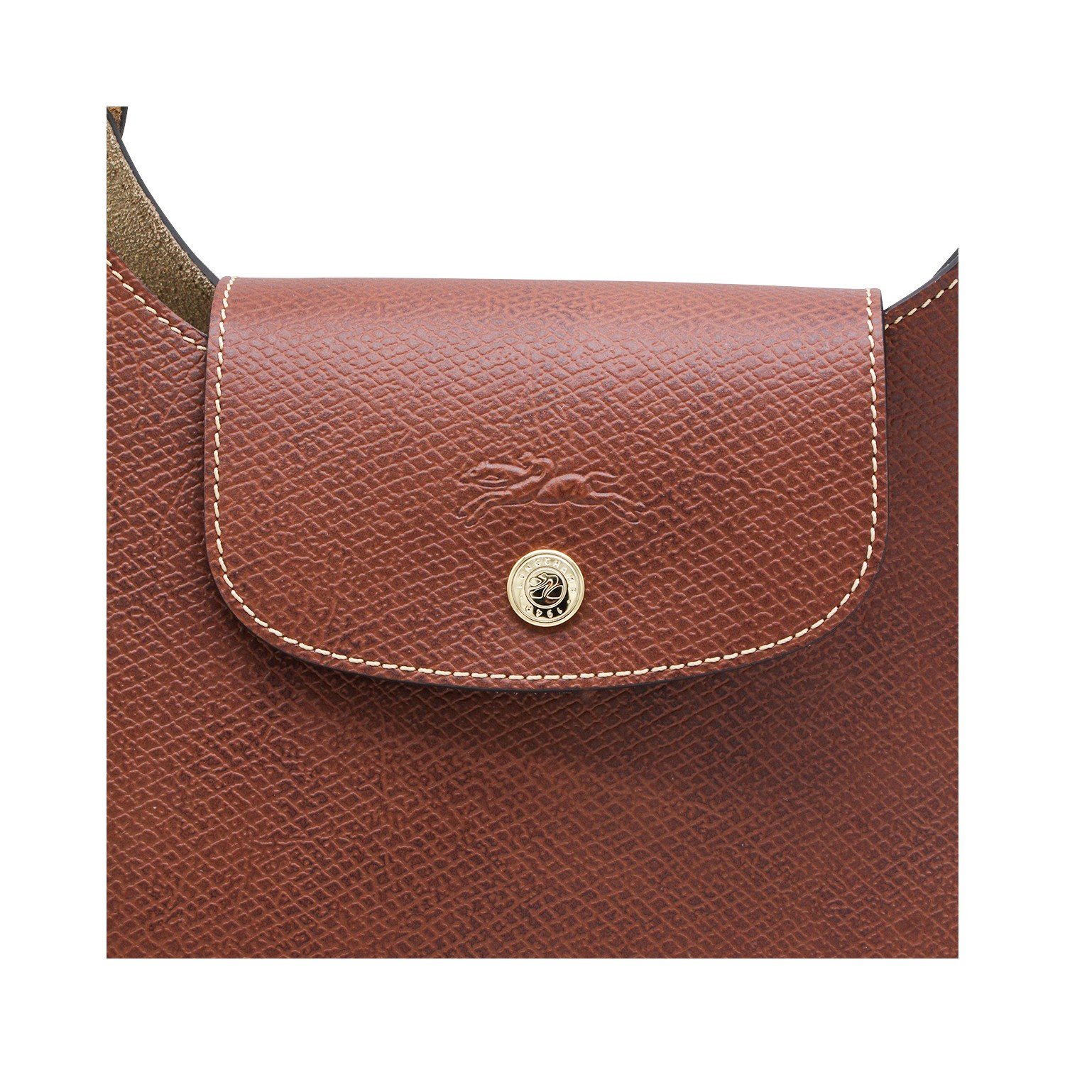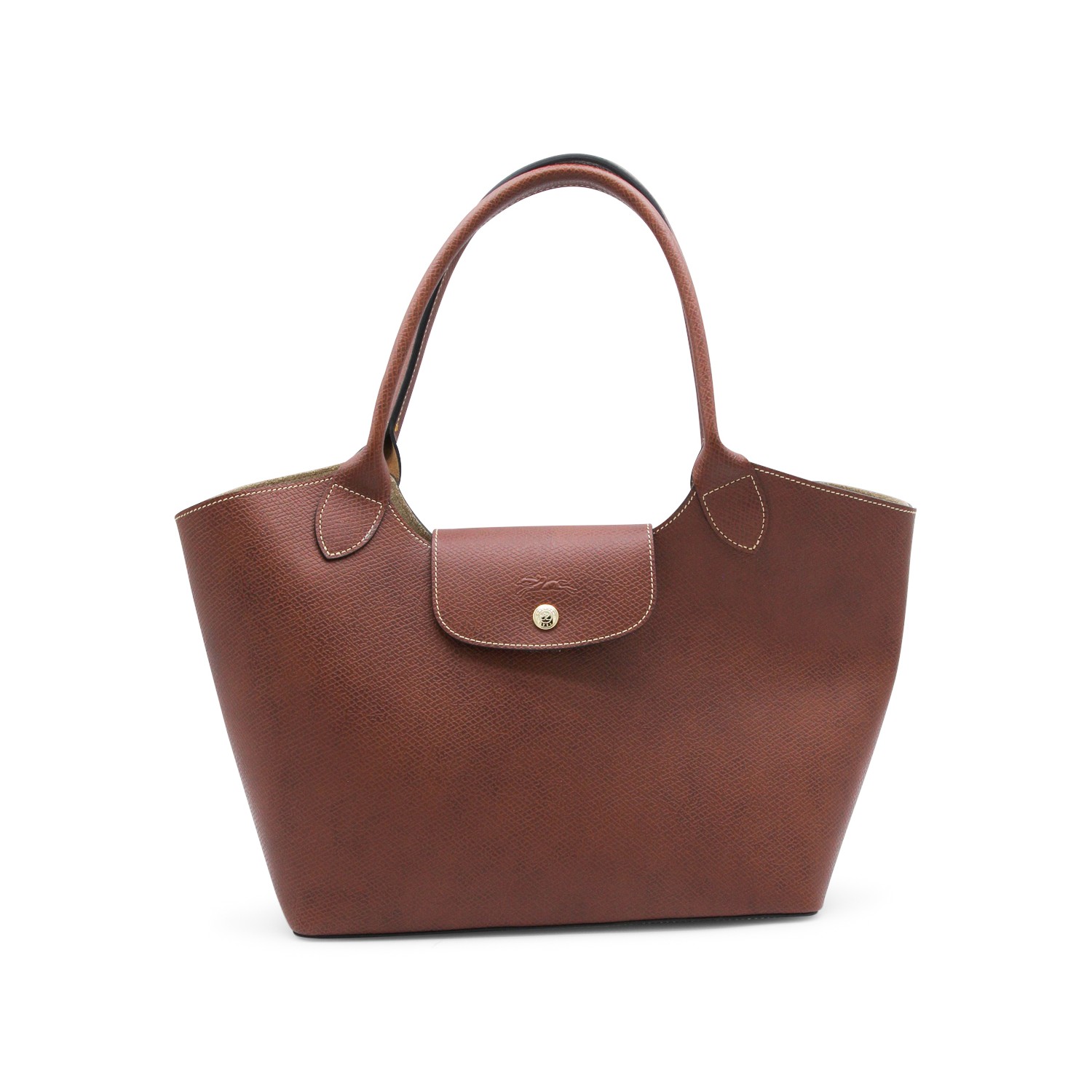 Brown Epure tote from Longchamp featuring top handles, flap with snap button closure, main compartment and internal pocket.