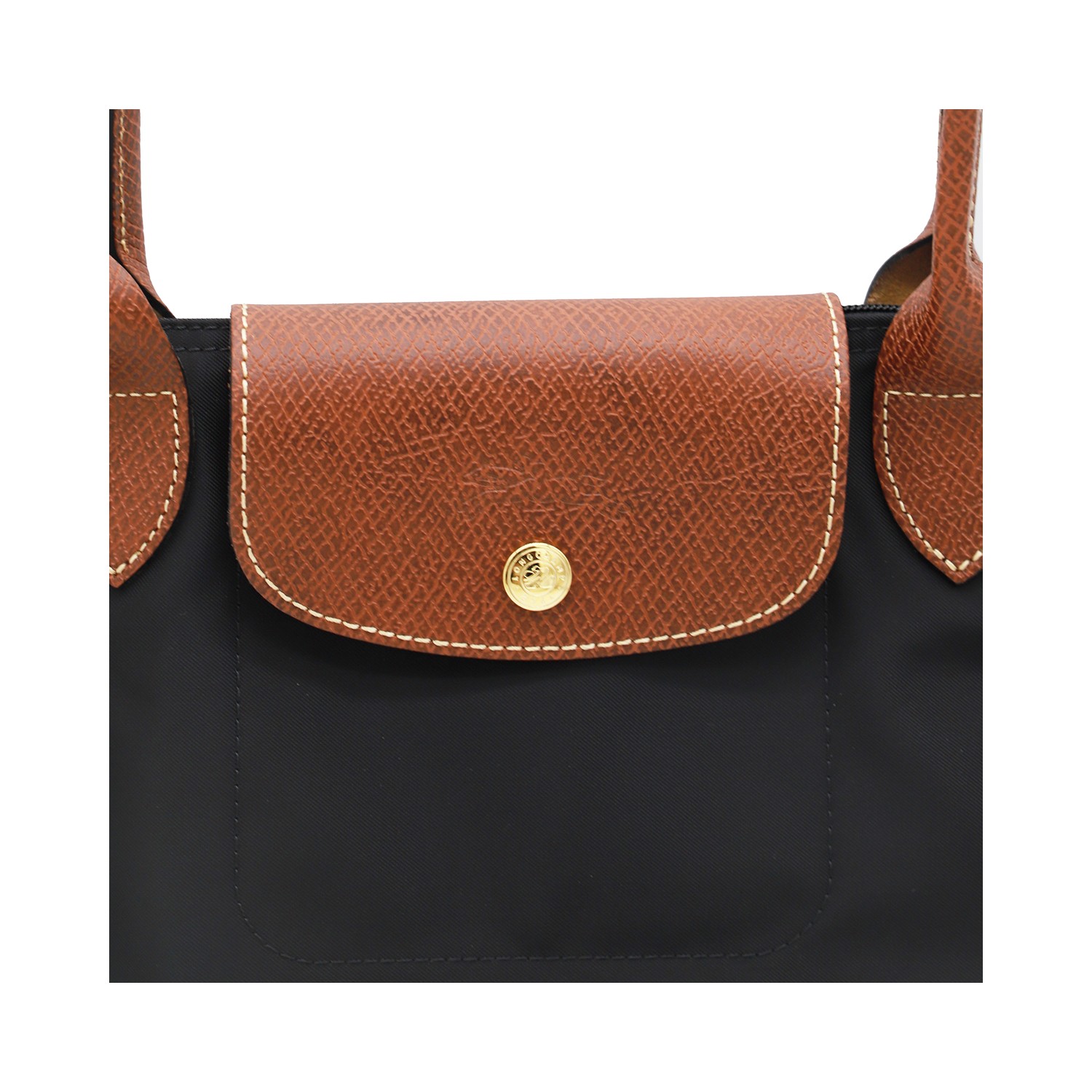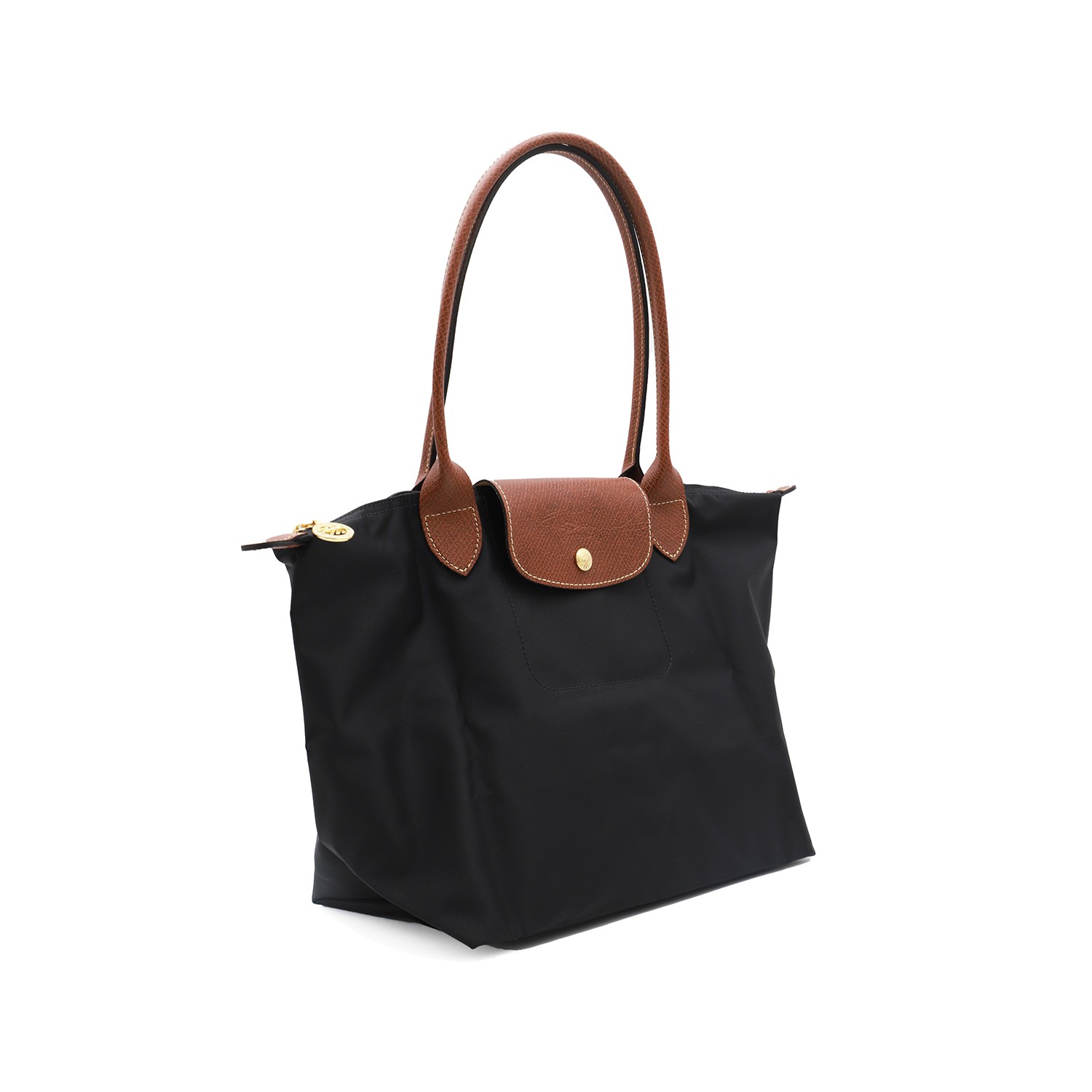 Black Le Pliage Original M tote from Longchamp featuring leather handles, zip fastening, flap whit snap button, main compartment and internal pockets.