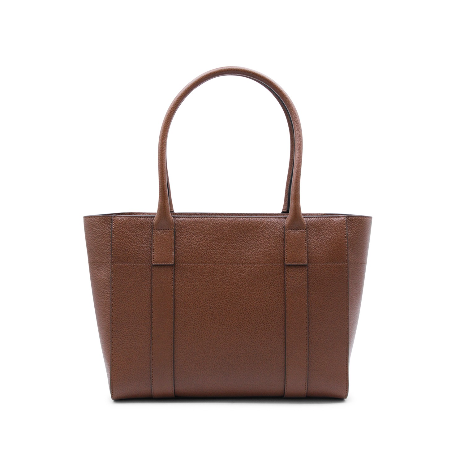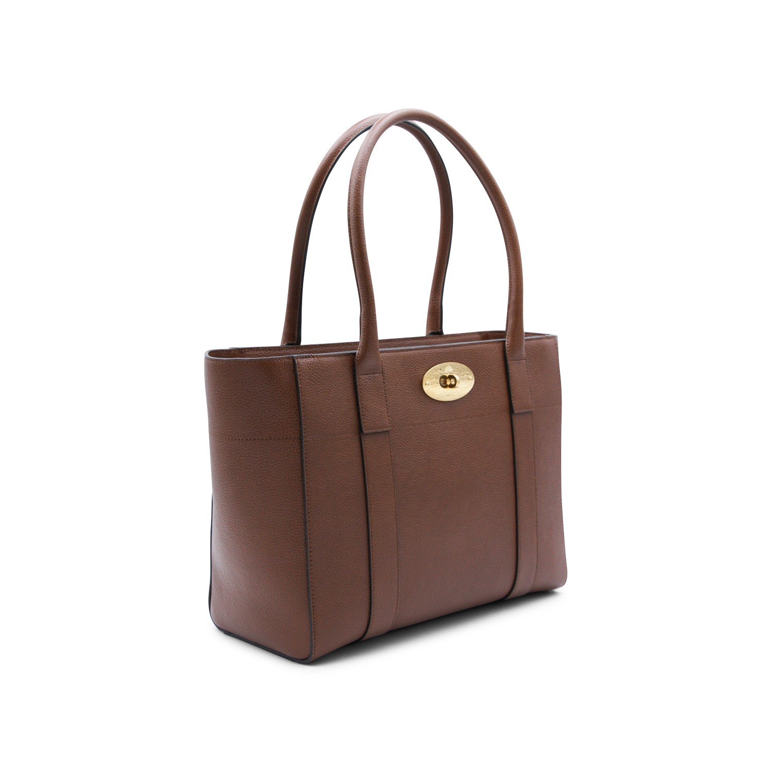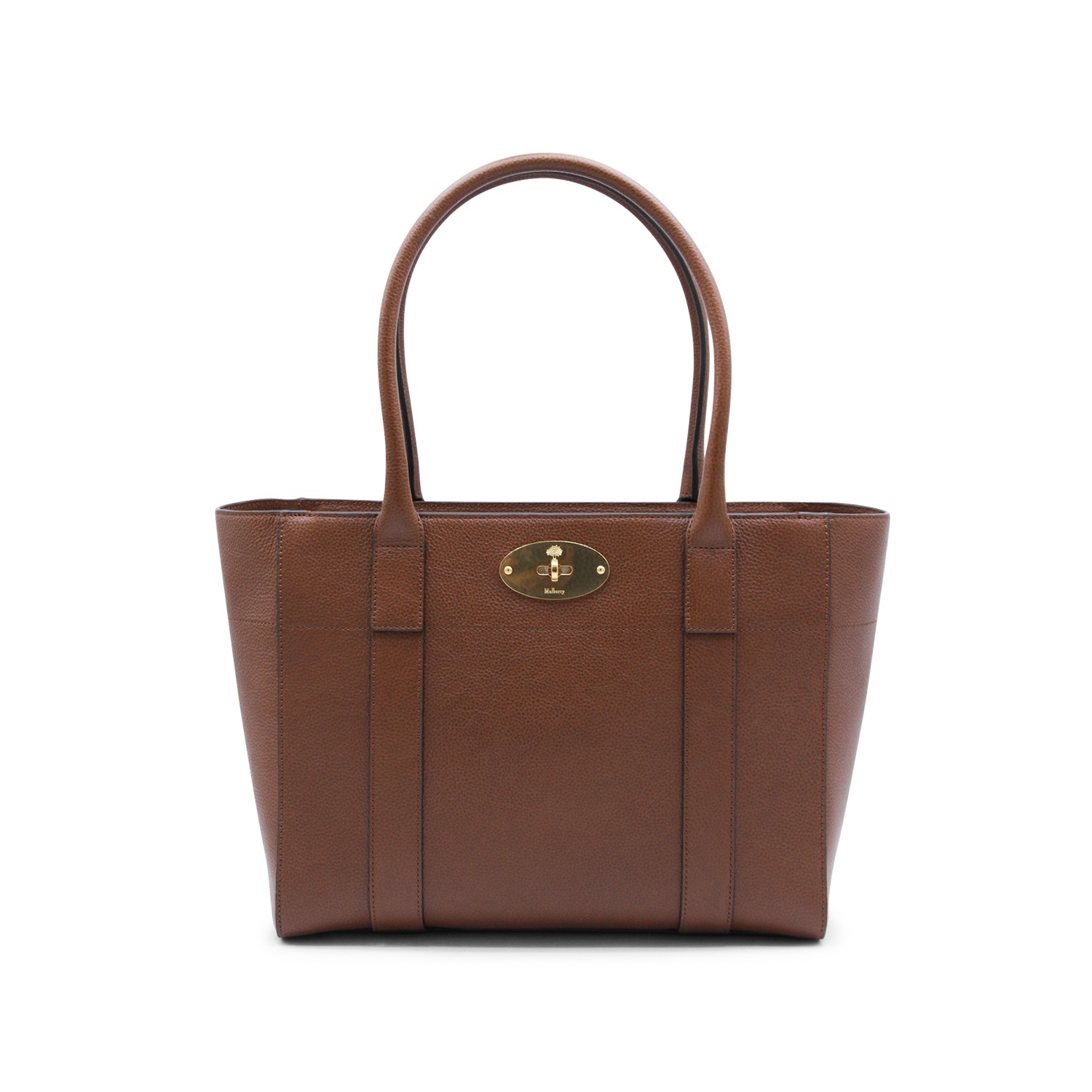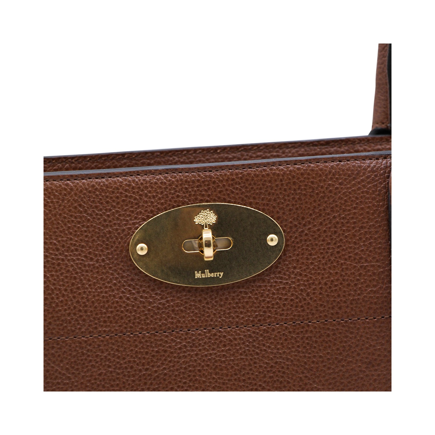 Brown leather Bayswater 9 to 5 totes from Mulberry featuring top handles, upper fastening, gold tone hardeware and pocket.