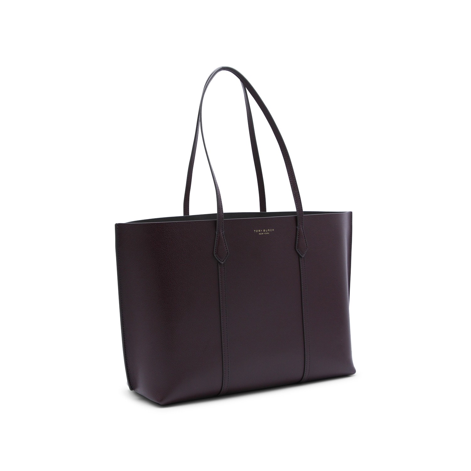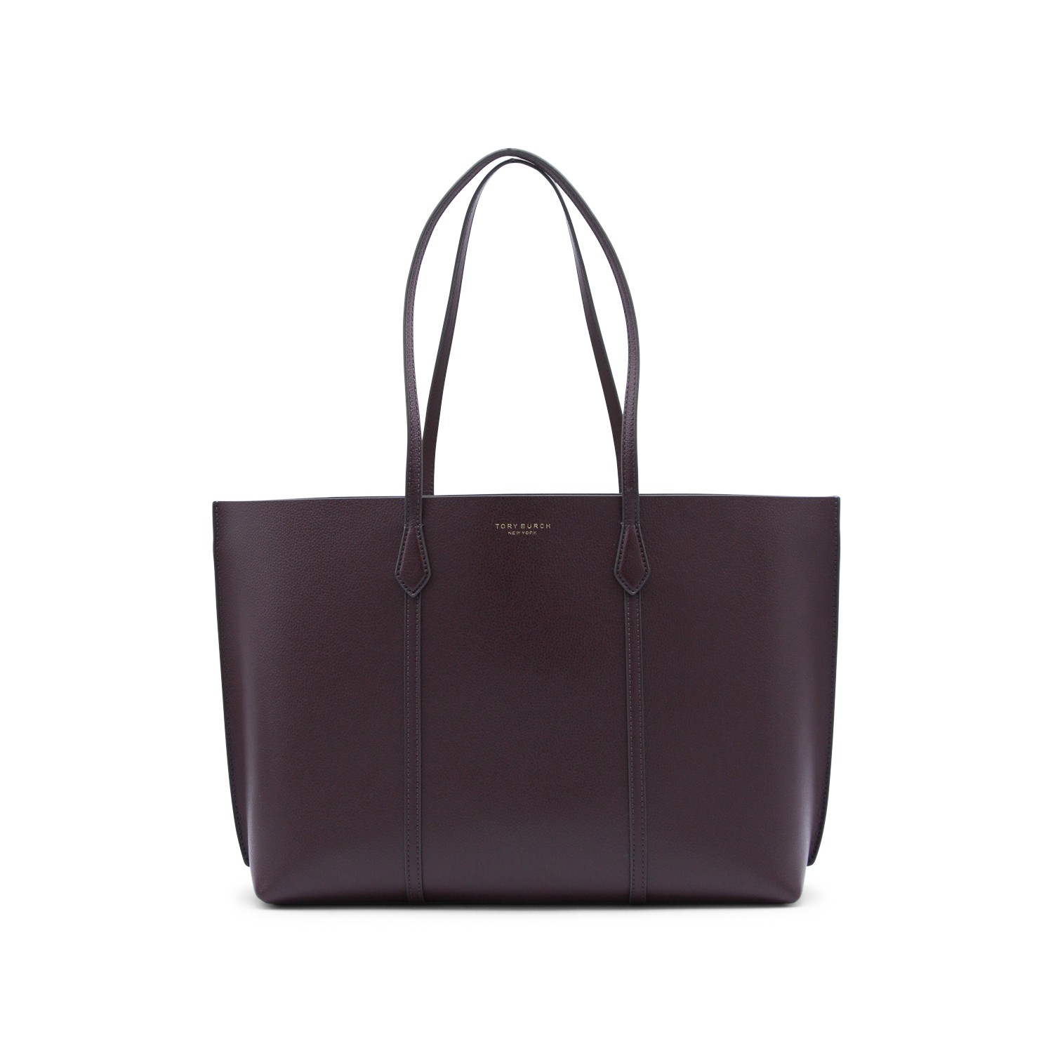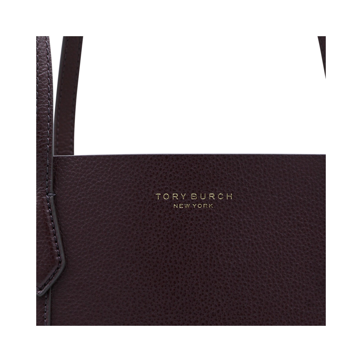 Dark brown leather totes from Tory Burch featuring top handles, upper fastening, frontal logo and inside pocket.