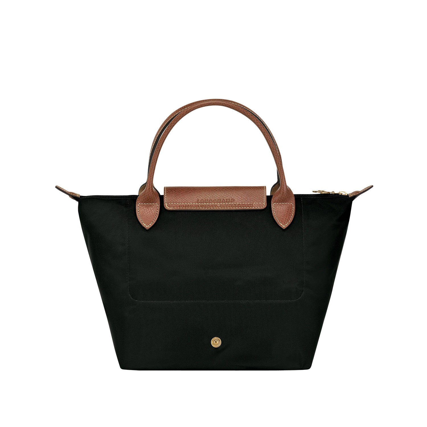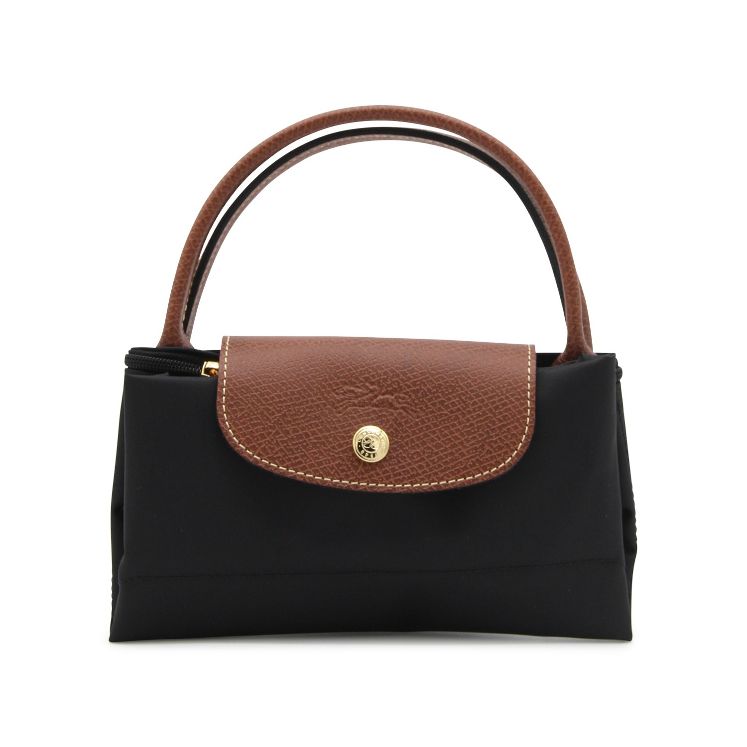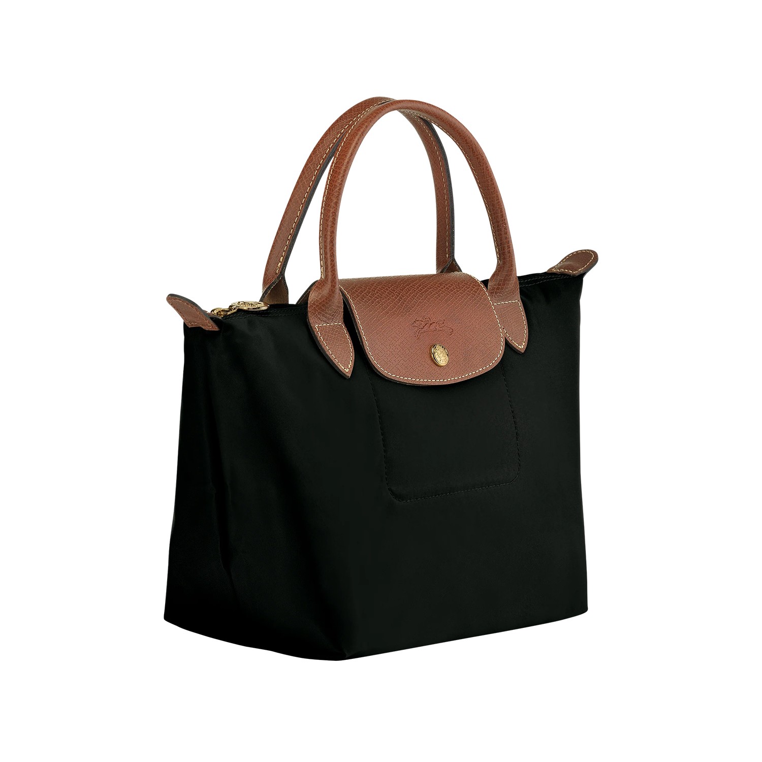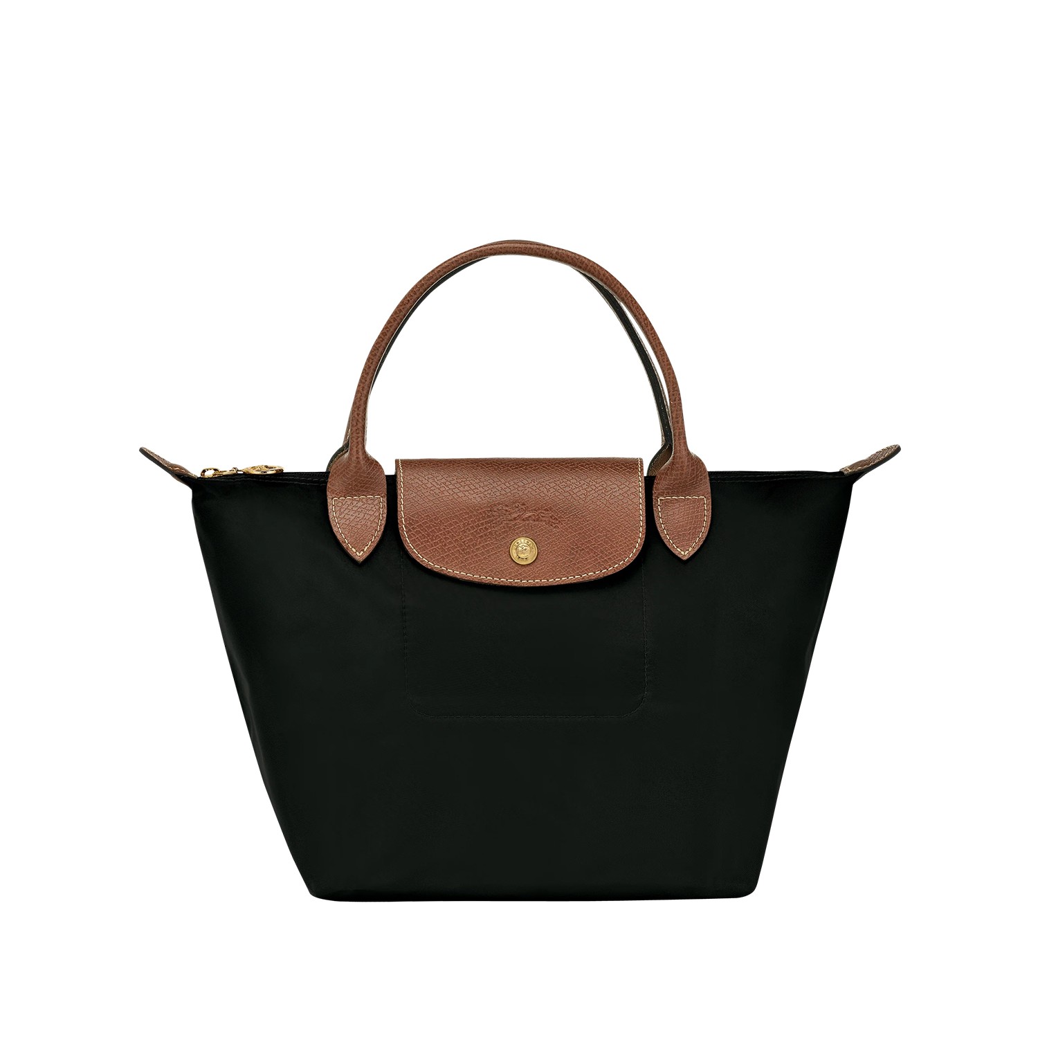 Black leather Le Pliage Original S totes from Longchamp featuring top handles, zip fastening, flap with snap button closure, main compartment and internal flat pockets.