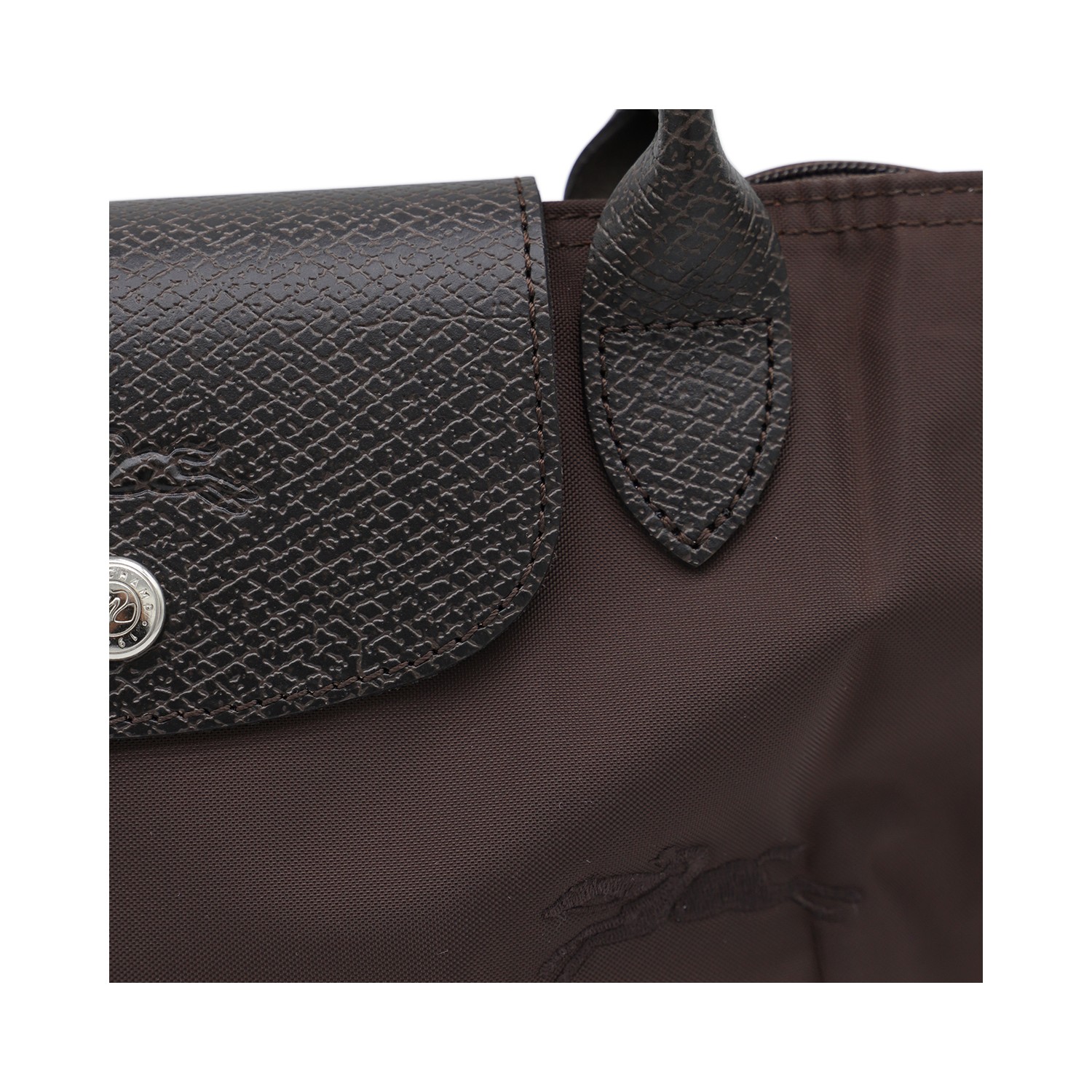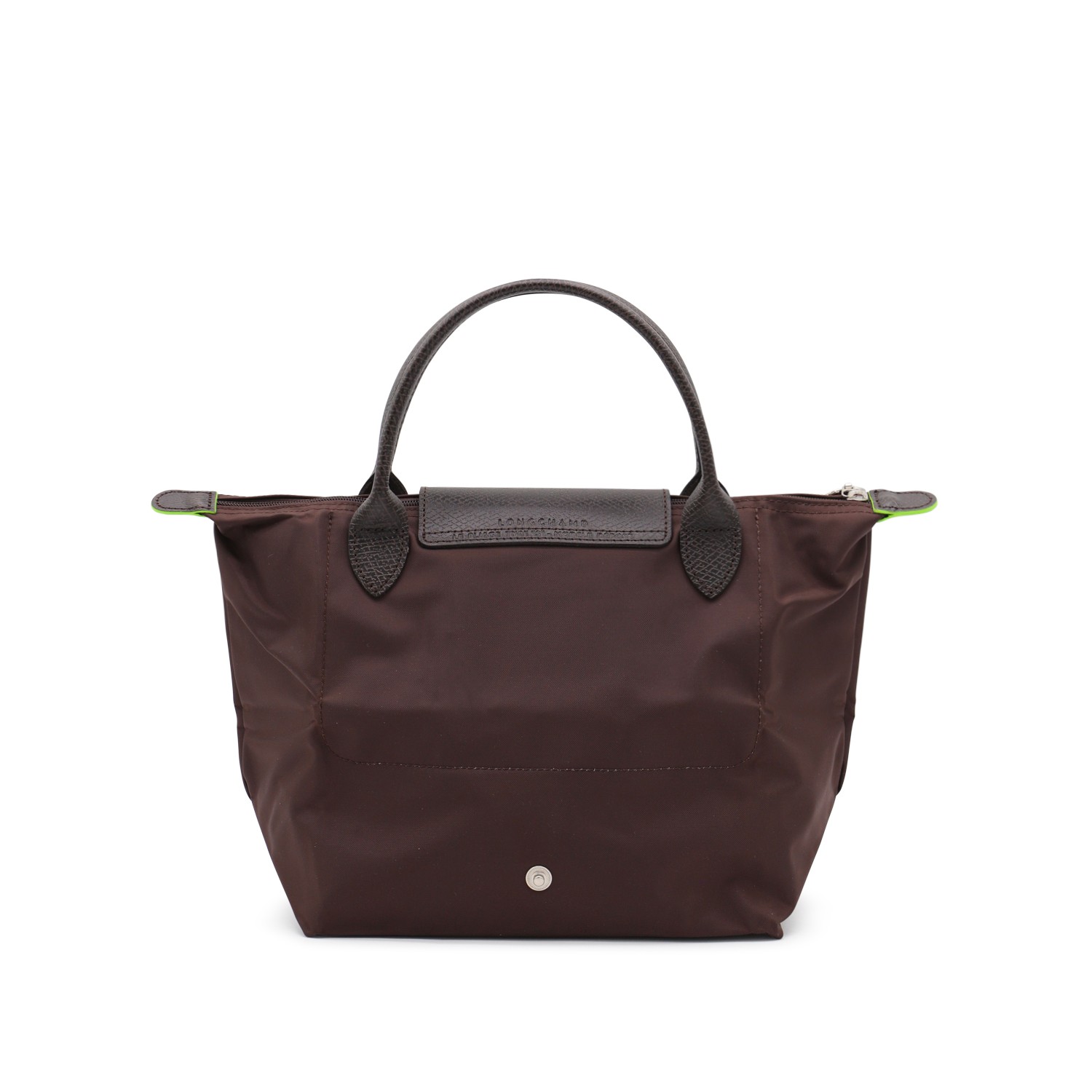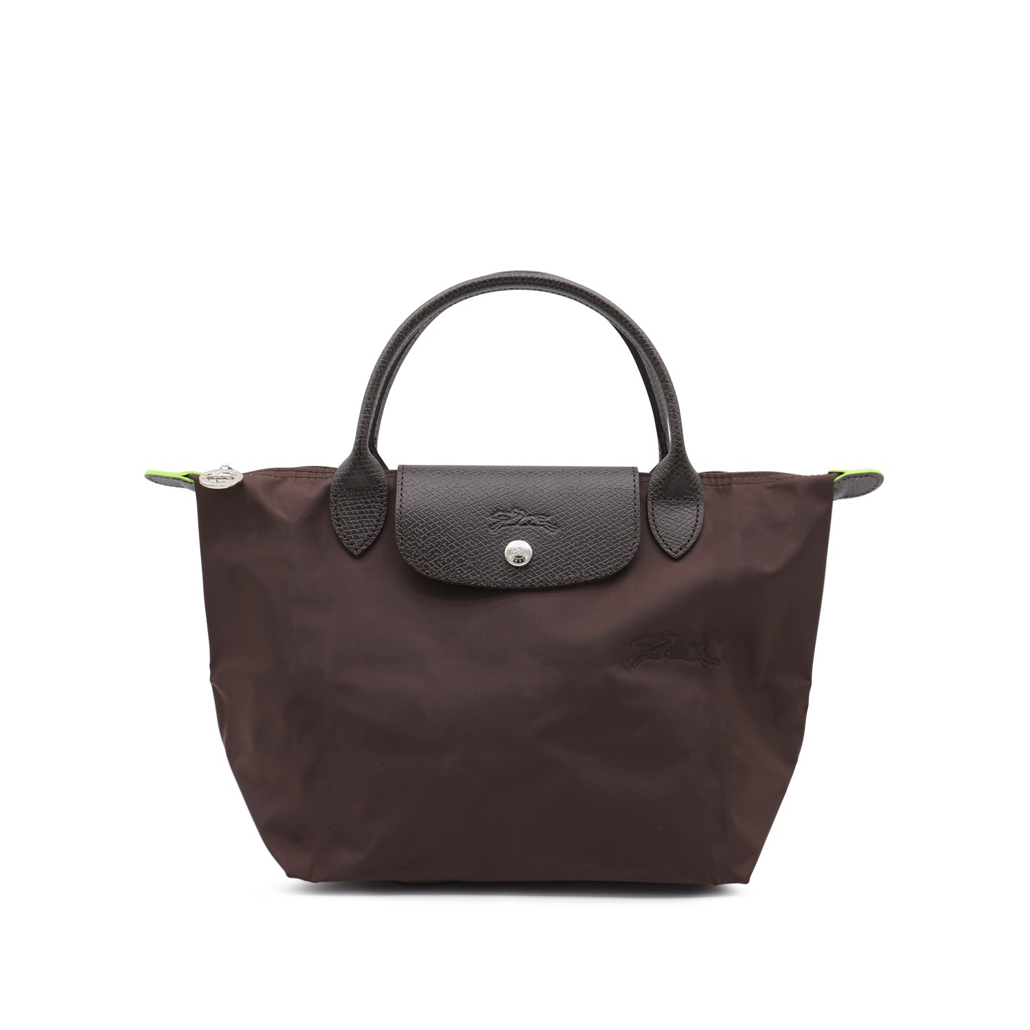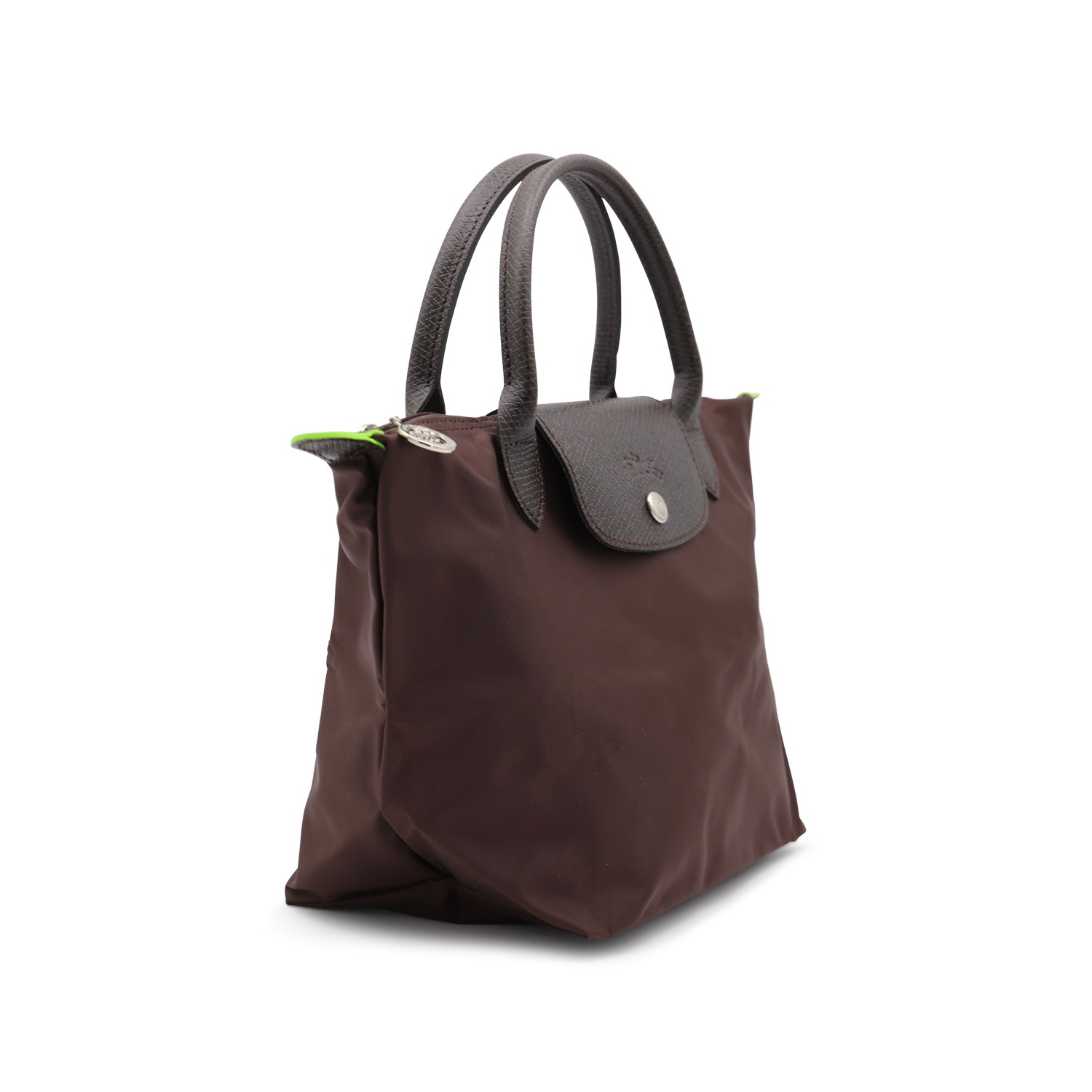 Dark brown leather Le Pliage Original S totes from Longchamp featuring top handles, zip fastening, flap with snap button closure, main compartment and internal flat pockets.