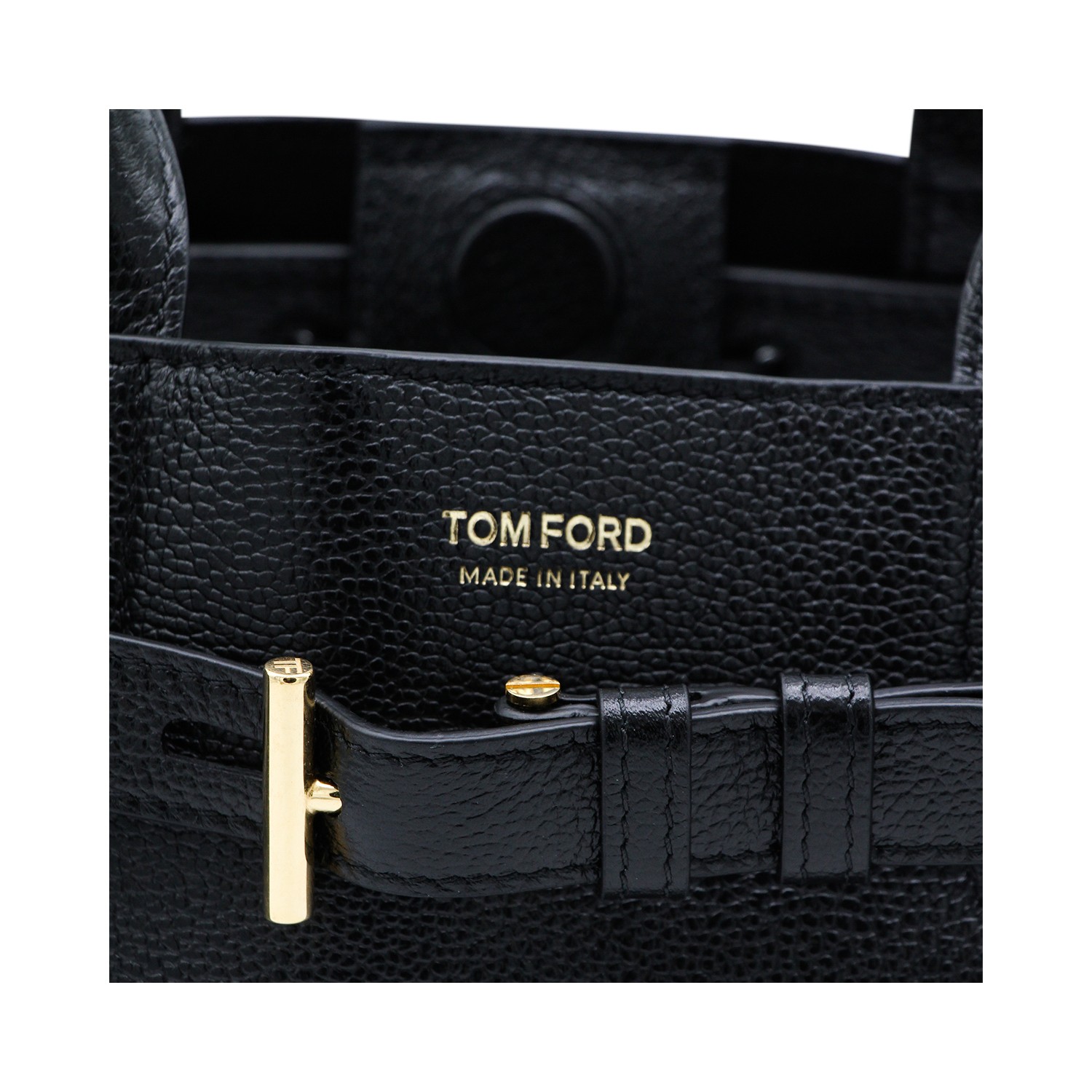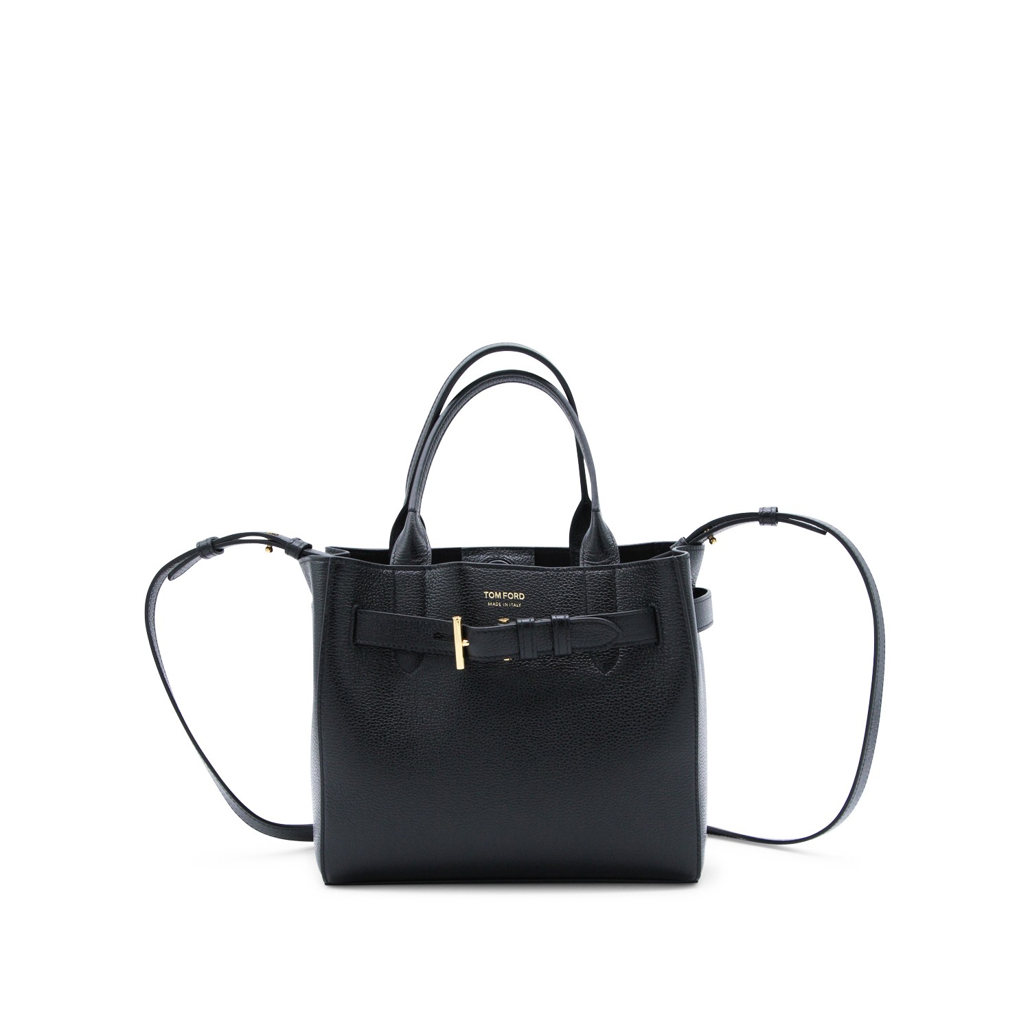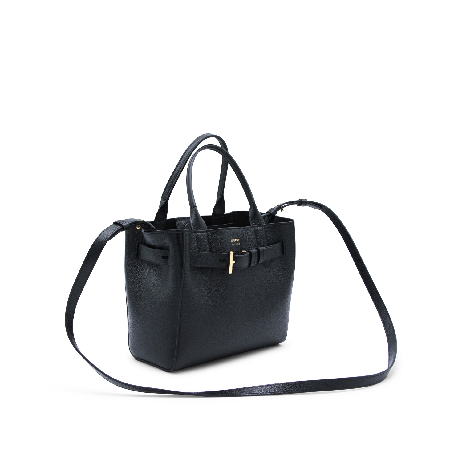 Black leather tote from Tom Ford featuring top handles, removable and adjustable shoulder strap, main compartment, strap with metal toggle closure, printed logo and gold tone hardware.