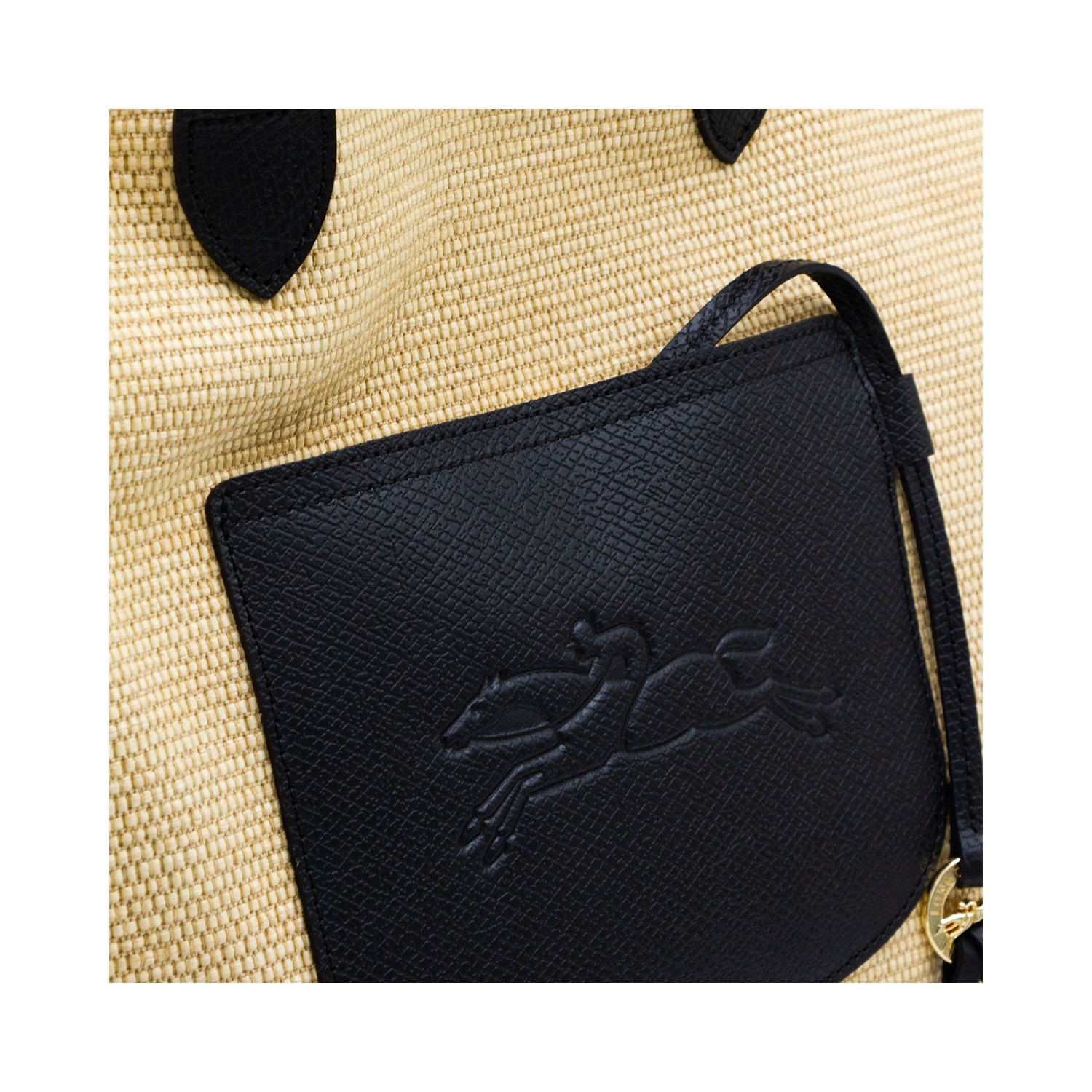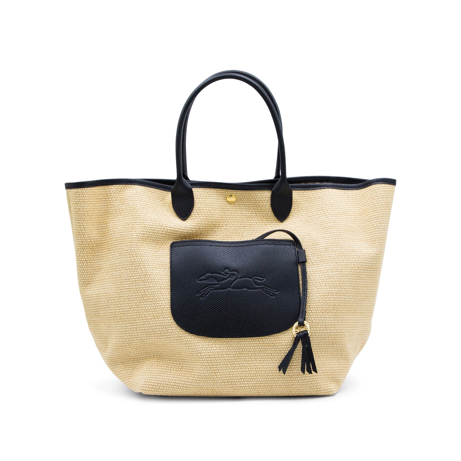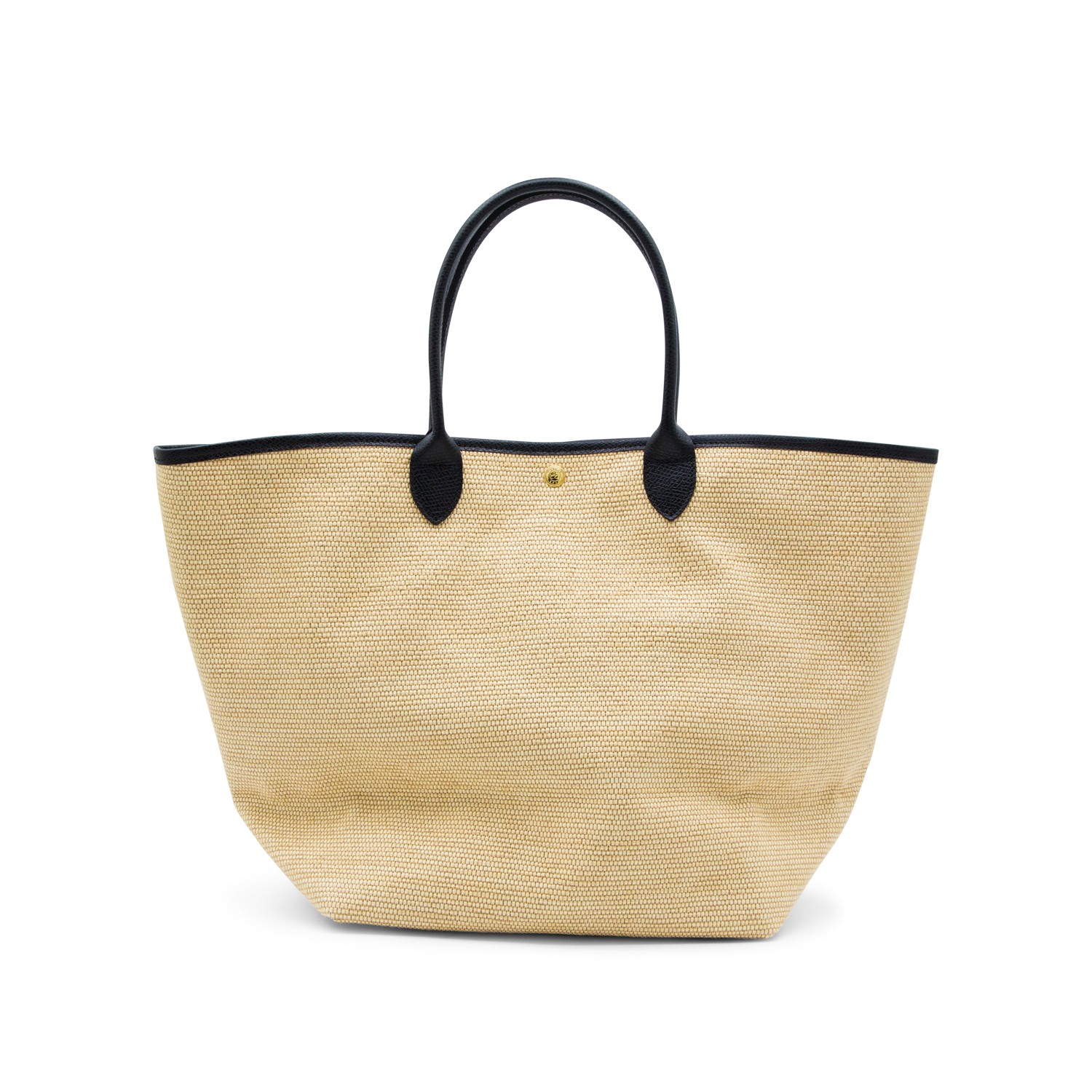 Beige and black Raffia Le Panier Pliage L totes from Longchamp featuring top handles, frontal logo, button fastening and pocket.