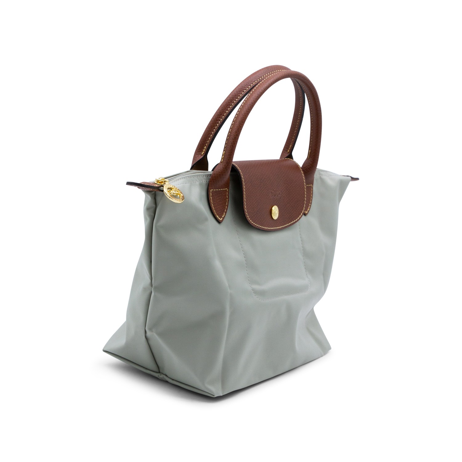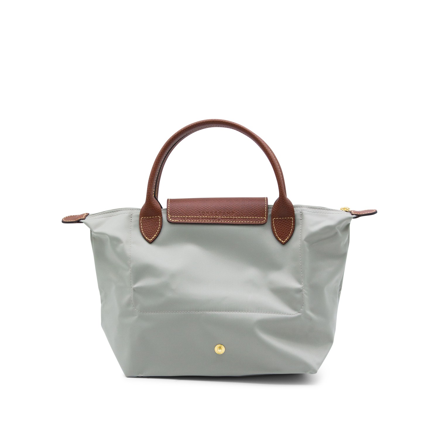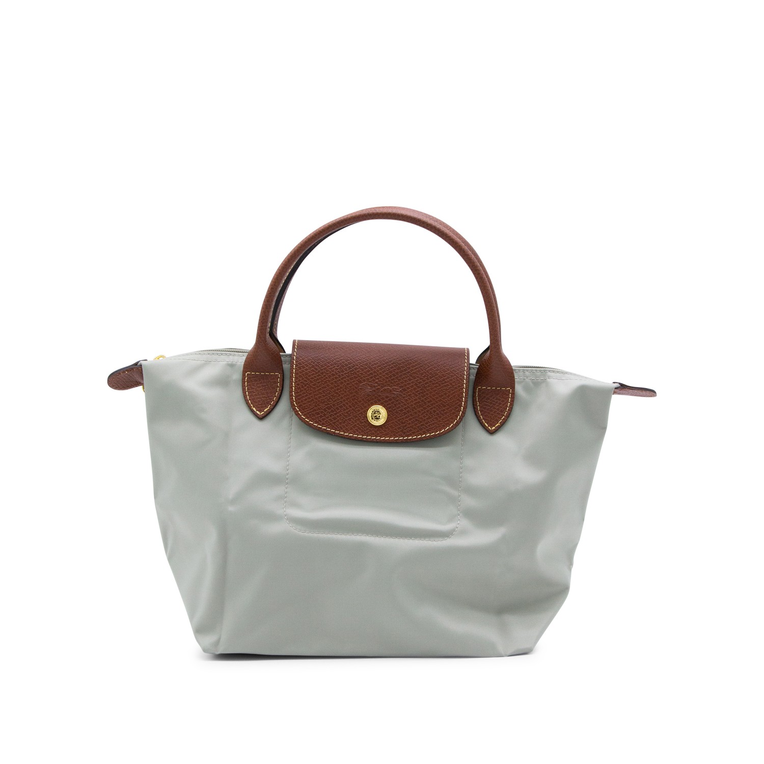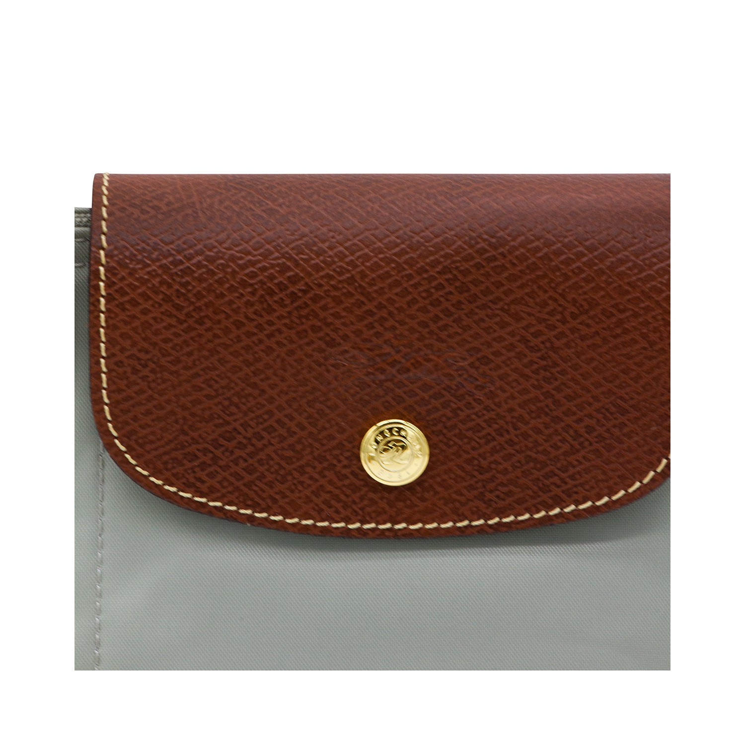 Grey canvas Le Pliage tote bag from Longchamp featuring round top handles, a foldover top with snap closure, a top zip fastening, foldable design, brown leather details, internal zipped pocket and gold-tone hardware.TE