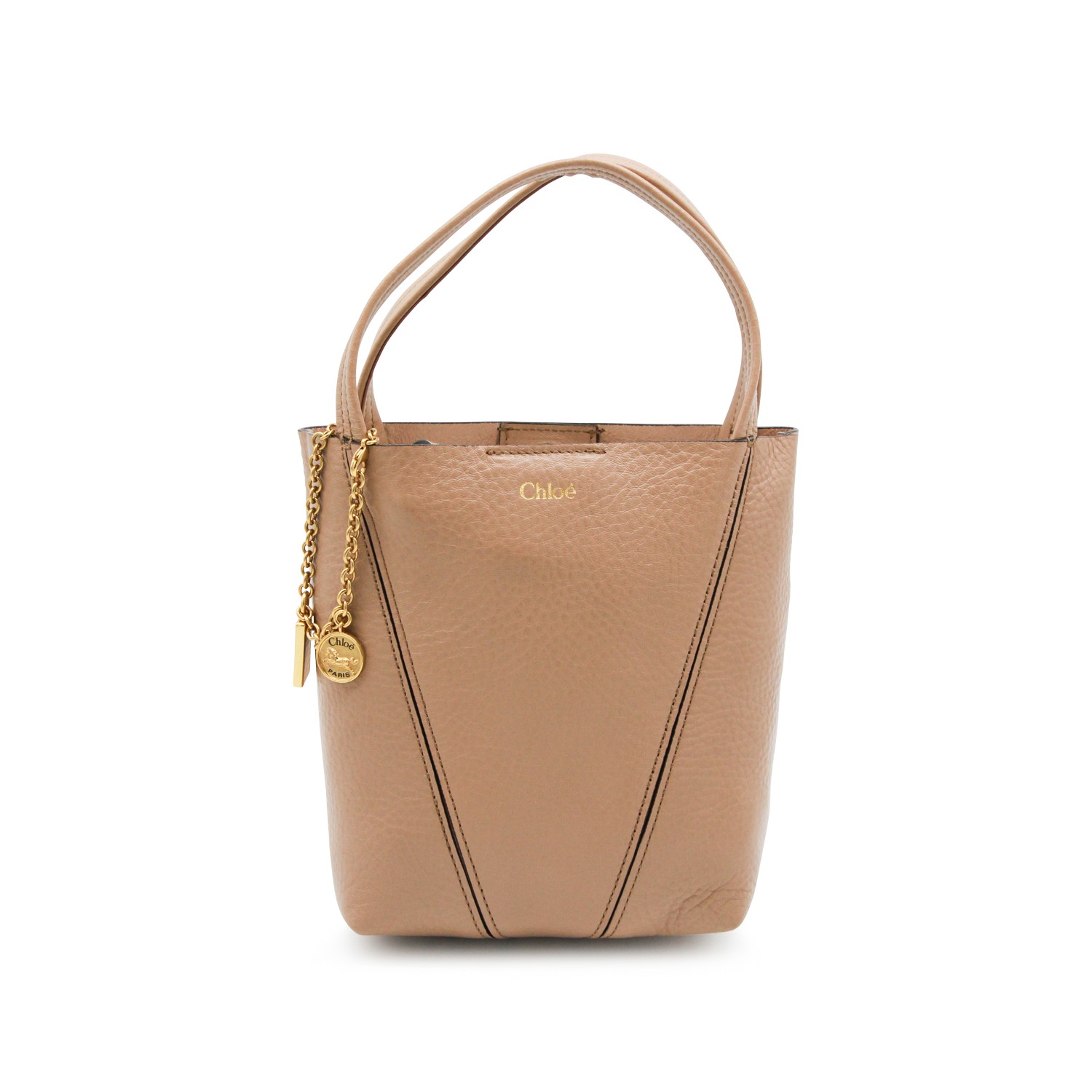 Beige leather ChloSpin tote from Chlofeaturing top handles, removable and adjustable shoulder strap, magnetic closure, main compartment and gold tone bracelet with charms.