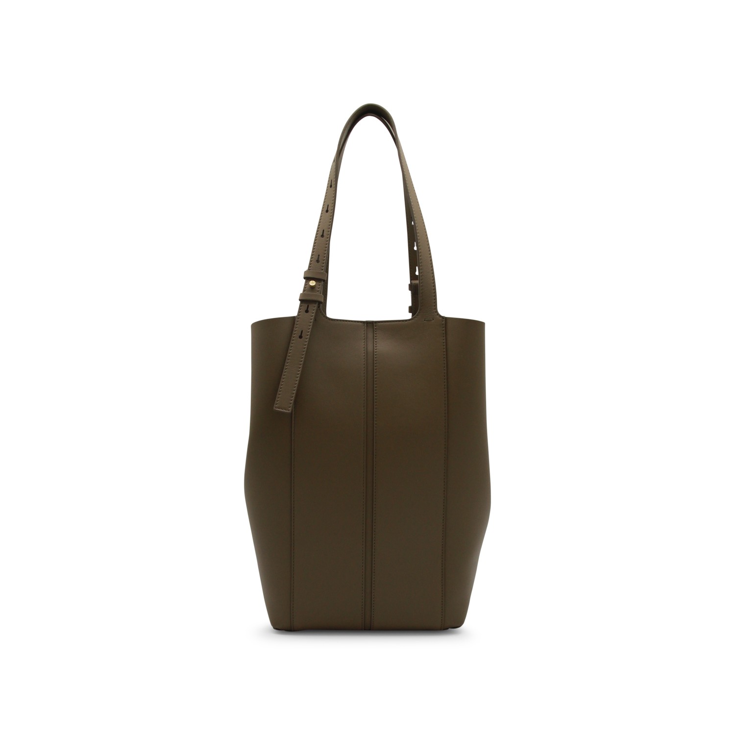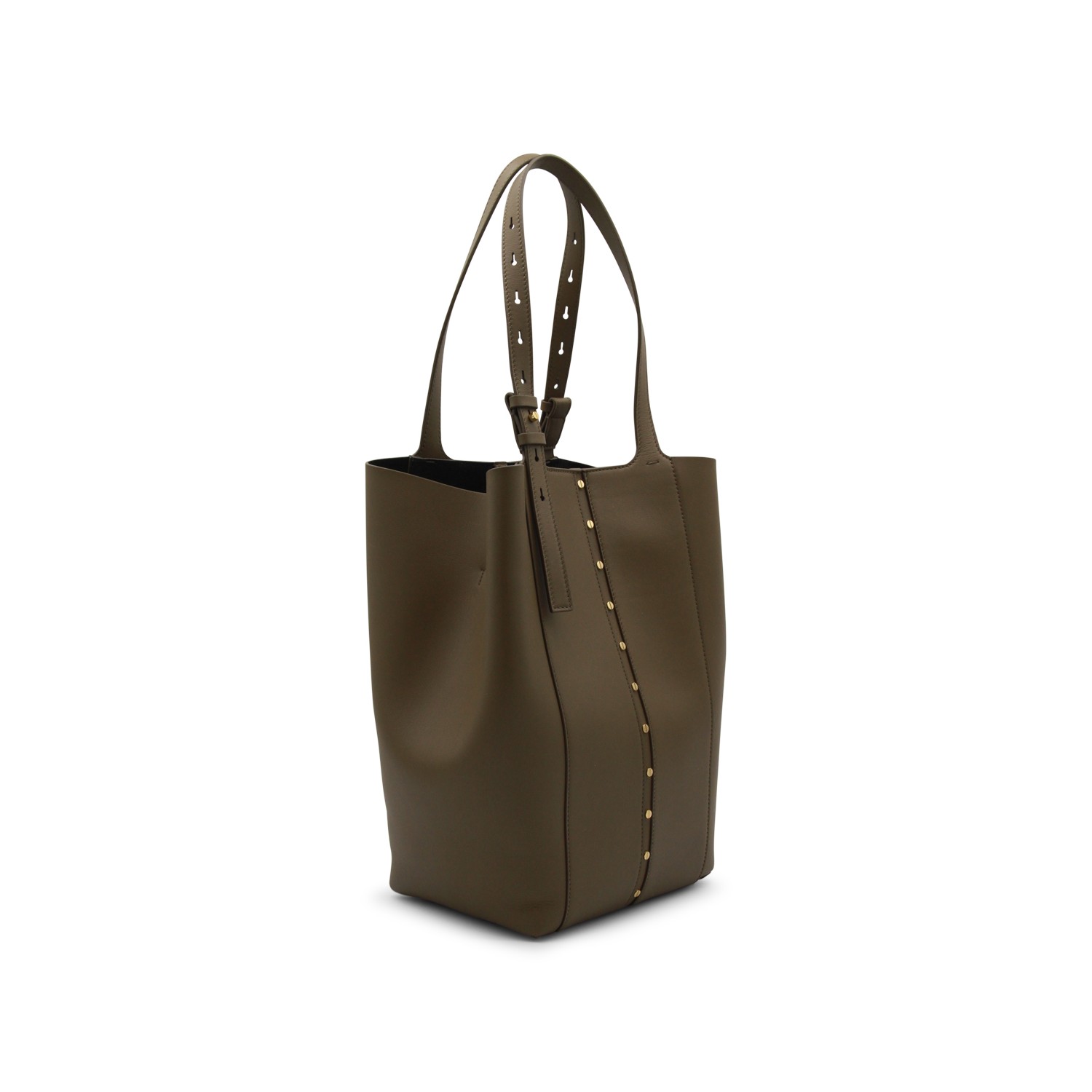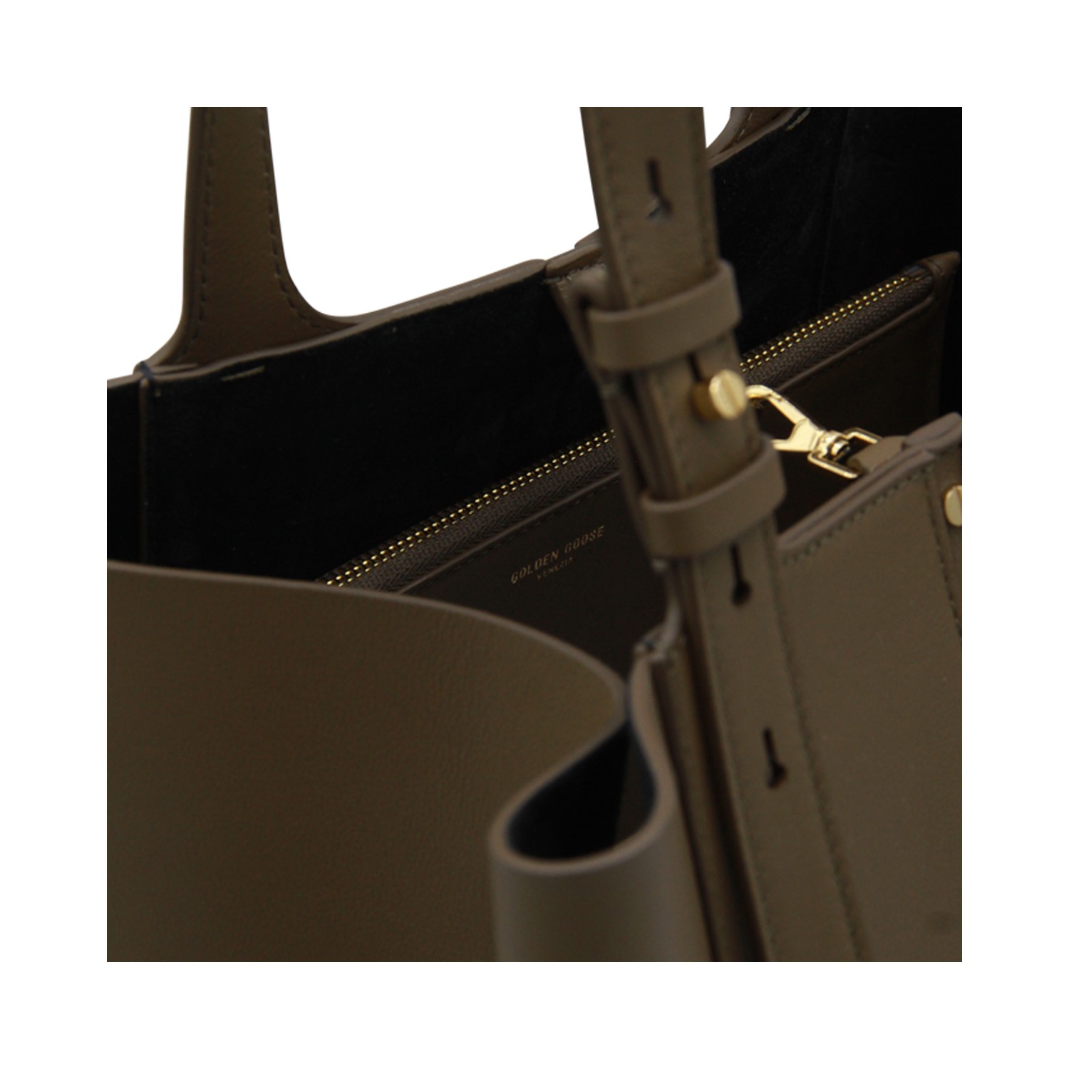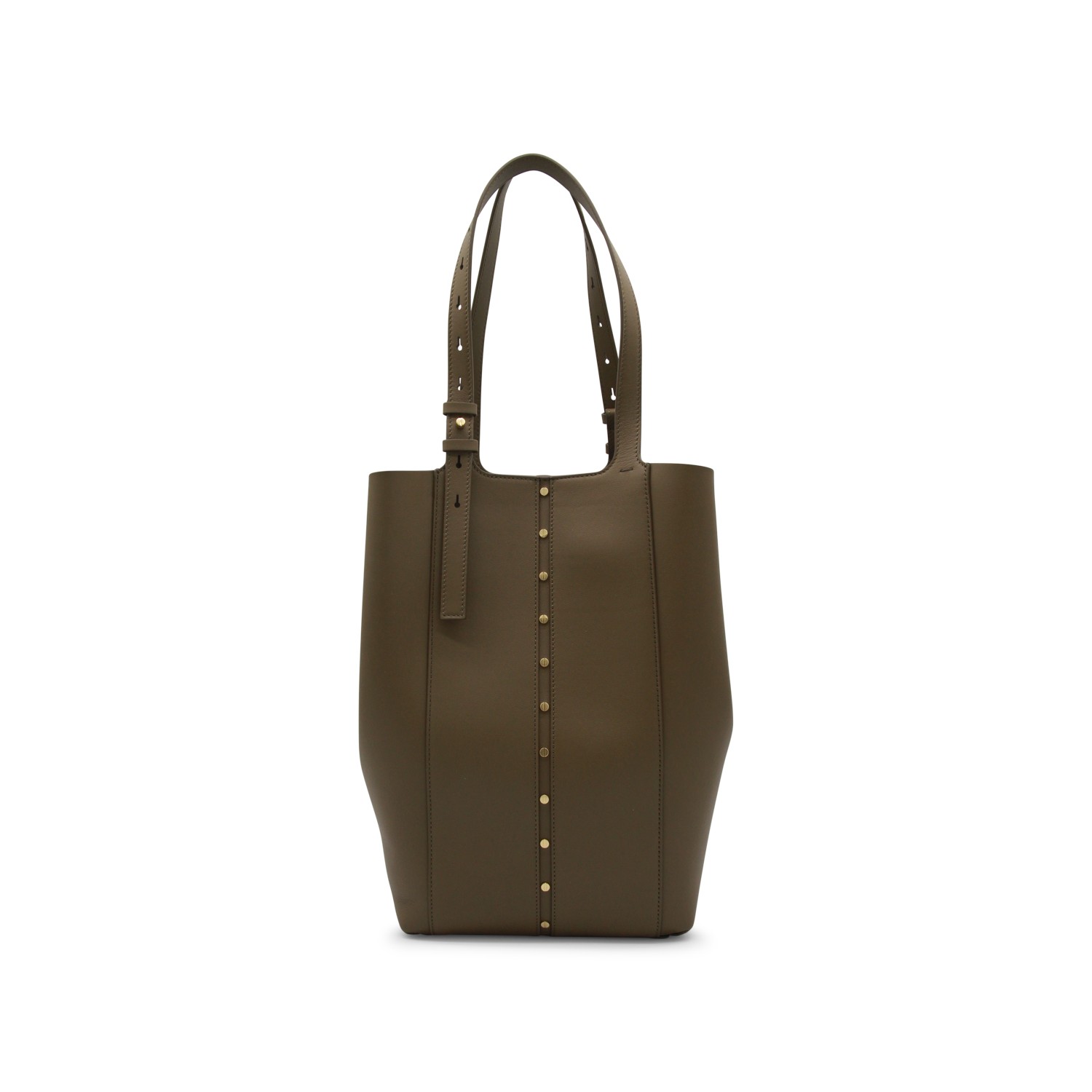 Khaki leather North South tote from Golden Goose featuring top adjustable handles, side closures, godl tone studs, internal pocket and inner bag.