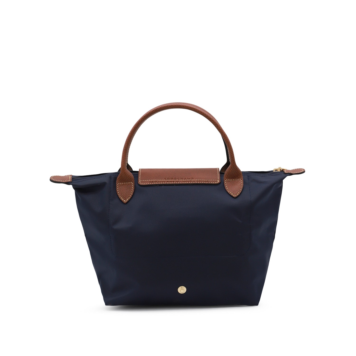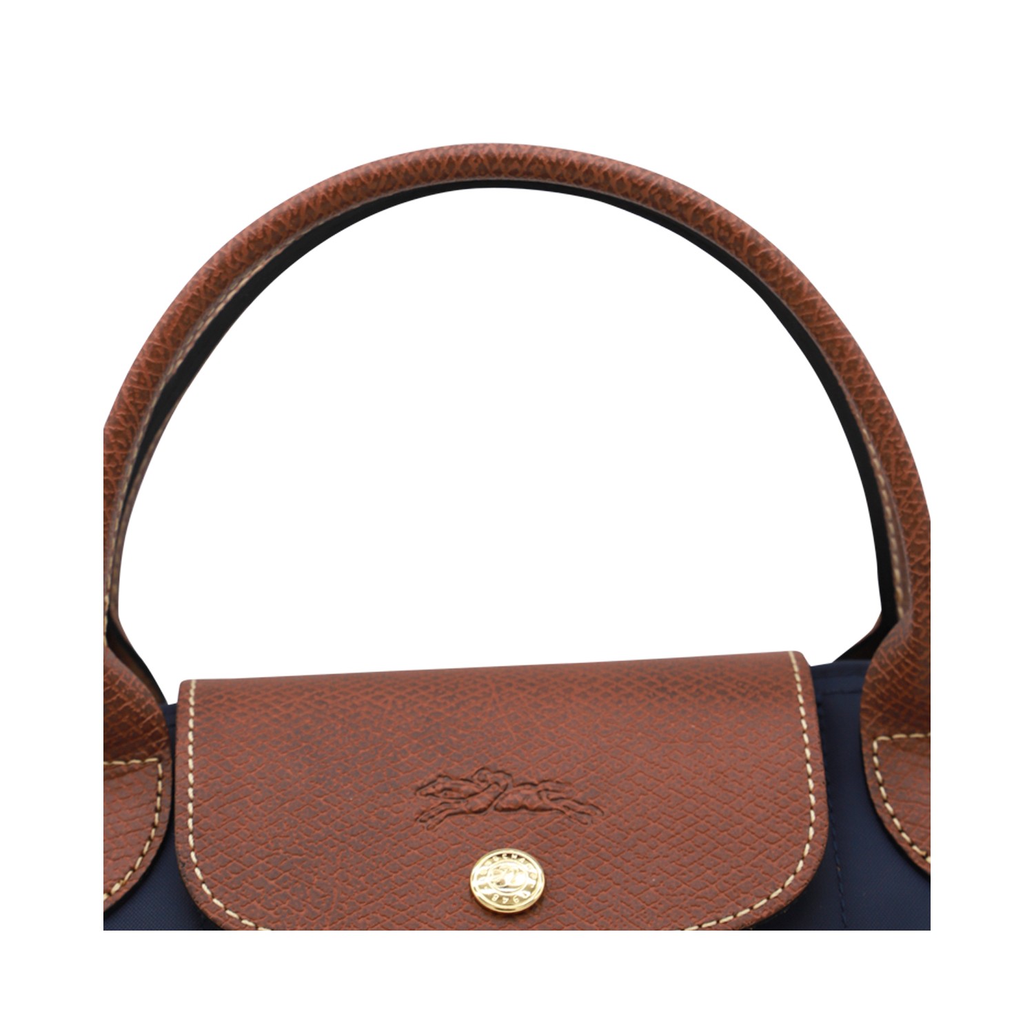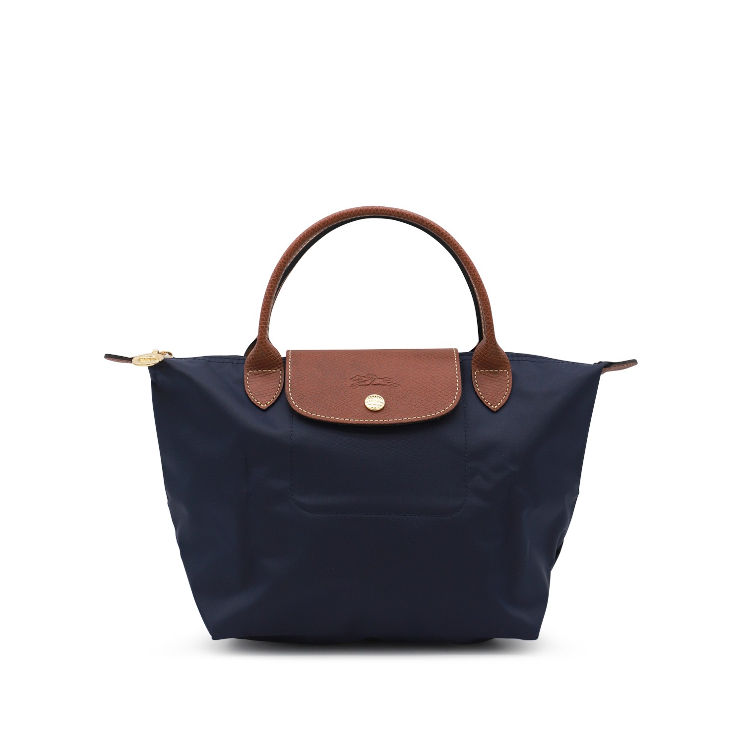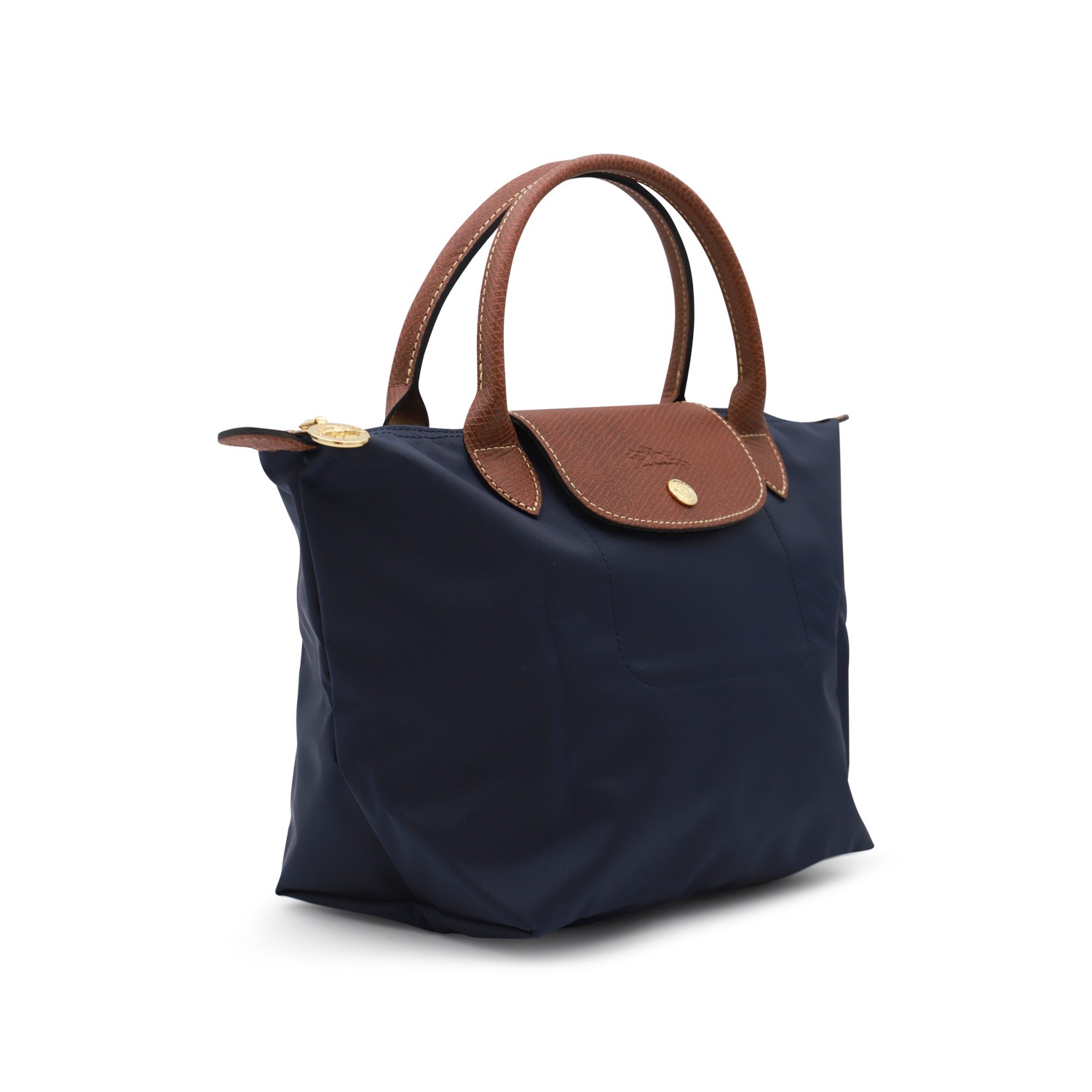 Blue canvas Le Pliage S tote bag from Longchamp featuring round top handles, a foldover top with snap closure, a top zip fastening and gold-tone hardware.