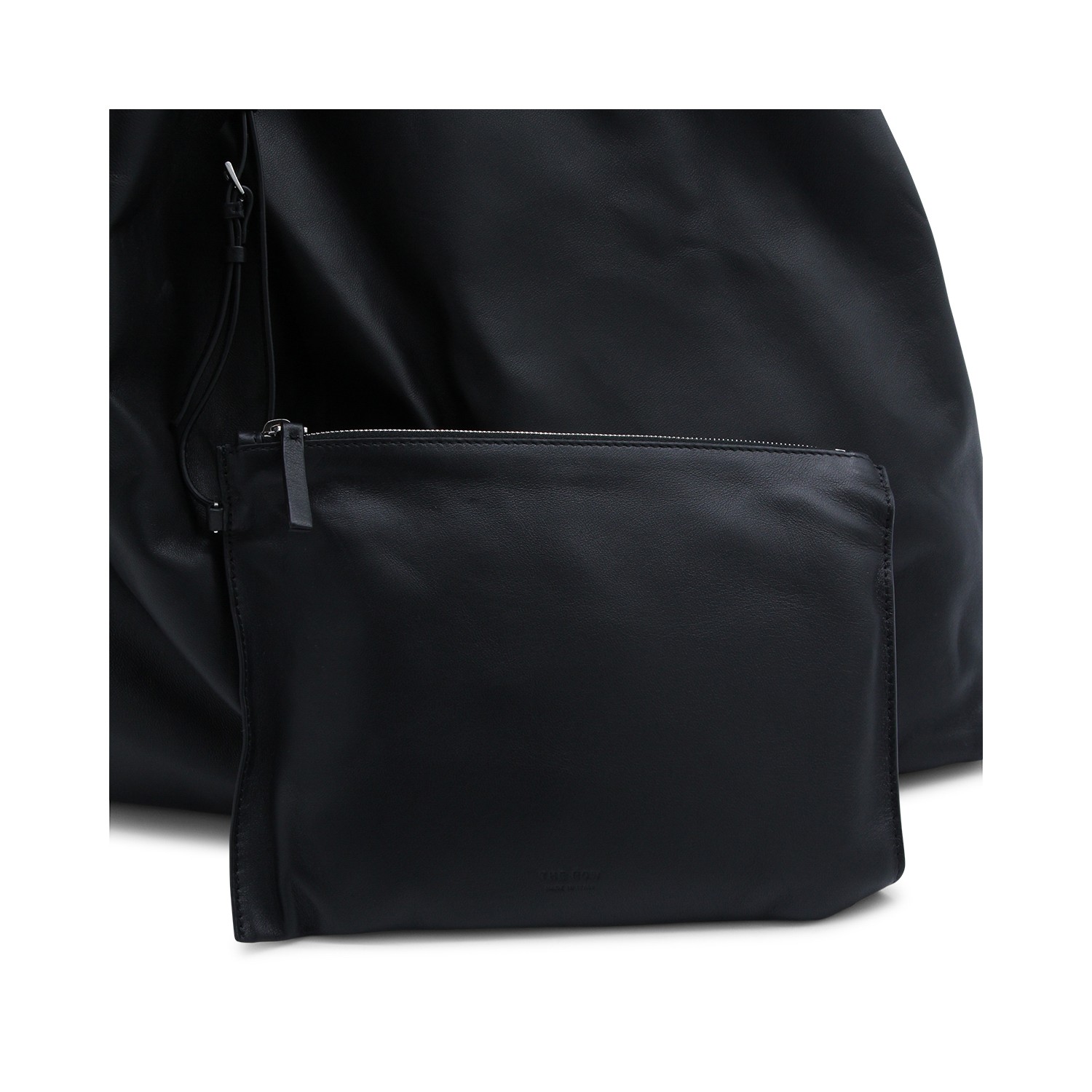 Black leather New Bindle tote from The Row featuring top draped handle, central stitching, main compartment and detachable zipped case.