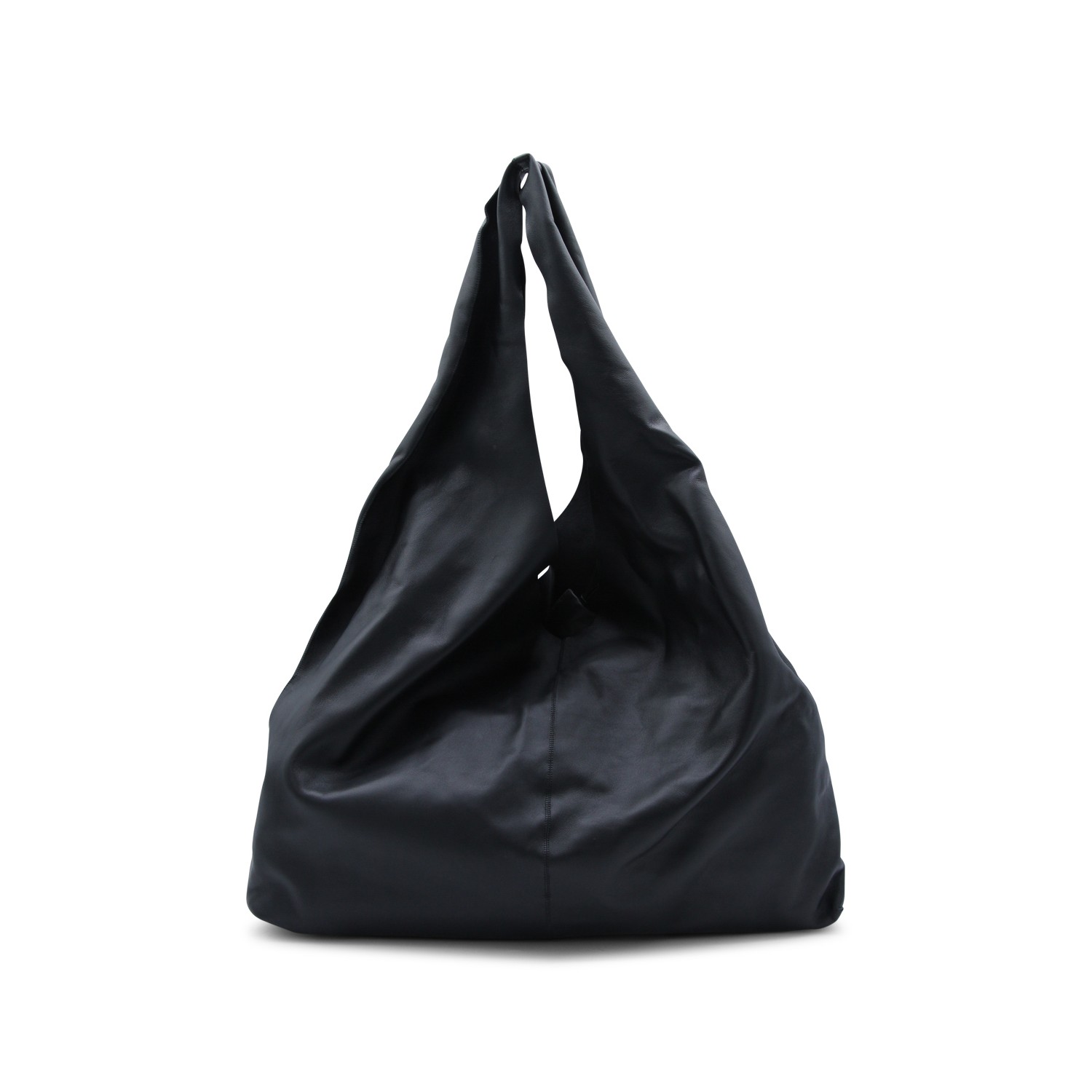 Black leather New Bindle tote from The Row featuring top draped handle, central stitching, main compartment and detachable zipped case.