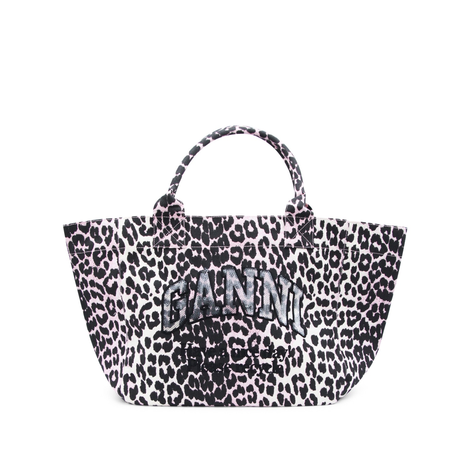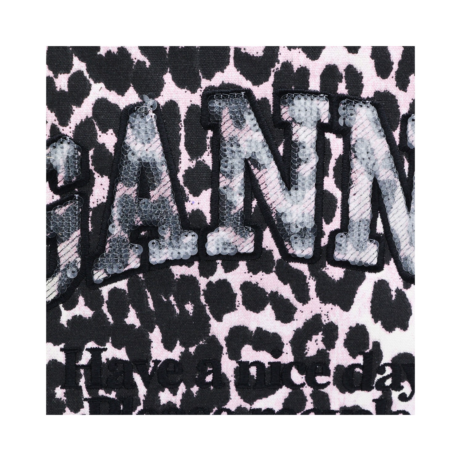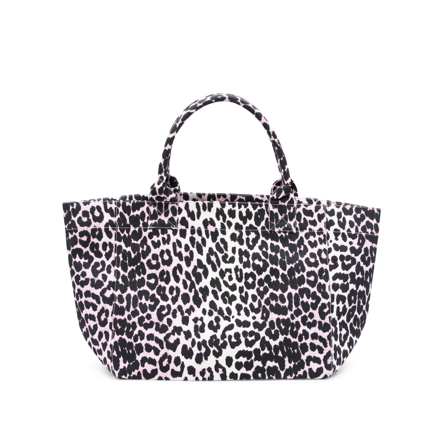 Leopard cotton tote from Ganni featuring top handles, leopard print, stitched logo, main compartment and internal zipped pocket.