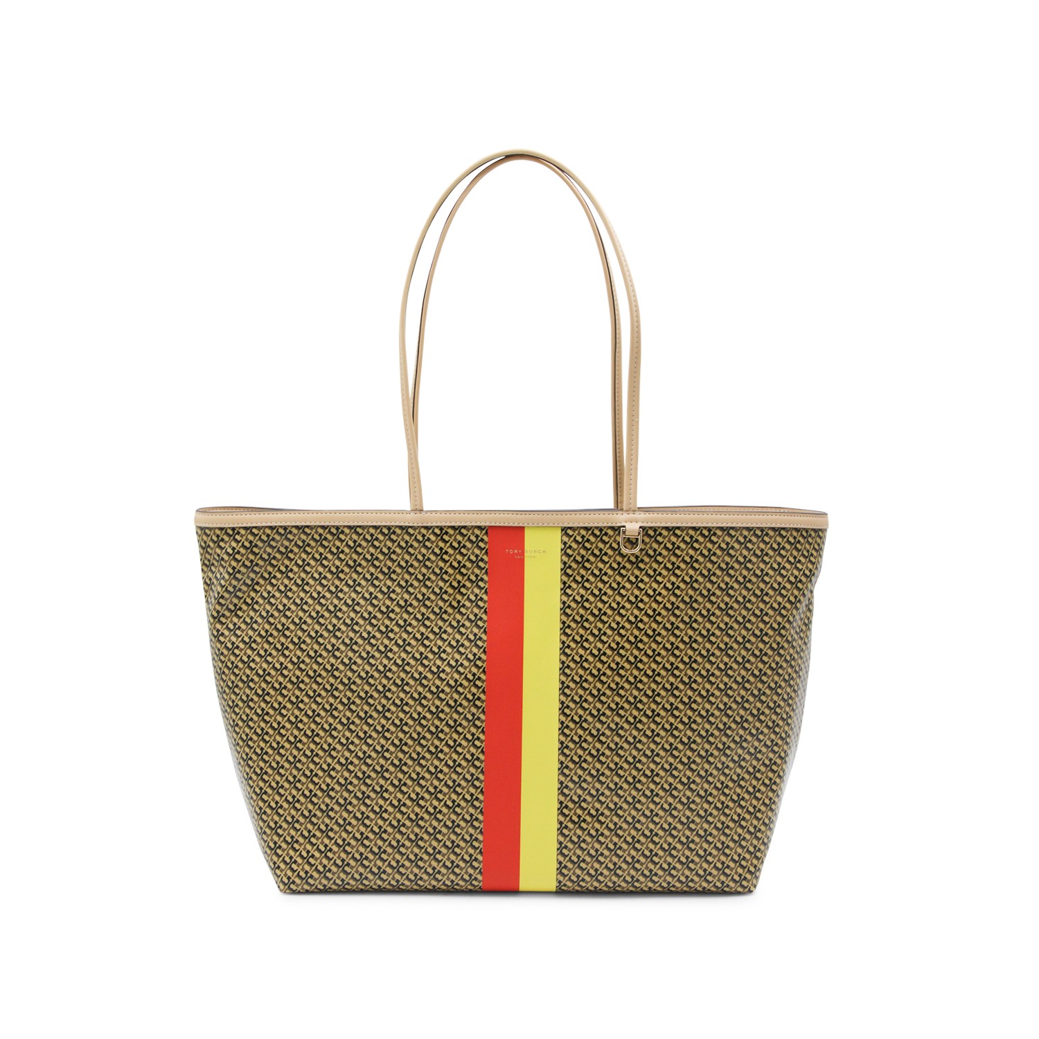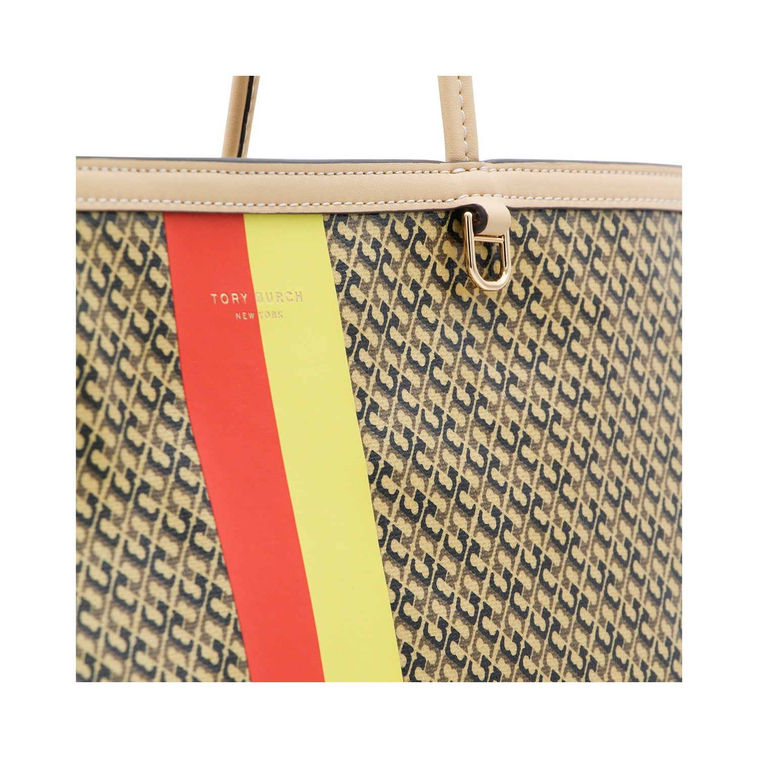 Multicolor tote from Tory Burch featuring top handles, all-over logo print, frontal stripes detail and main compartment.
