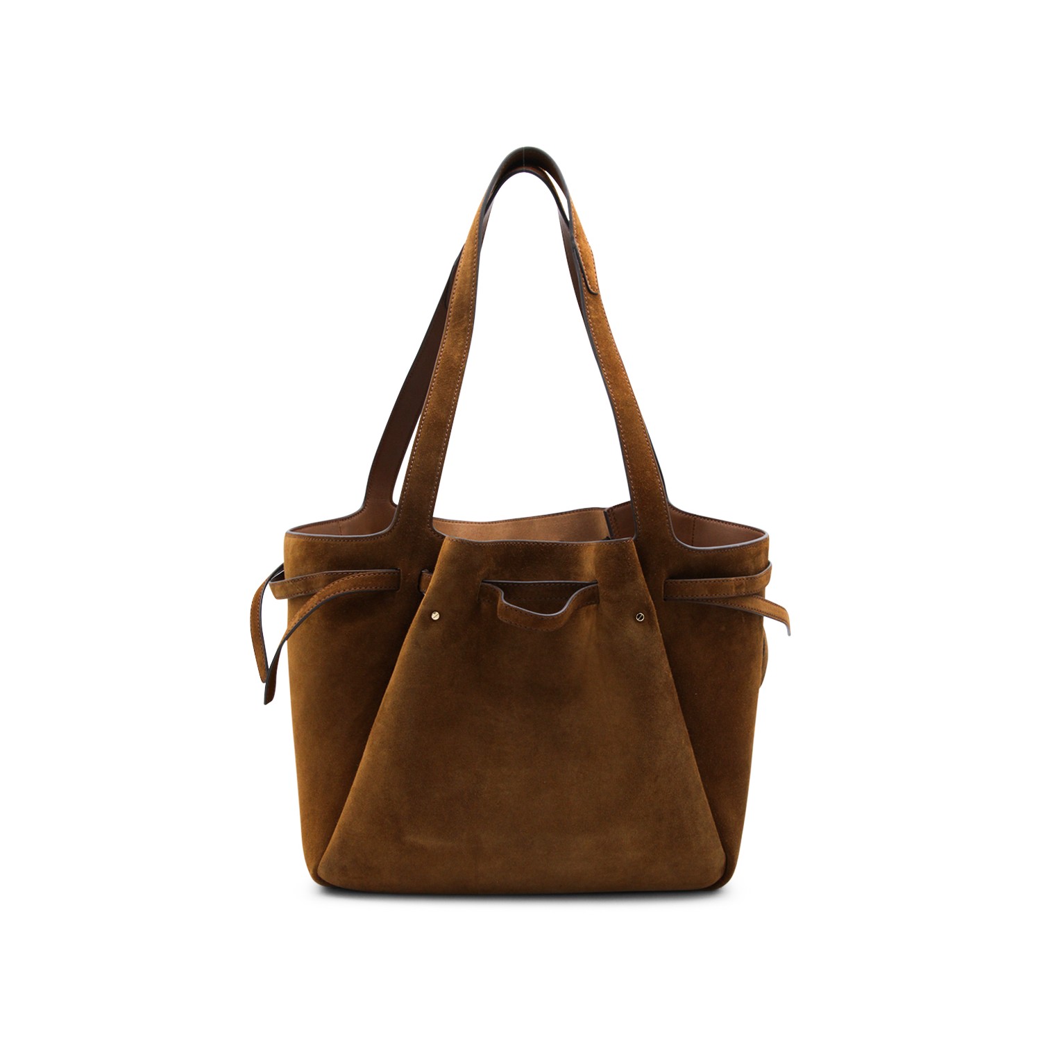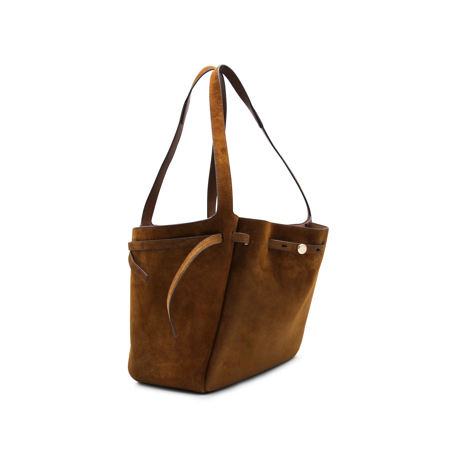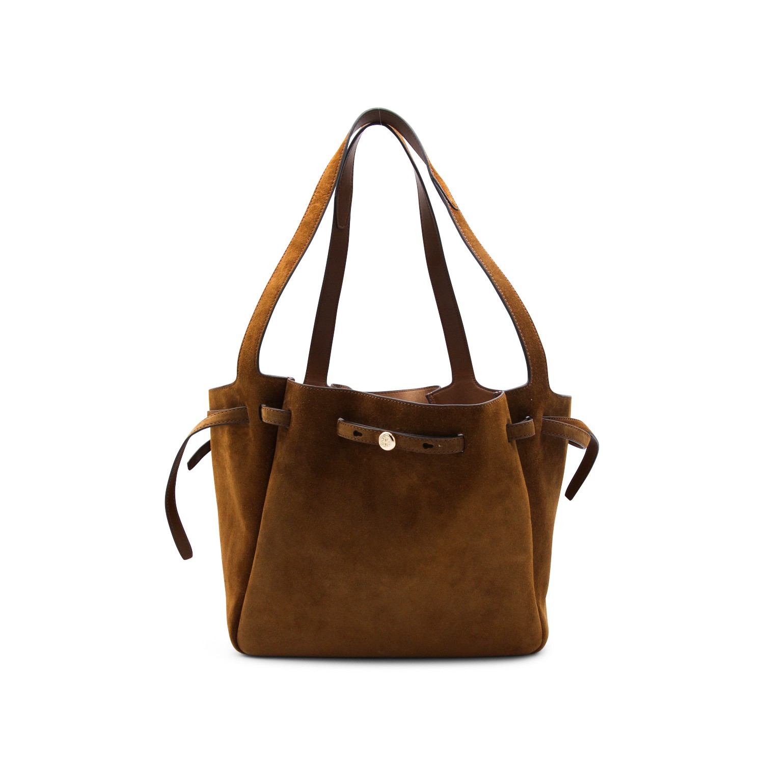 Brown leather tote from Tory Burch featuring top handles, drawstrings fastening, suede, main compartment and inside pocket.