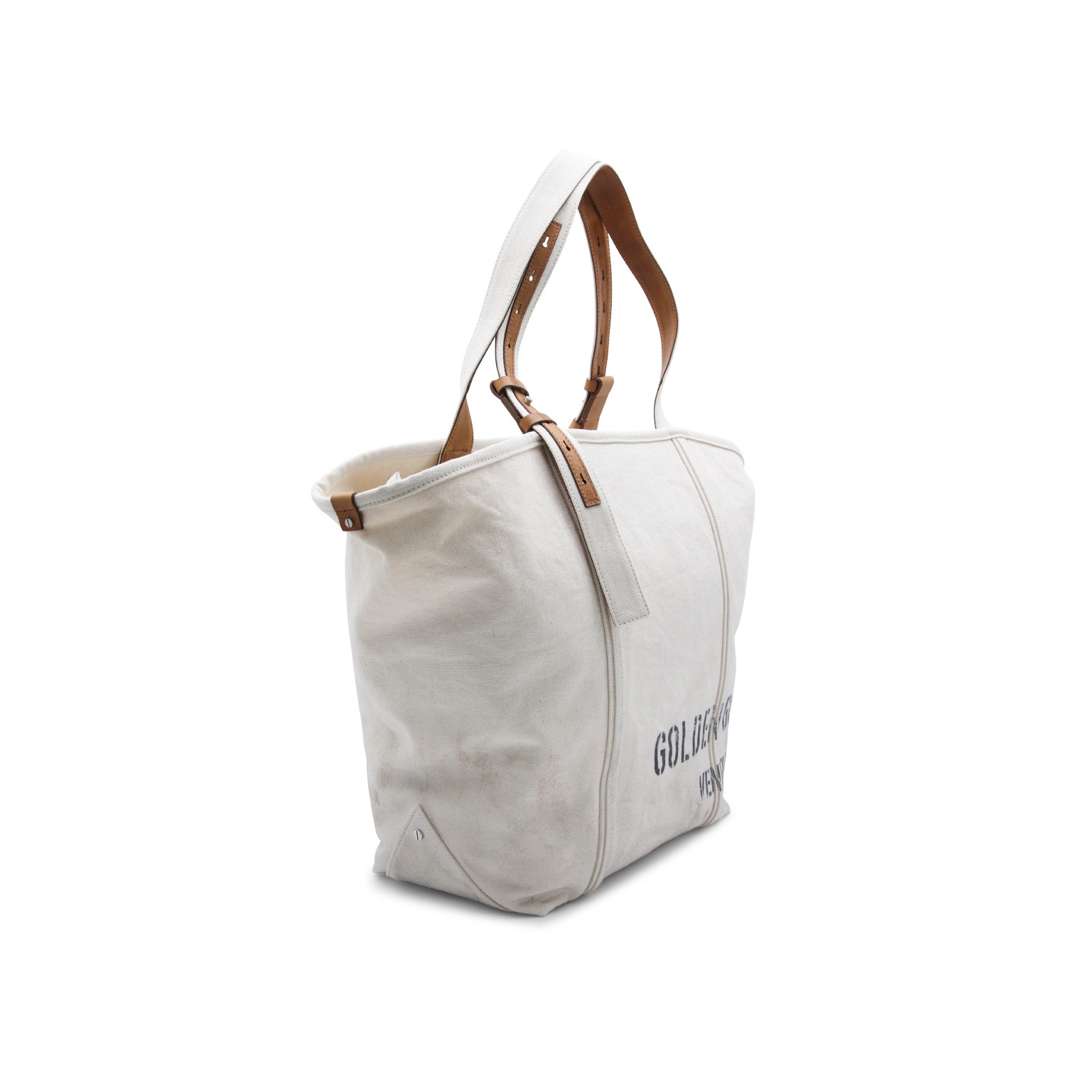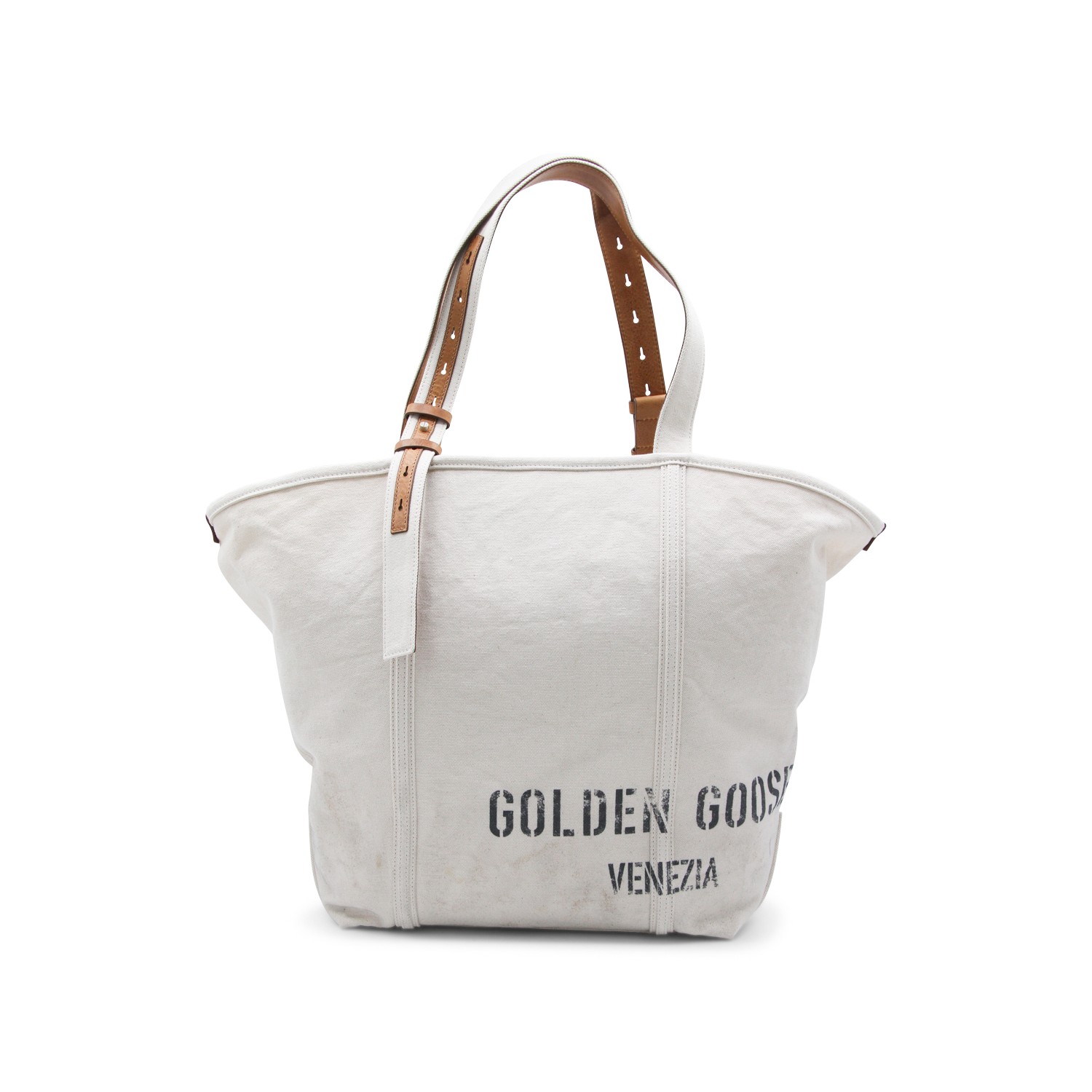Beige cotton tote from Golden Goose featuring adjustable handles, big logo print, upper fastening, main comparmtent and pocket.