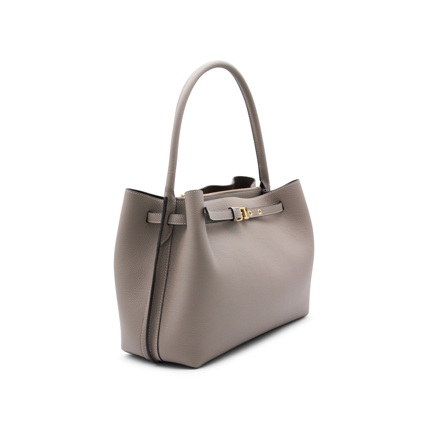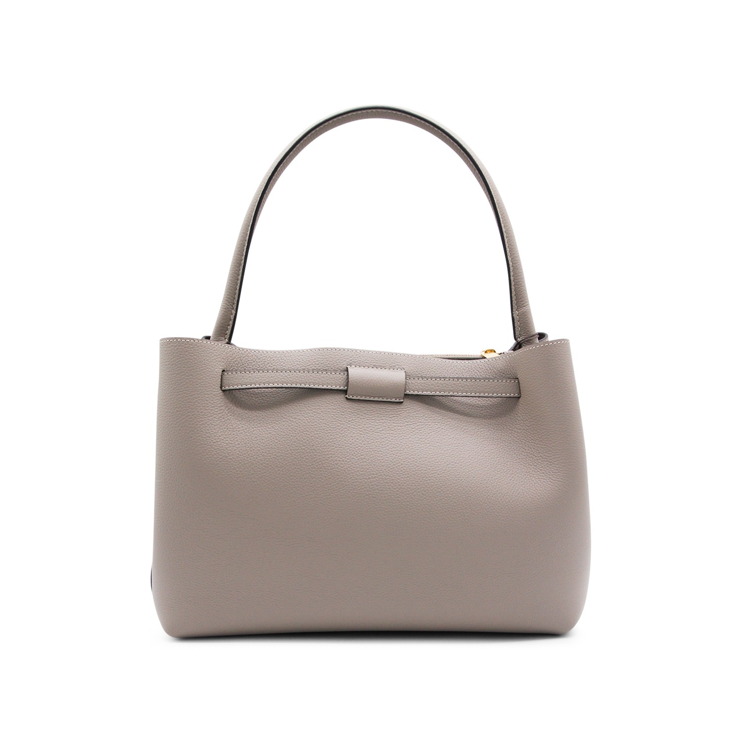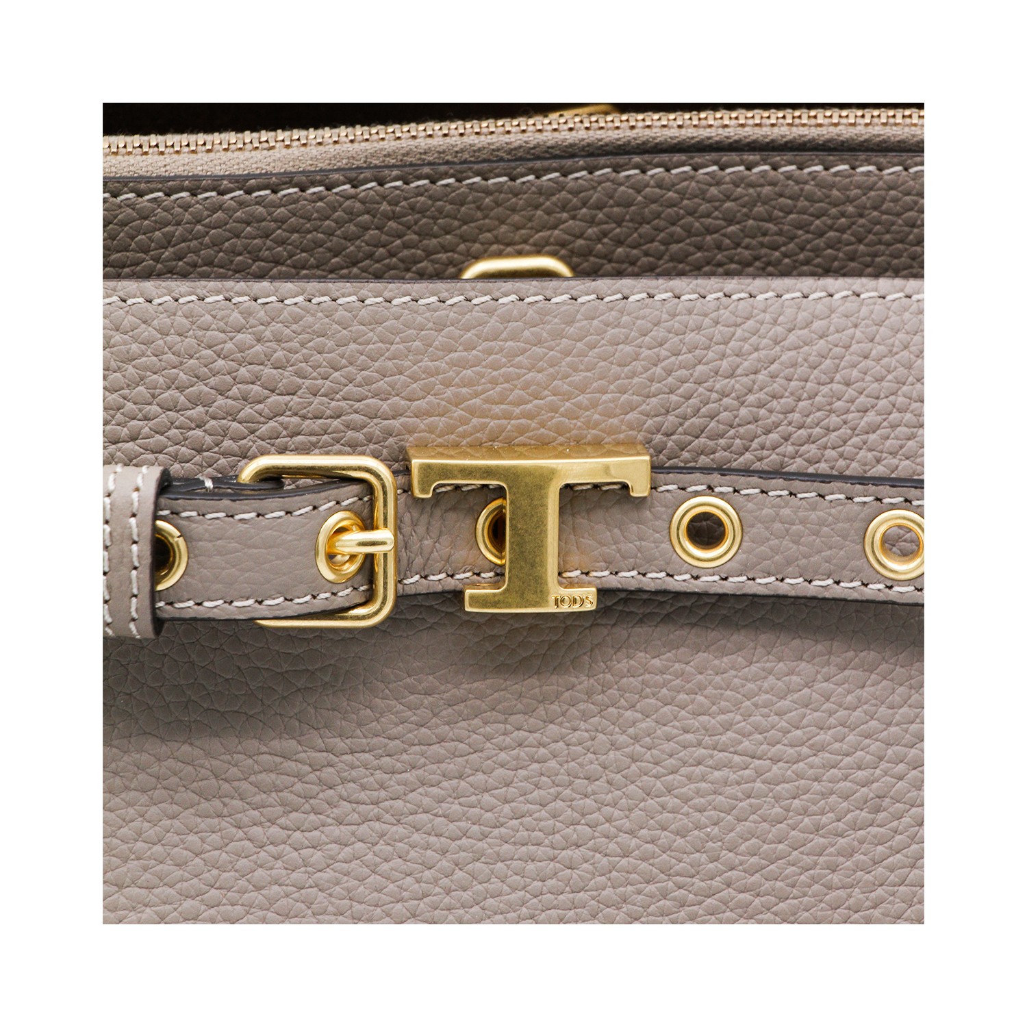 Grey leather totes from Tod's featuring top handle, upper fastening, gold tone hardware frontal belt with gold tone hardware detail and inside pocket.