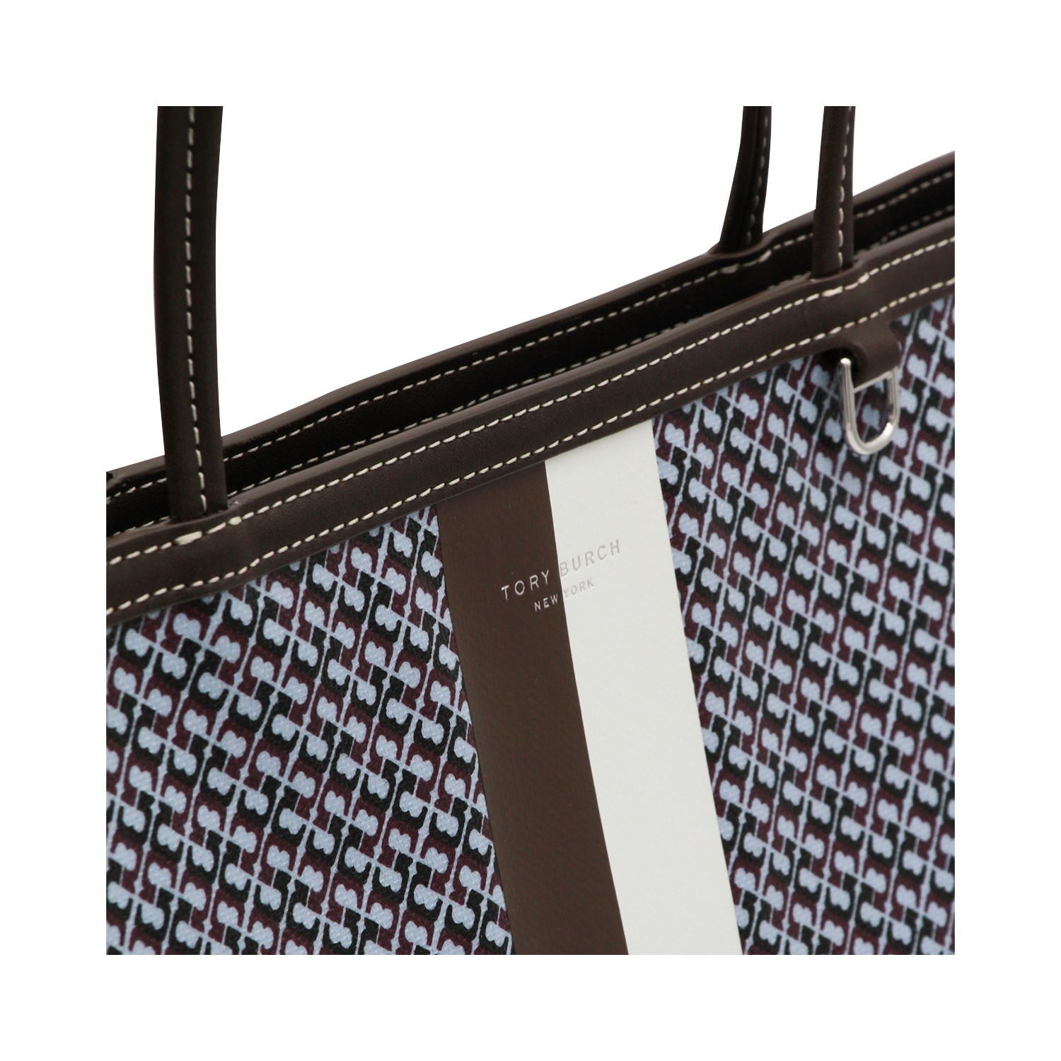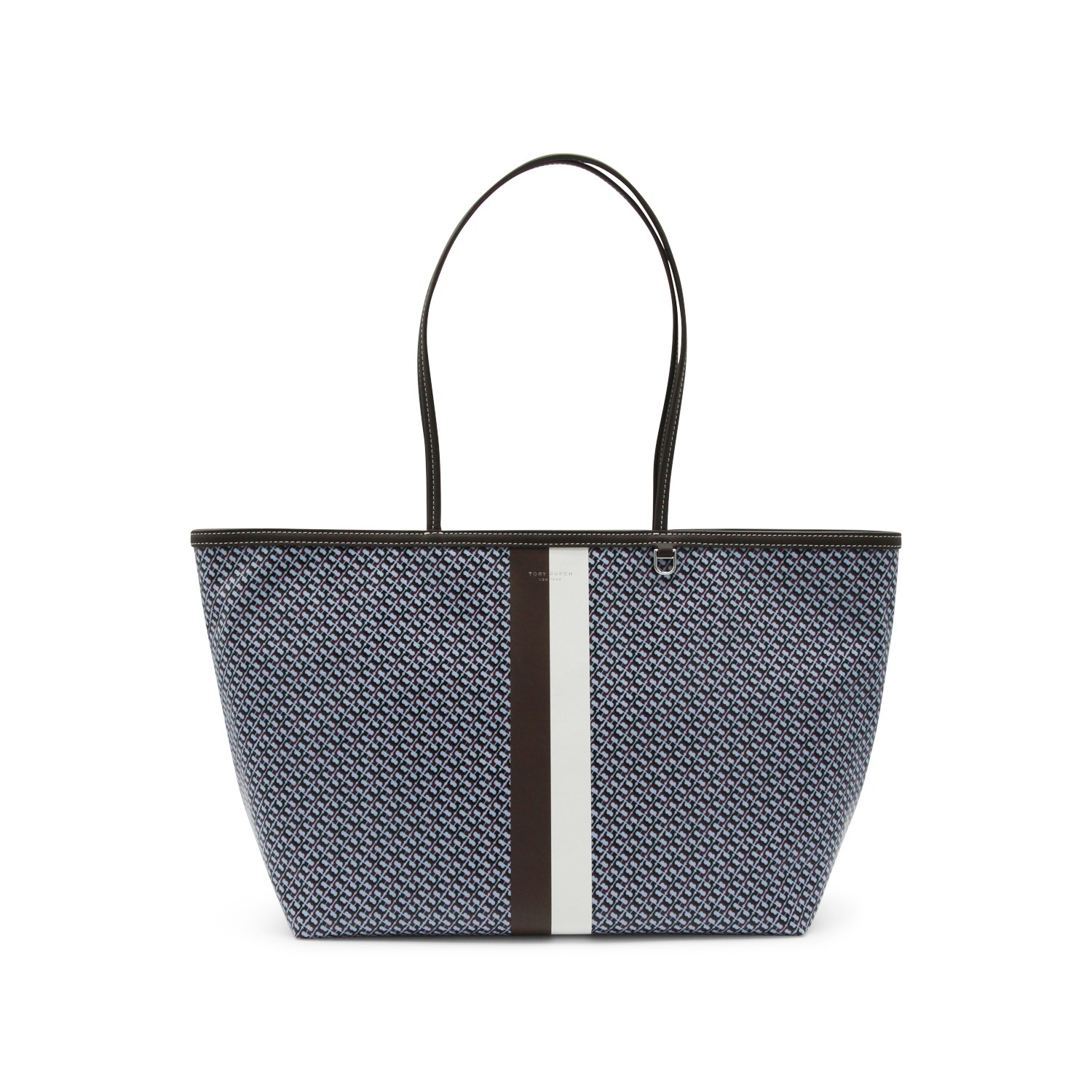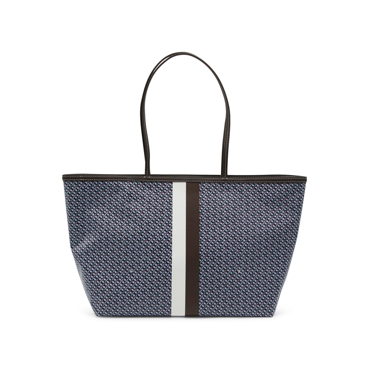 Blue leather Racer tote from Tory Burch featuring top handles, clip closure, main compartment and internal zipped pocket.