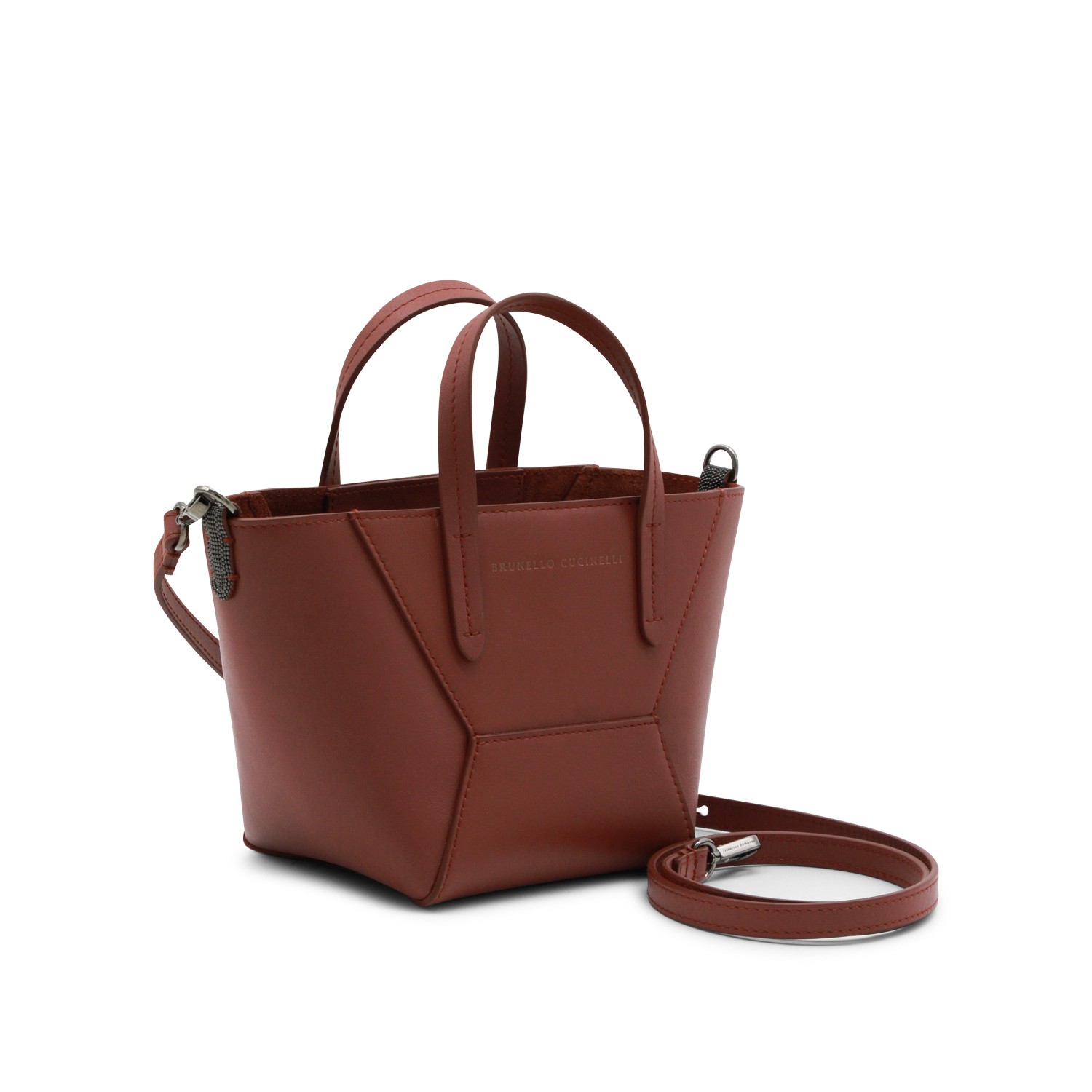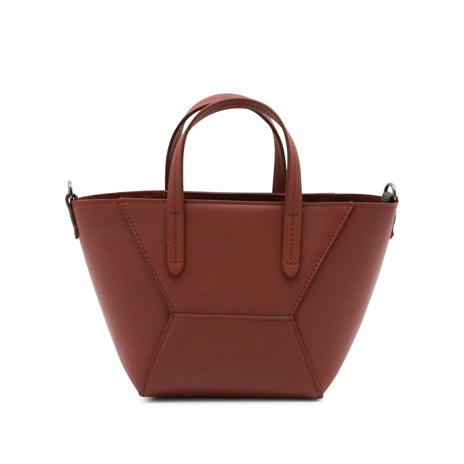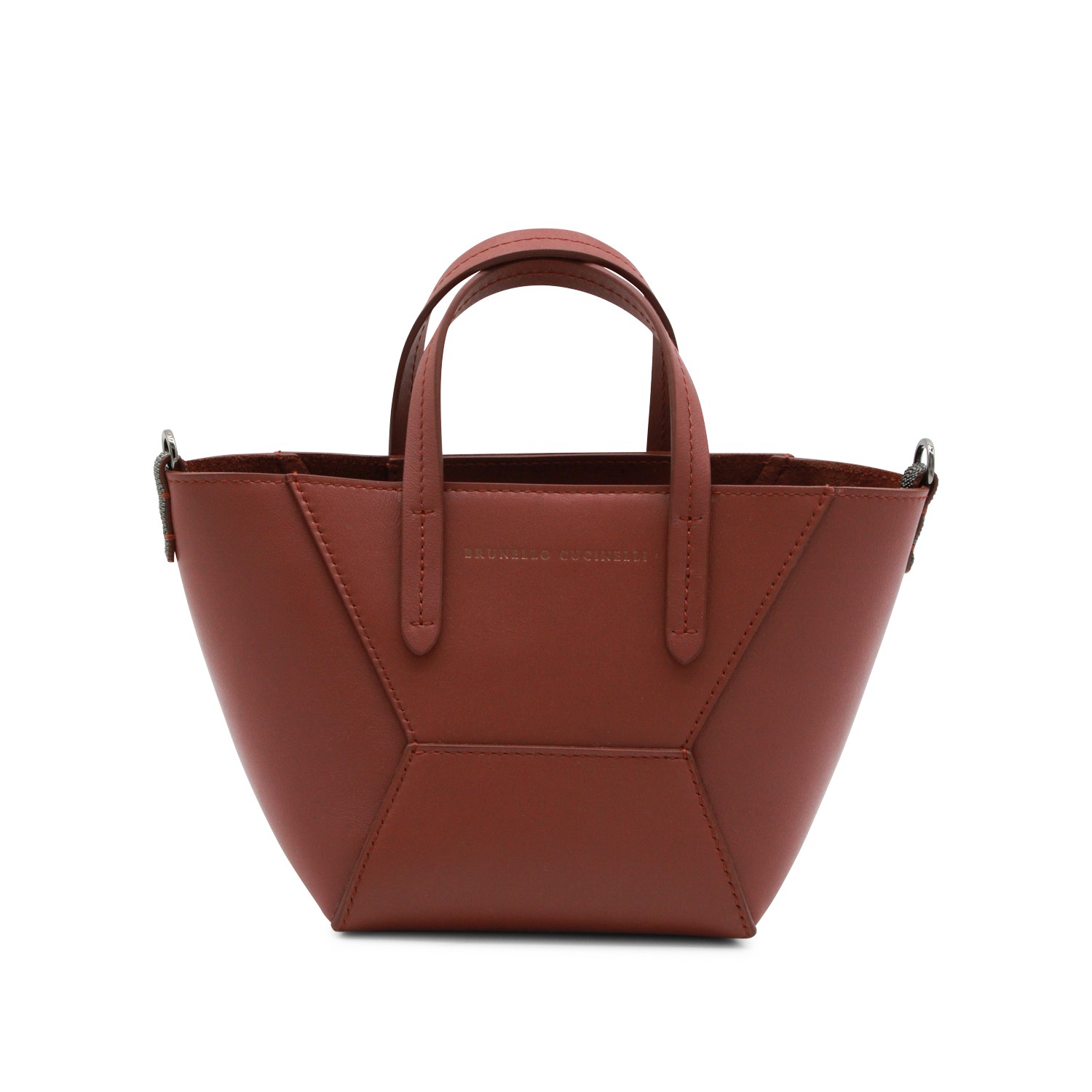 Brown leather tote bag from Brunello Cucinelli featuring double straps, main compartment, logo details, adjustable and detachable shoulder strap with gold tone metal hardware.