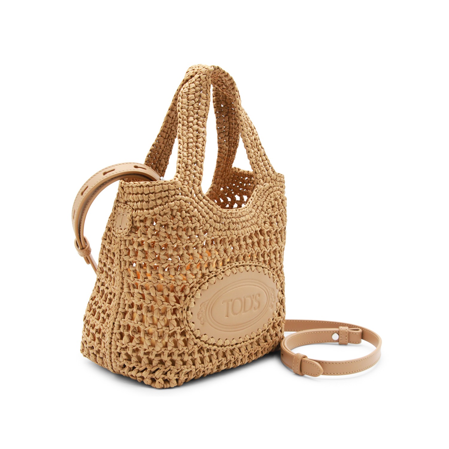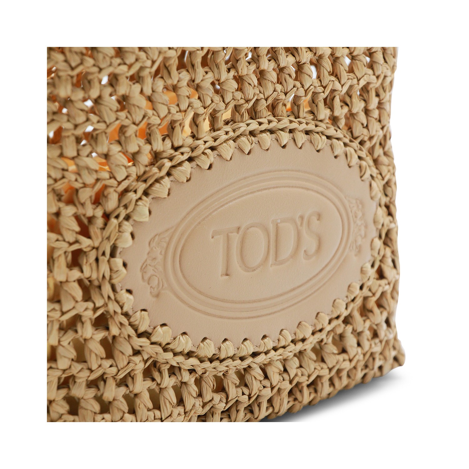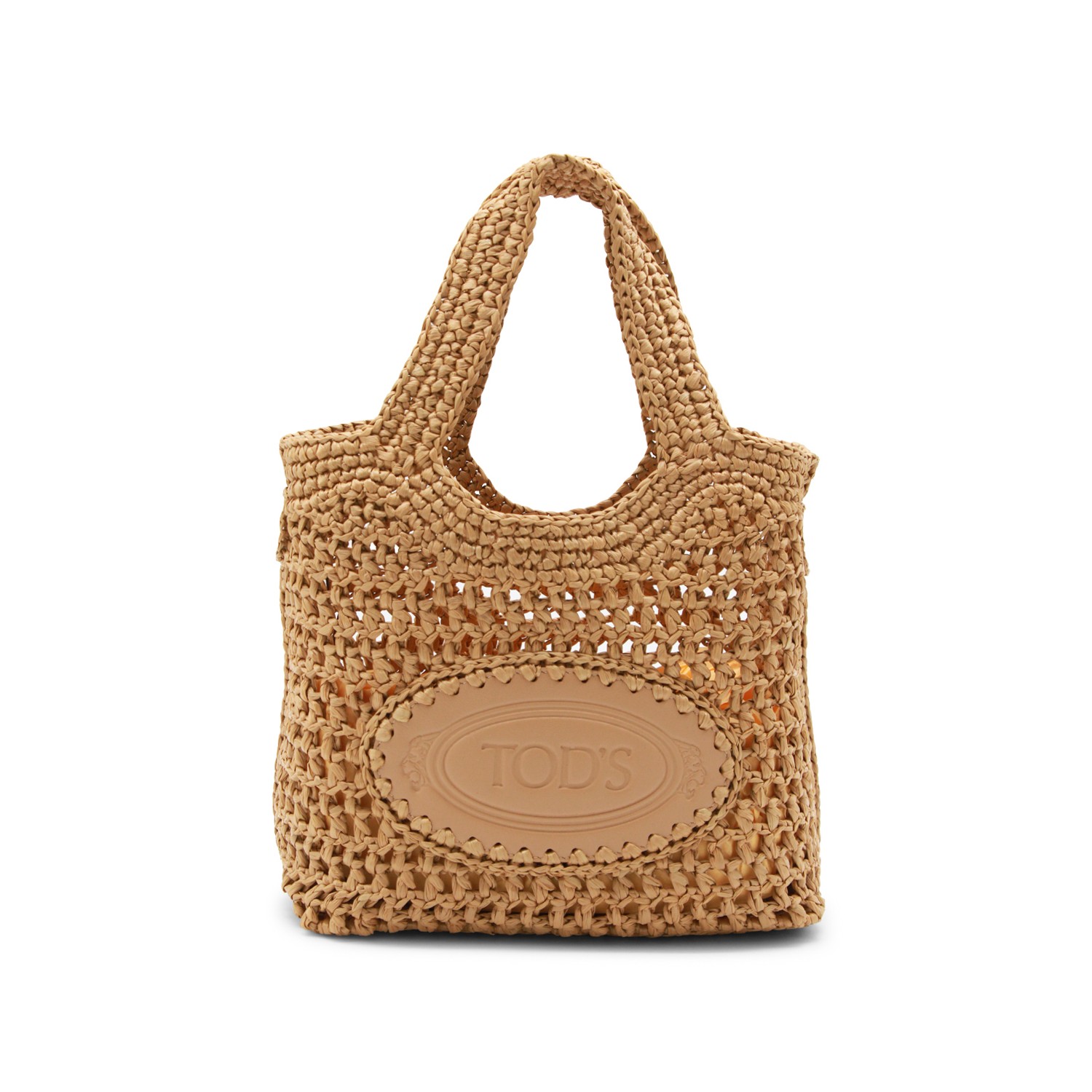 Natural raffia tote from Tod's featuring top handles, leather insert with logo, handcrafted crochet, zip fastening and main compartment.