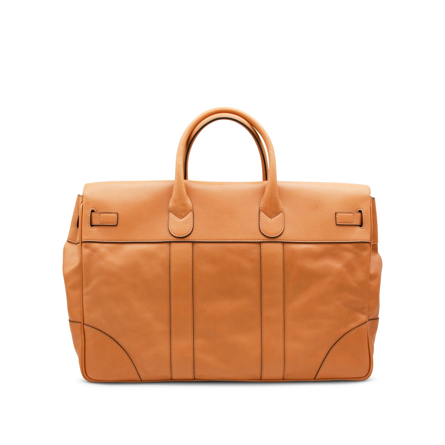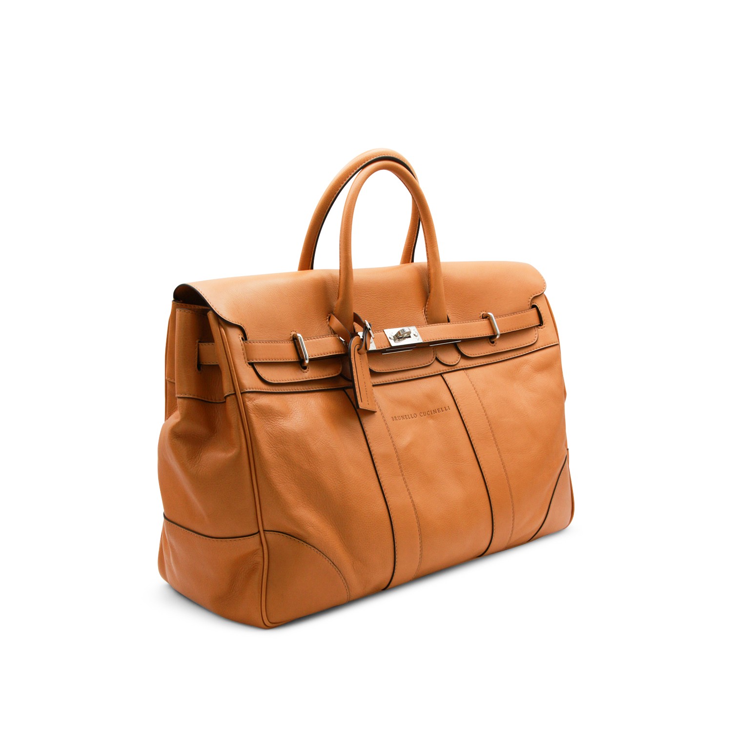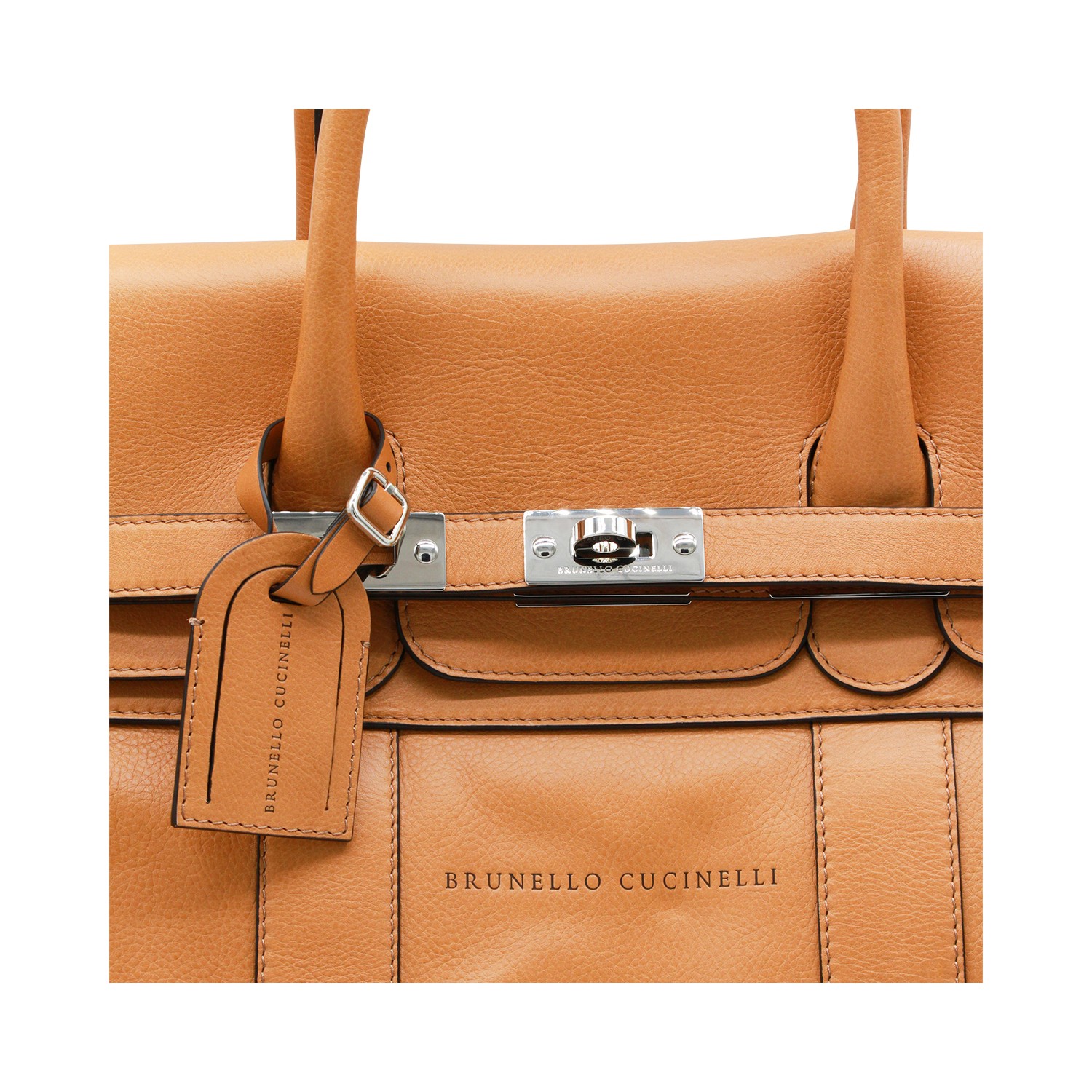 Brown leather bag from Brunello Cucinelli featuring top handles, frontal fastening, silver tone hardware and single compartment.
