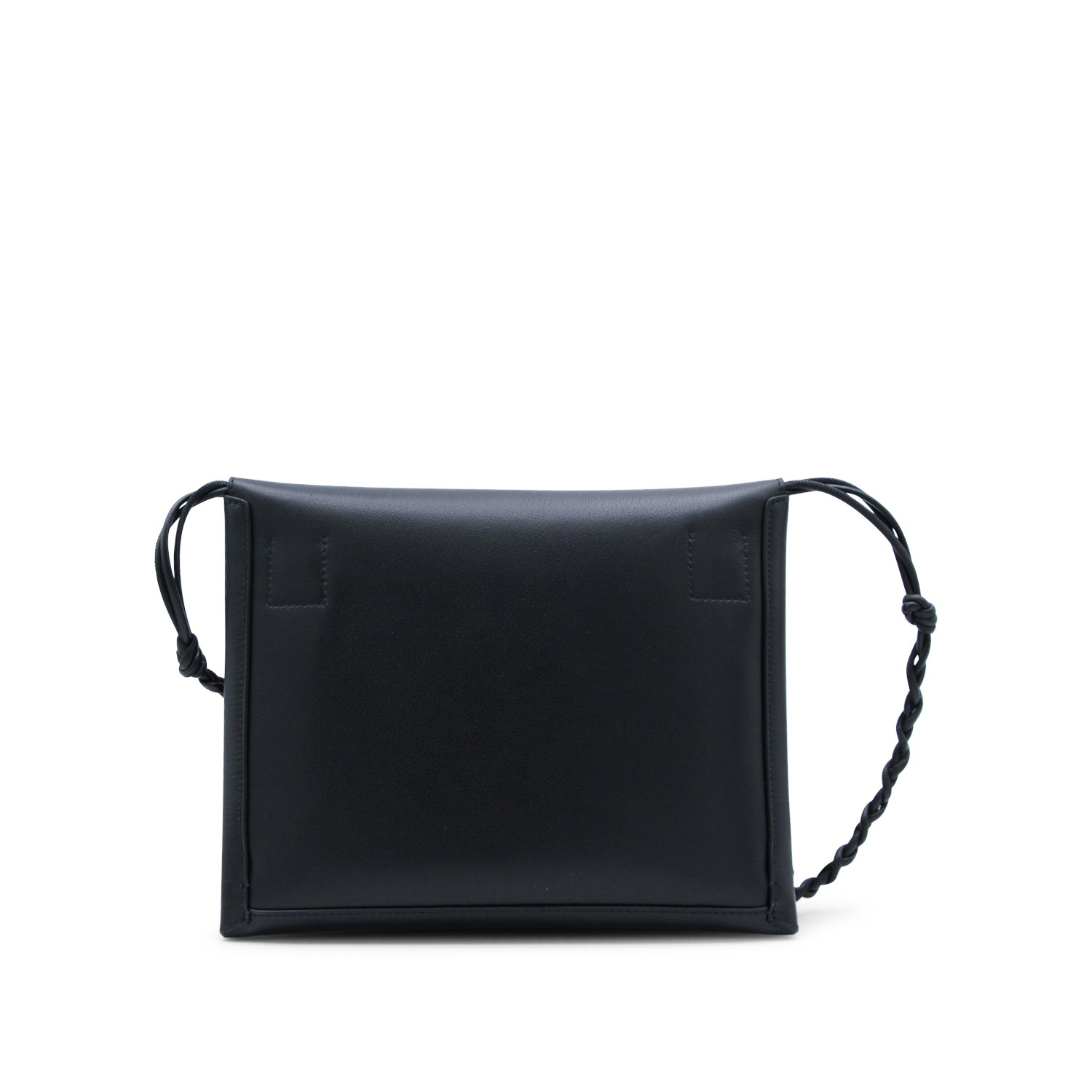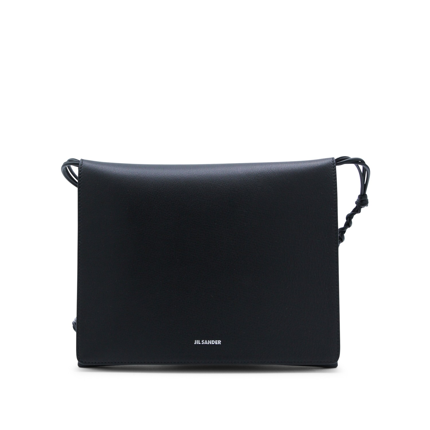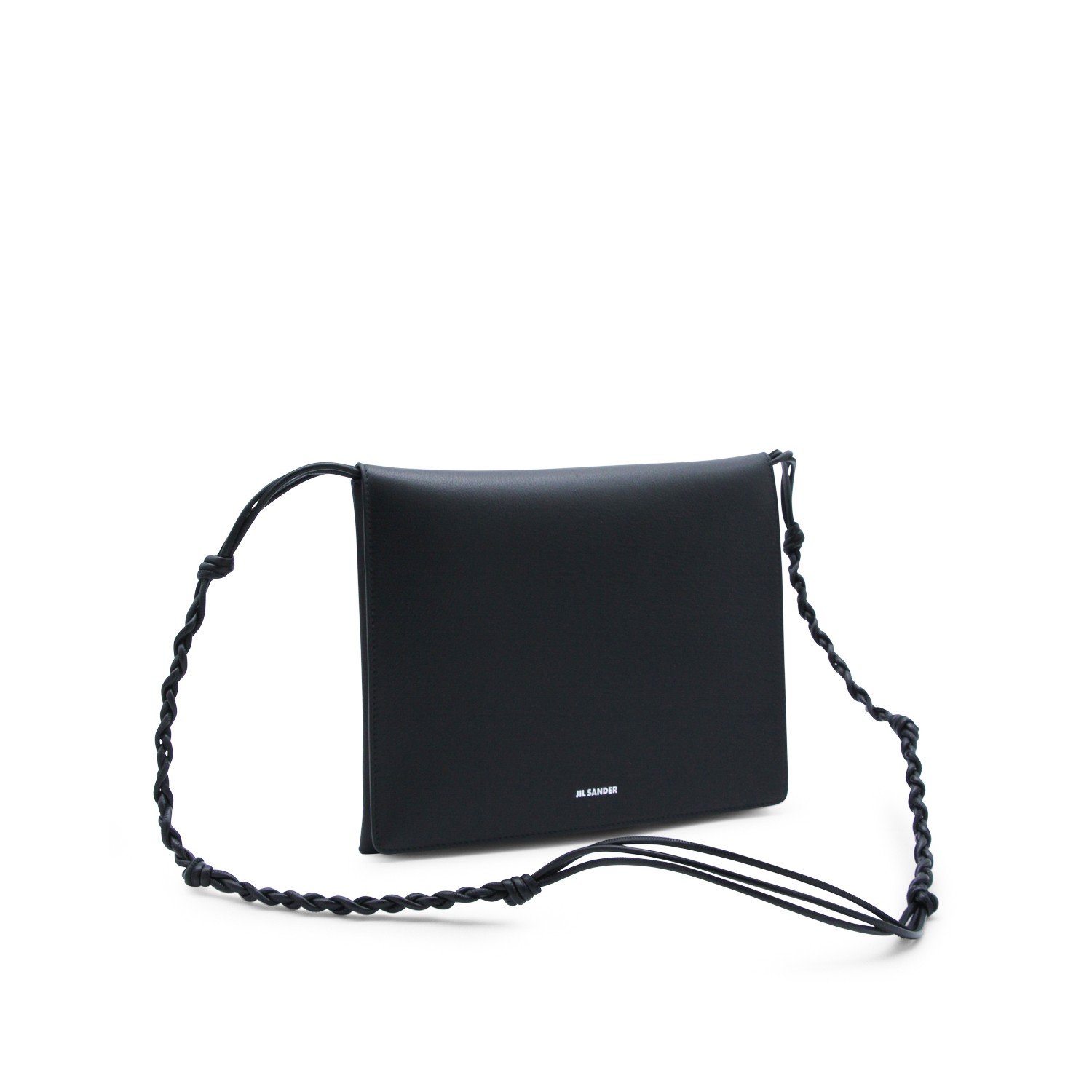 Black Tangle flat shoulder bag from Jil Sander featuring frontal logo, adjustable strap, inside pocket and magnetic fastening.
