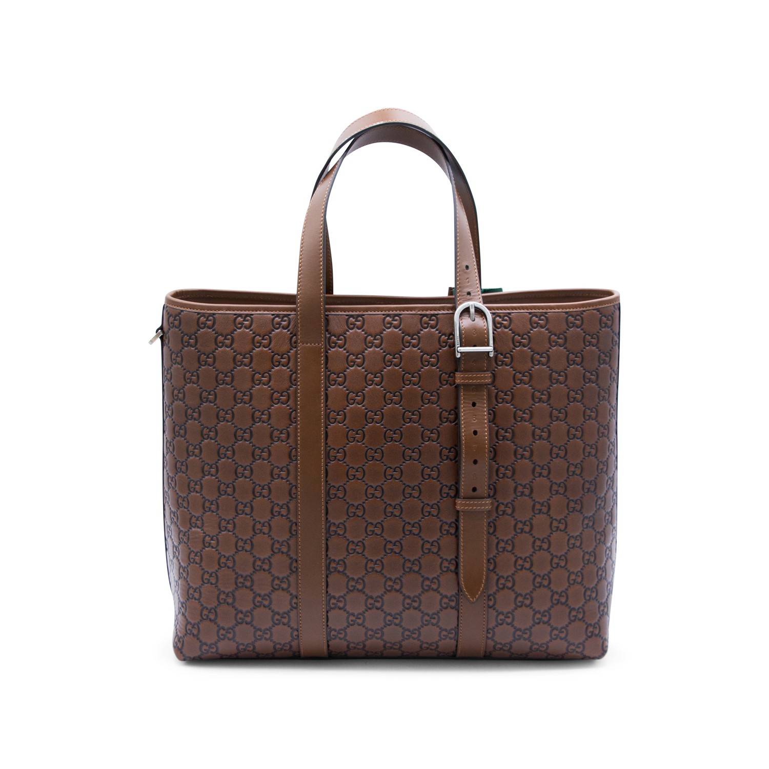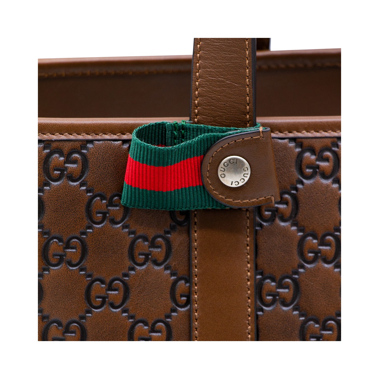 Brown leather GG Emblem tote from Gucci featuring adjustable top handles, Web detail with snap button closure, buckle detail, hook closure, main compartmetn and all over embossed monogram.