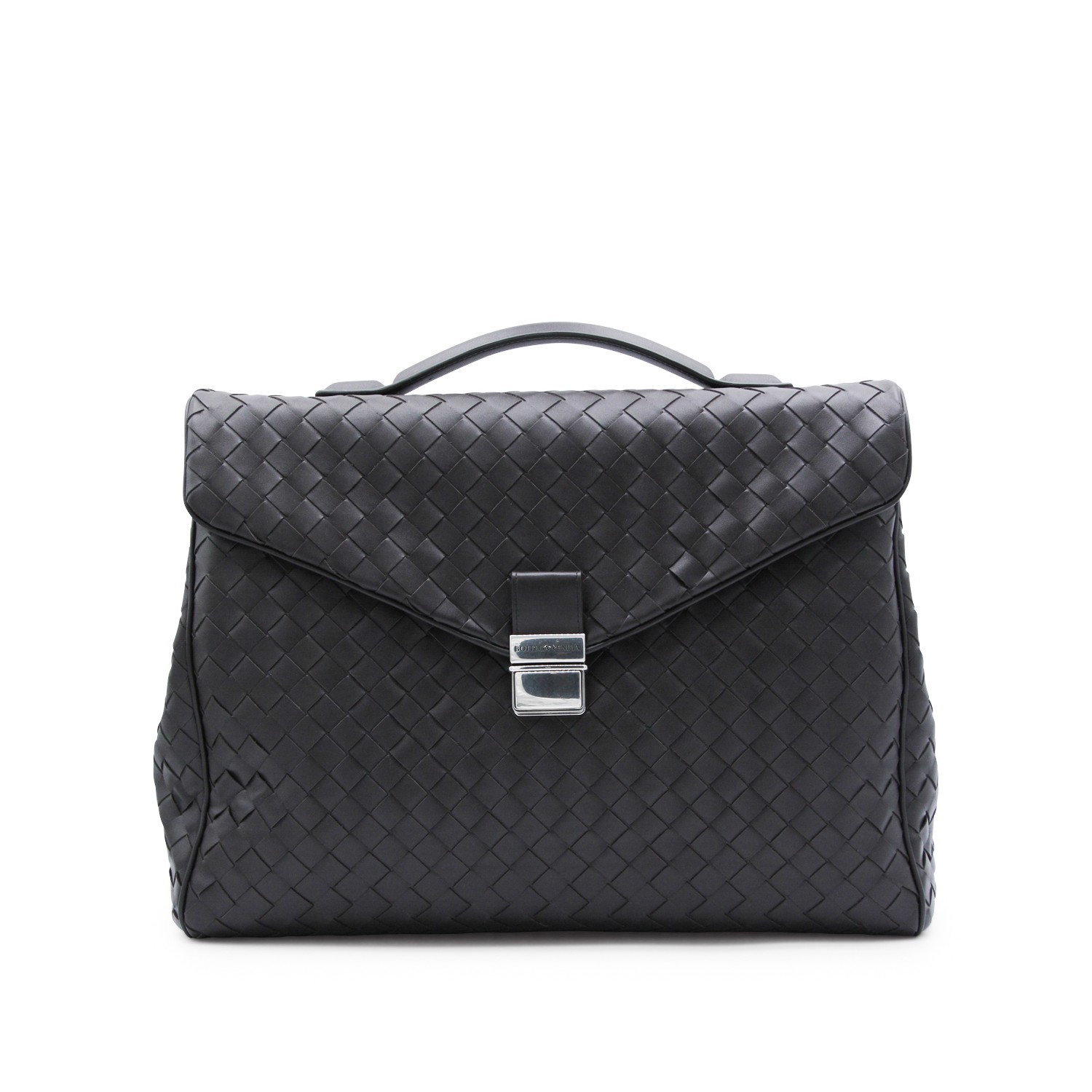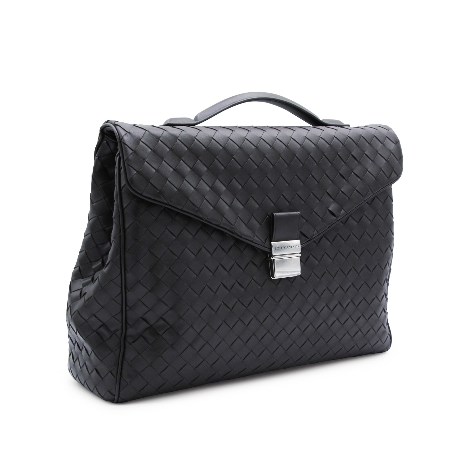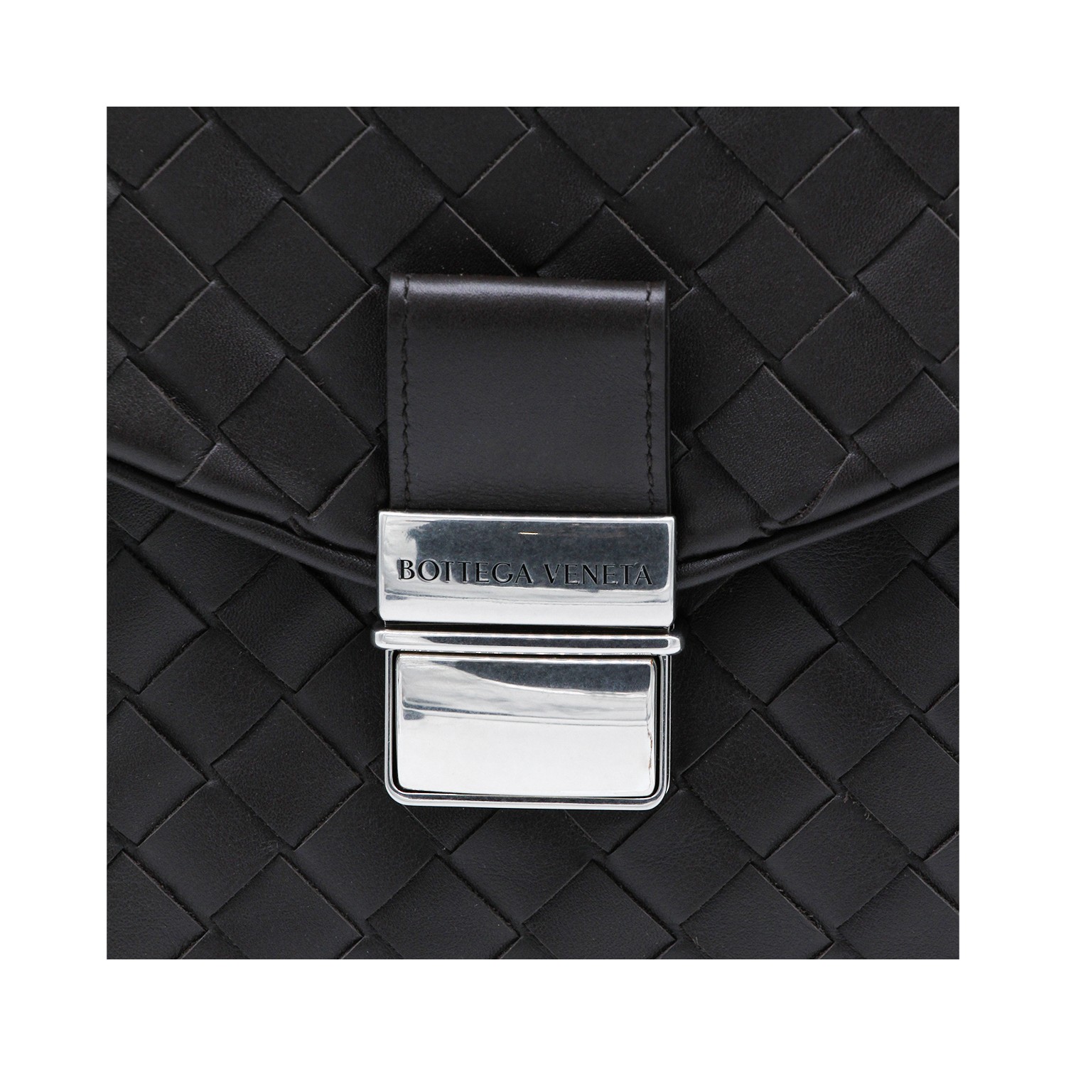 Dark brown leather Archivist bag from Bottega Veneta featuring all over Intreccio motif, silver tone hardware, foldover top with push lock closure, single top handle, adjustable and removable shoulder strap, compartments and multiple pockets.