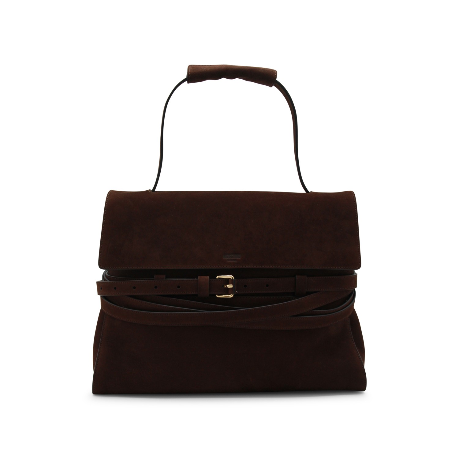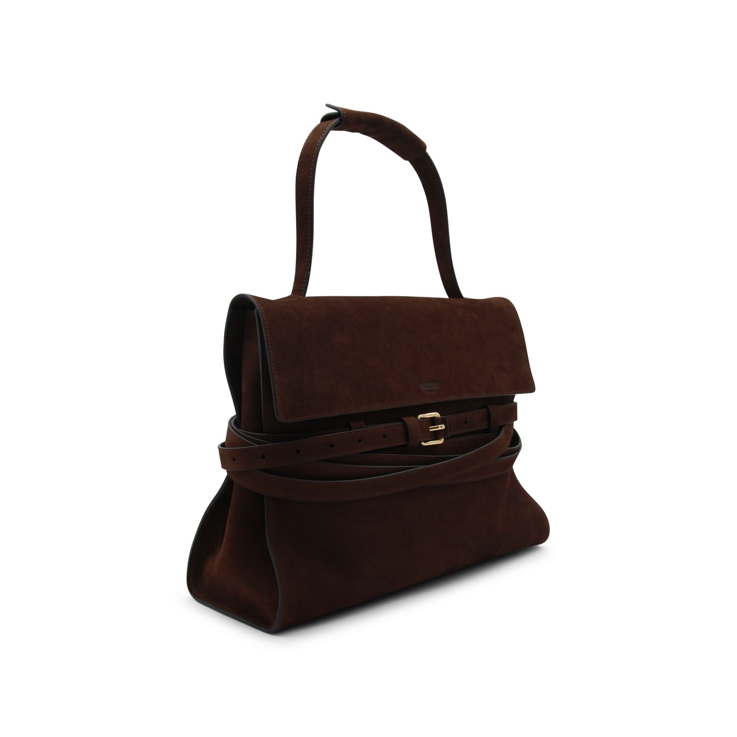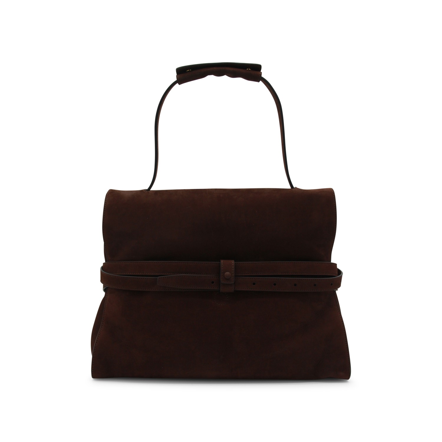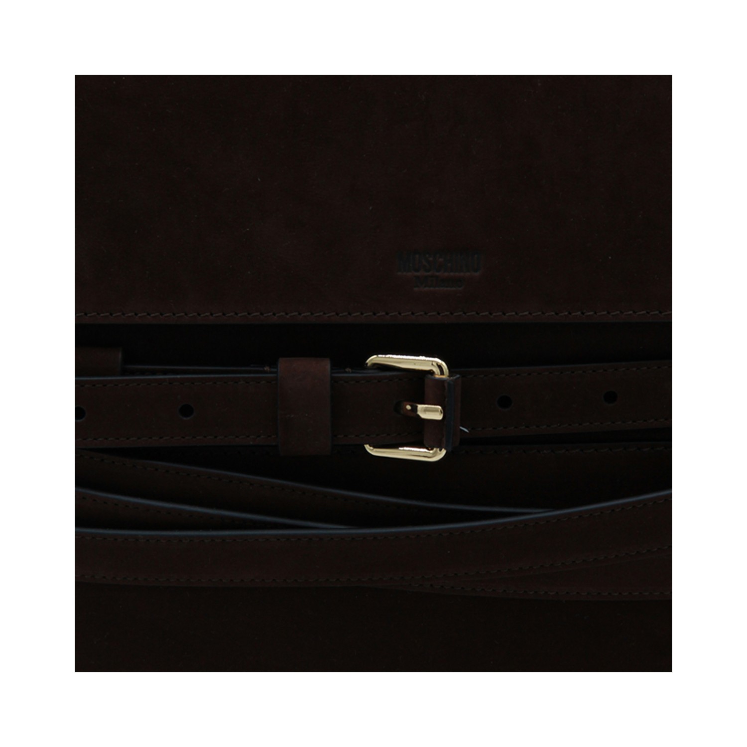Dark brown leather shoulder bag from Moschino featuring top handle with removable pad, removable and adjustable shoulder strap with buckle, zip closure, logo on the flap and interior zip pocket and small patch pocket.