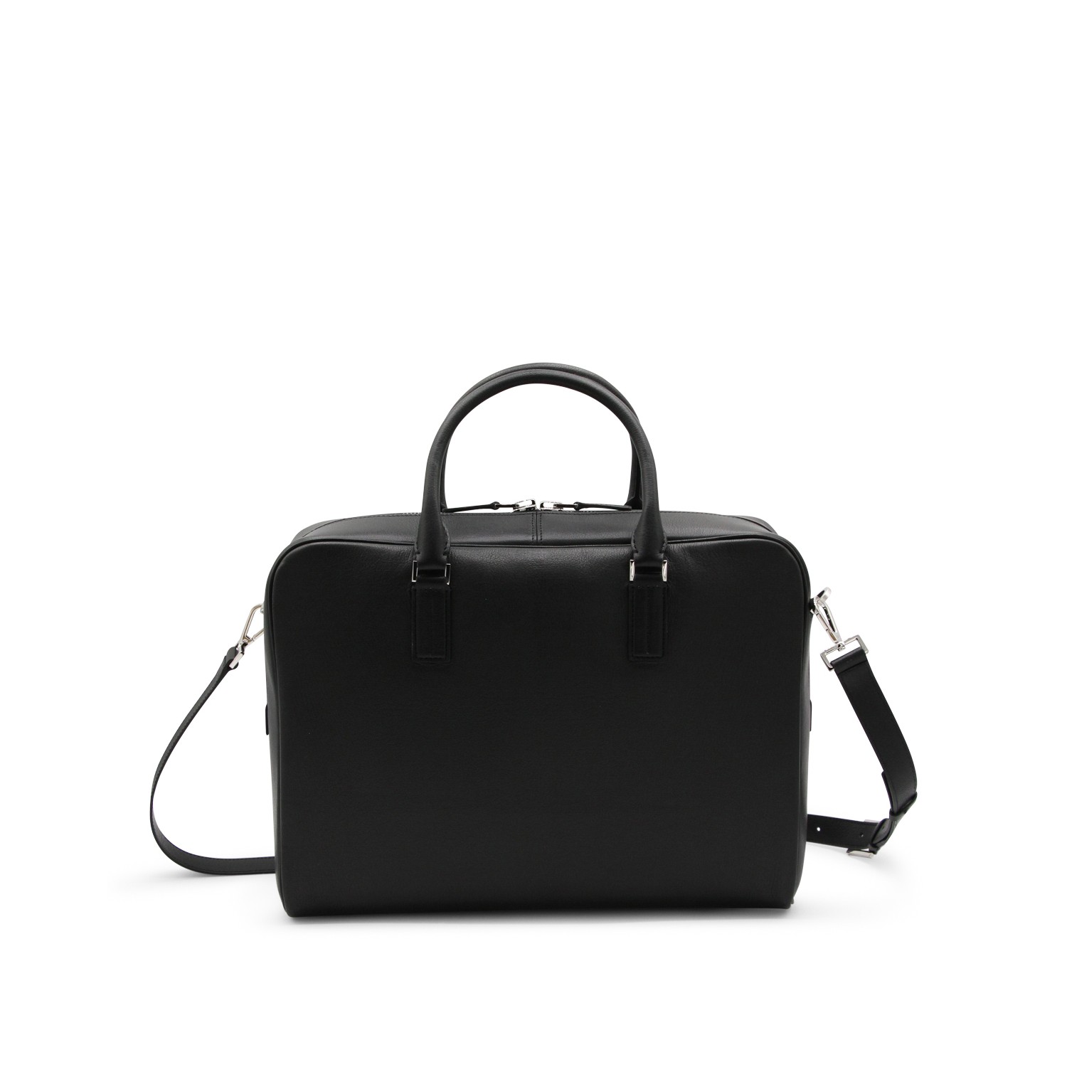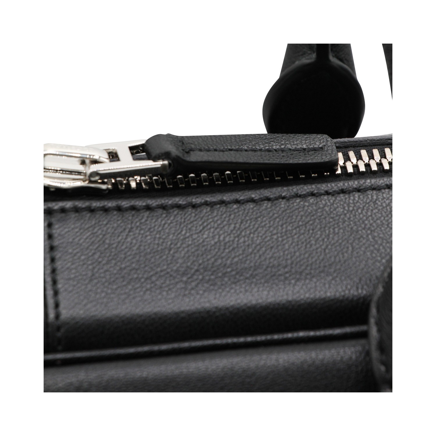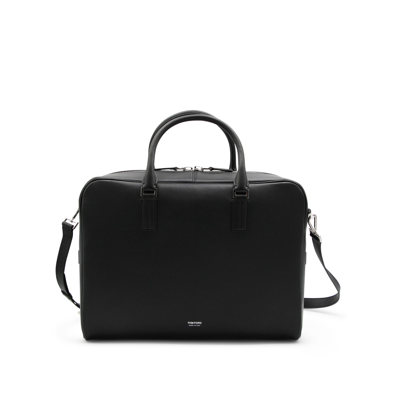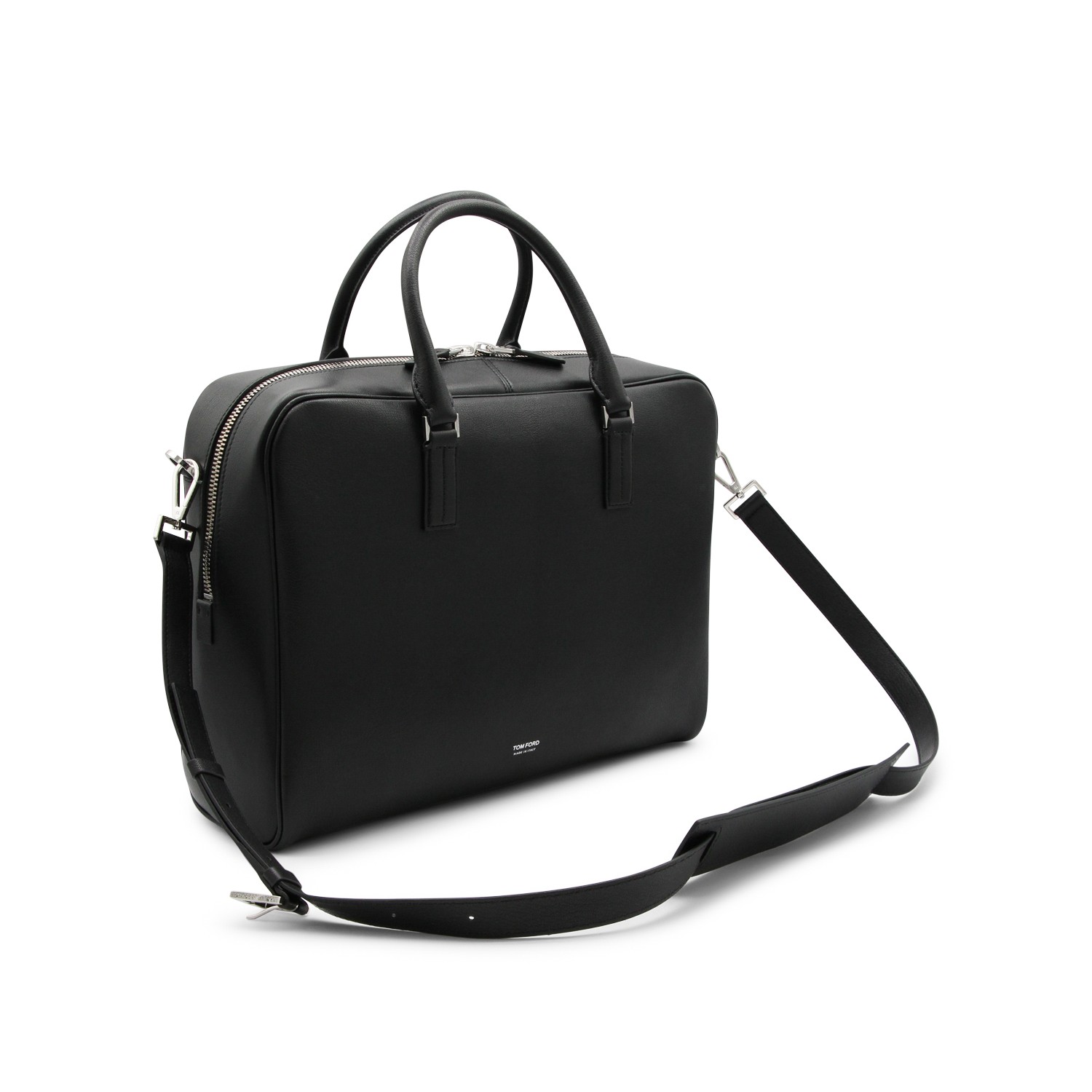 Black leather top handle bag from Tom Ford featuring top handles, removable strap, zip fastening, main compartment and gold tone logo.