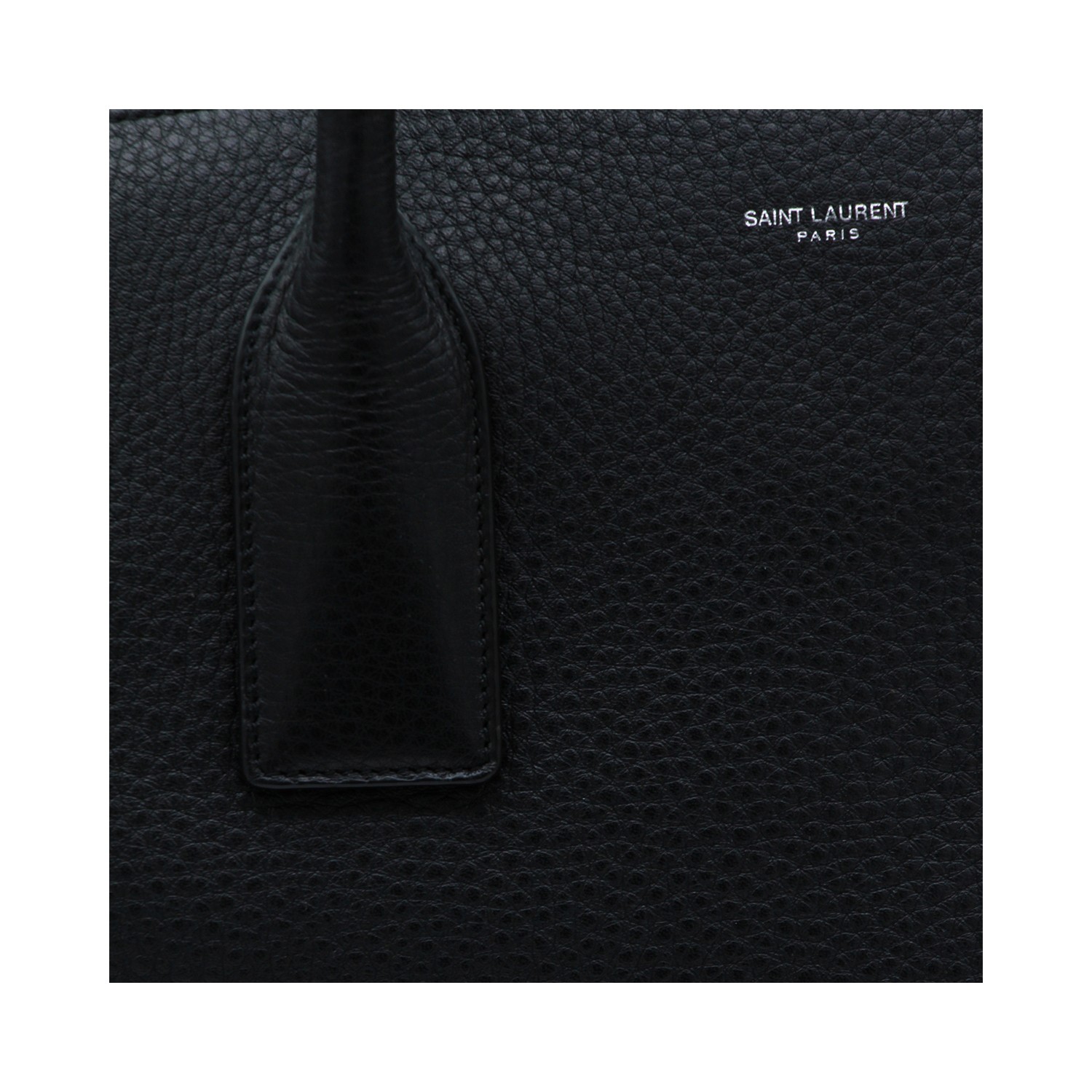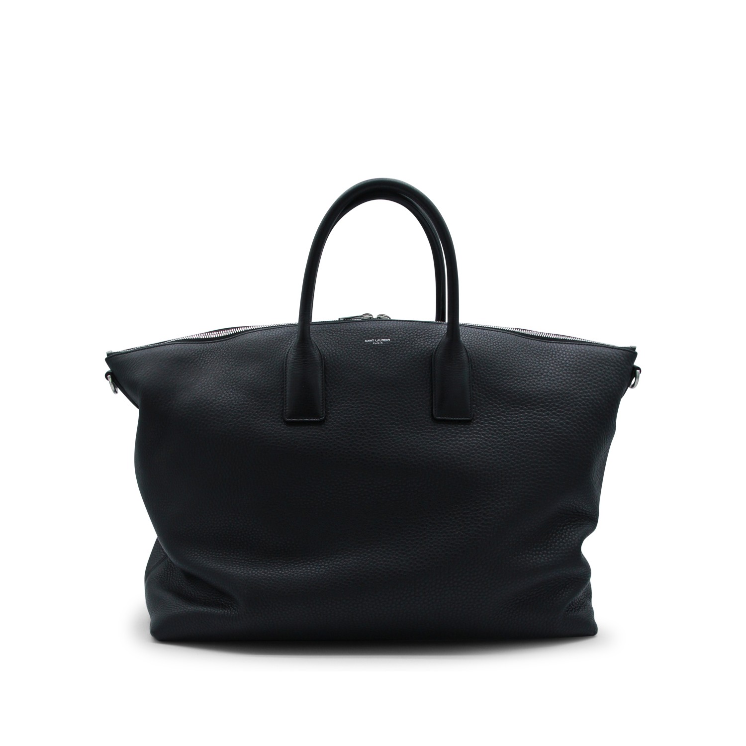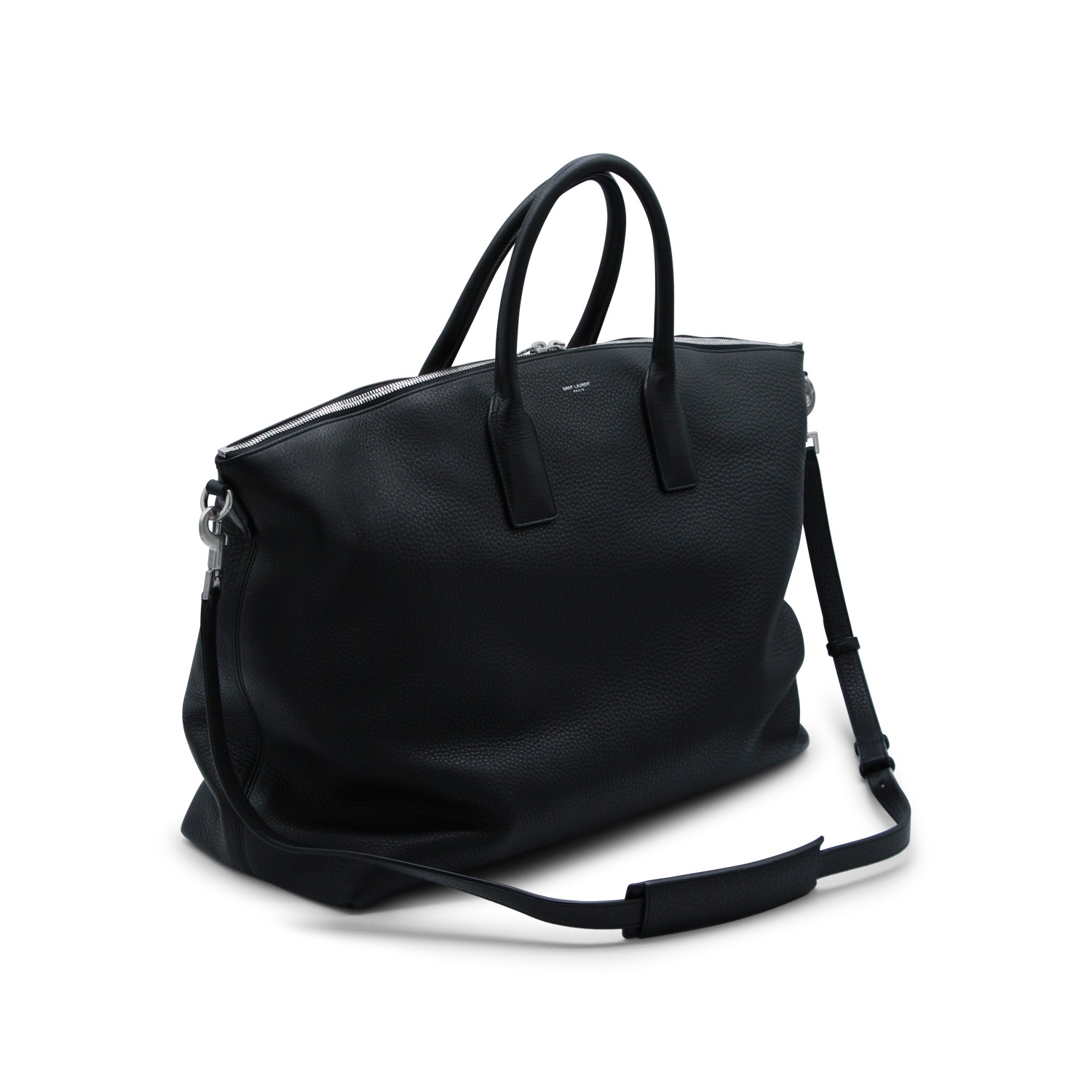 Black leather bag from Sain Laurent featuring top handle, removable and adjustable shoulder straps, logo, silver tone hardware and main compartment with zip fastening.