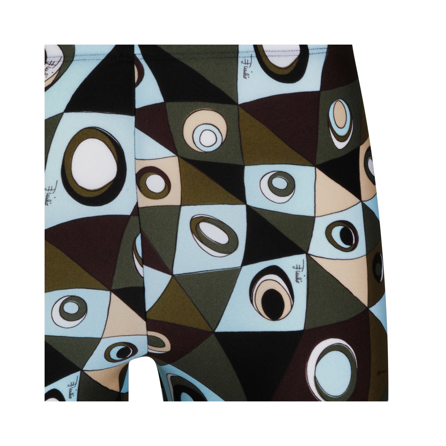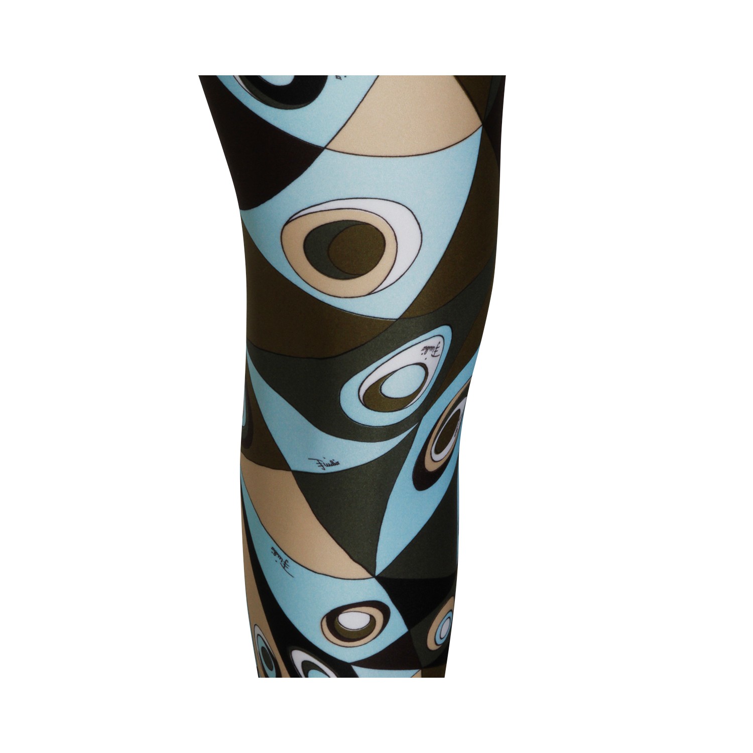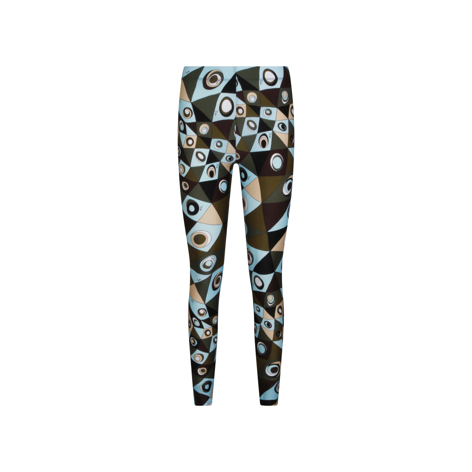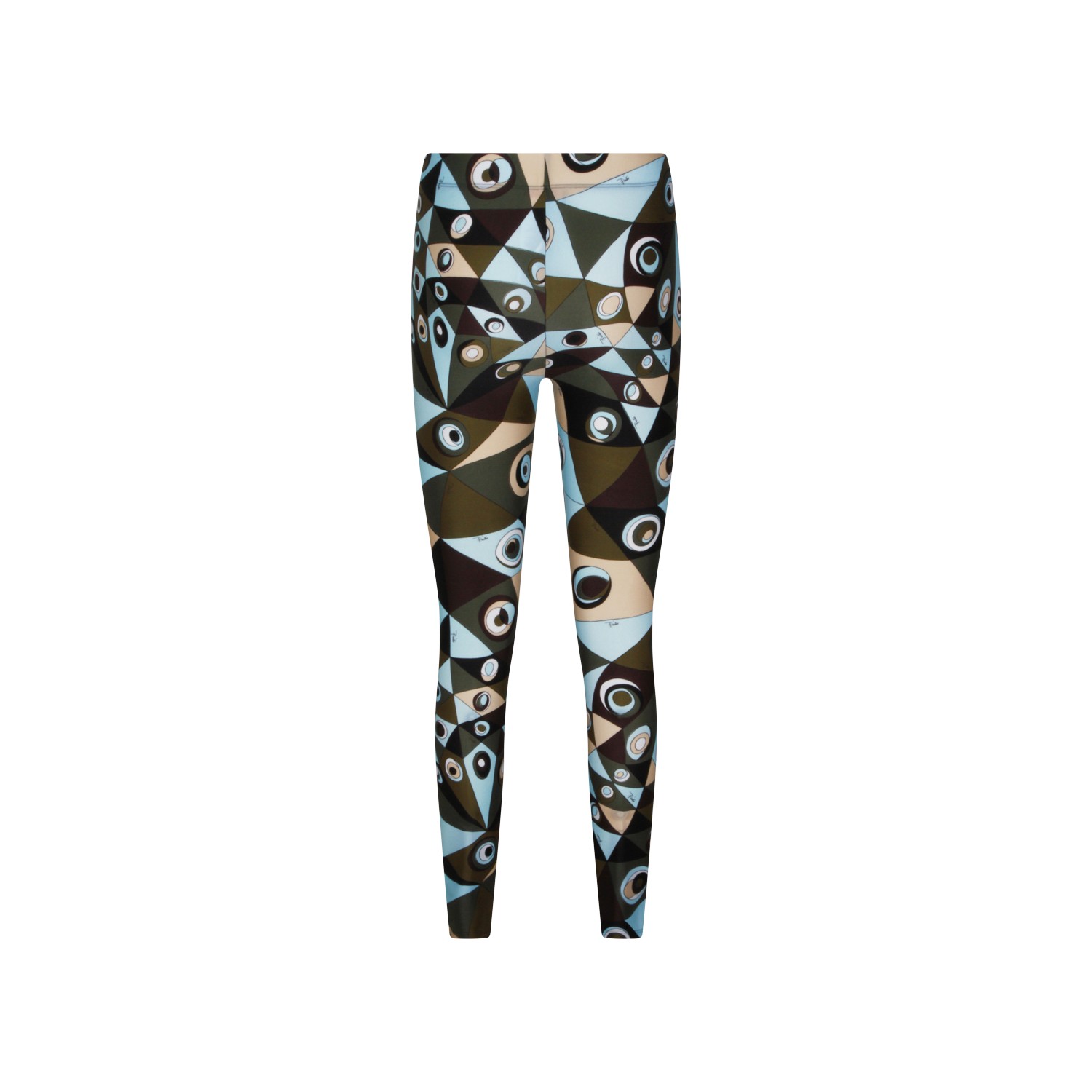 Khaki blue printed leggings pants from Emilio Pucci with all over multicolor print, stretch fit, elasticized waist band and long length.