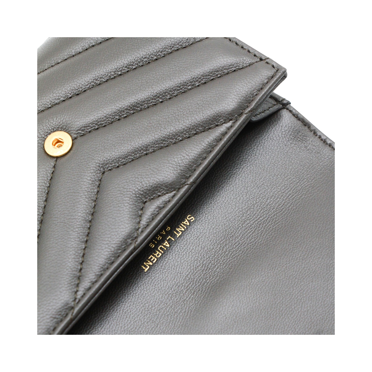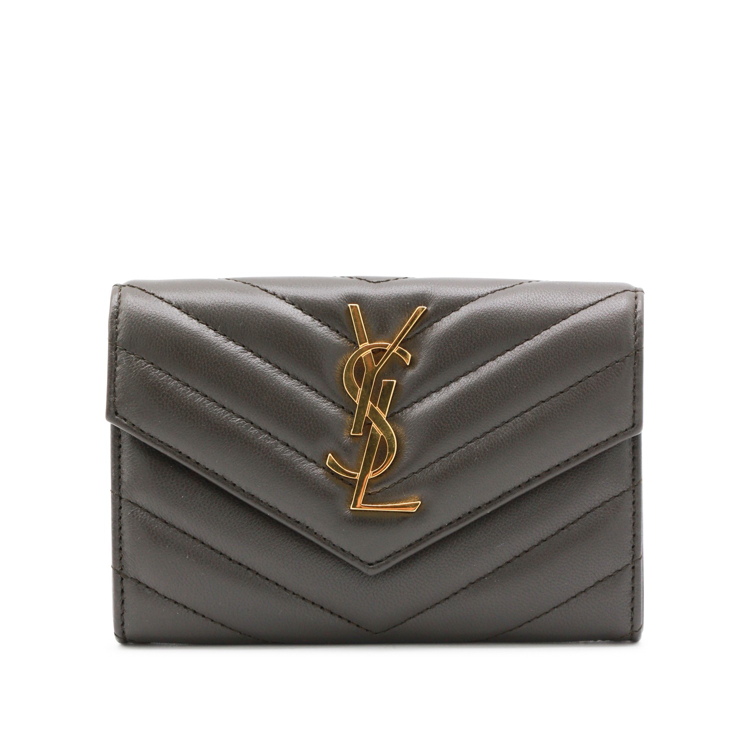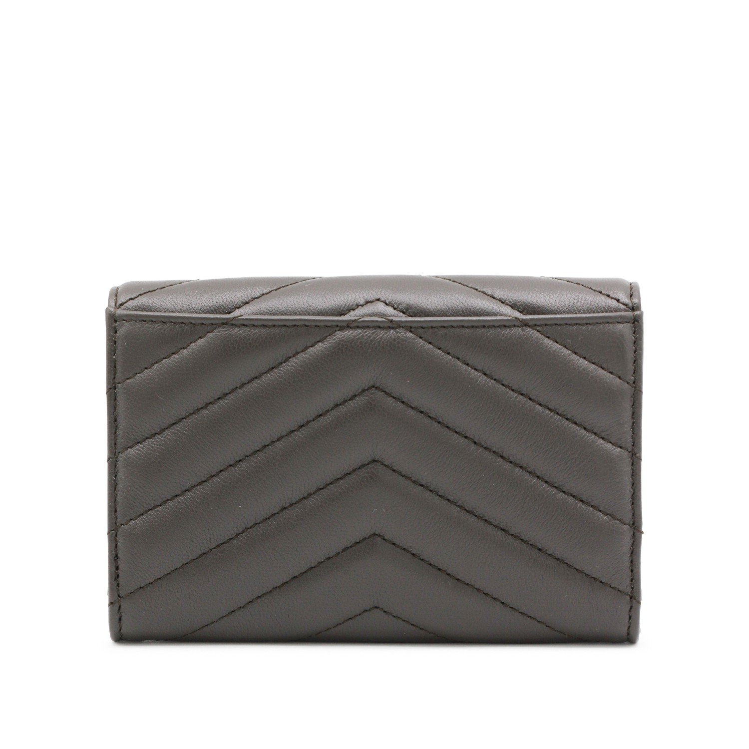 Dark grey leather Cassandre wallet from Saint Laurent featuring gold tone hardware, snap button closure, flat pocket and card slots.