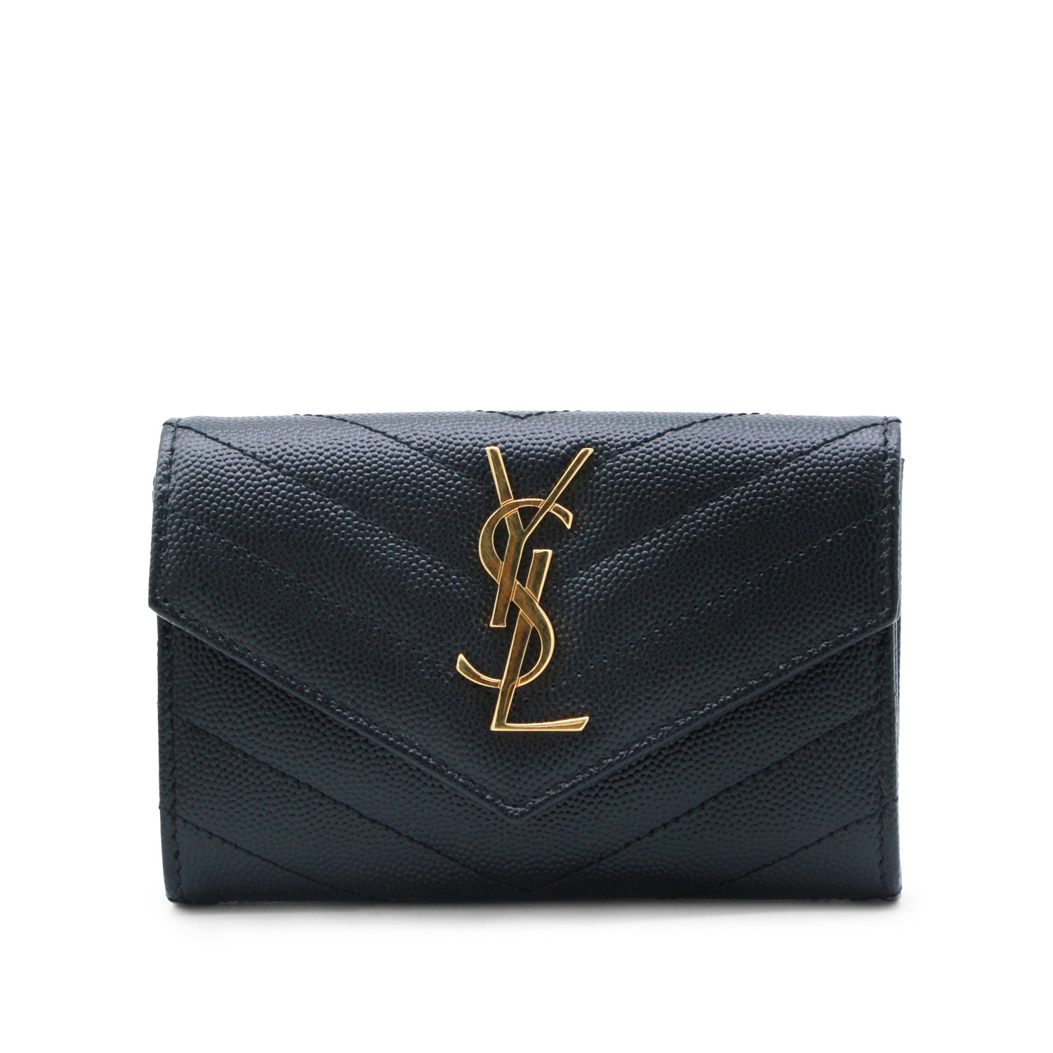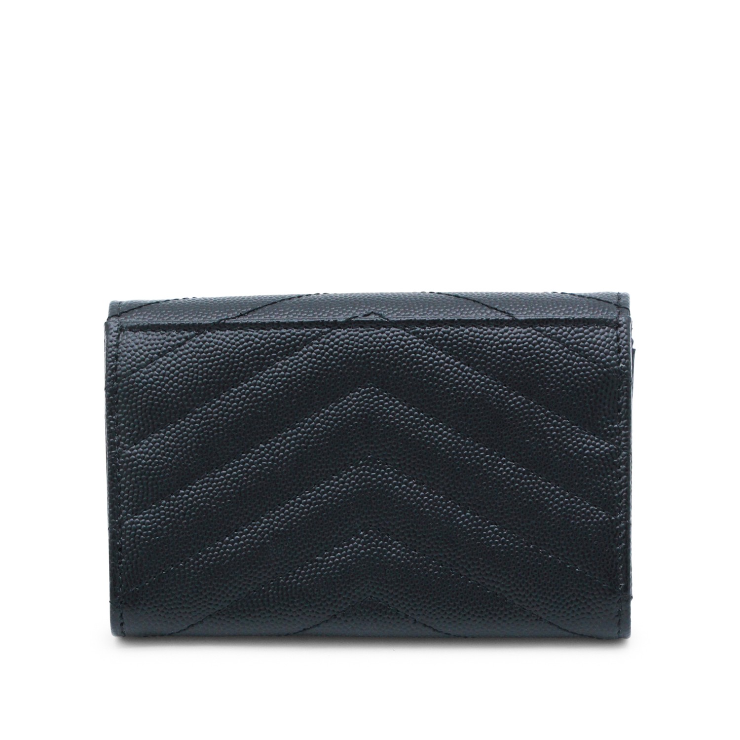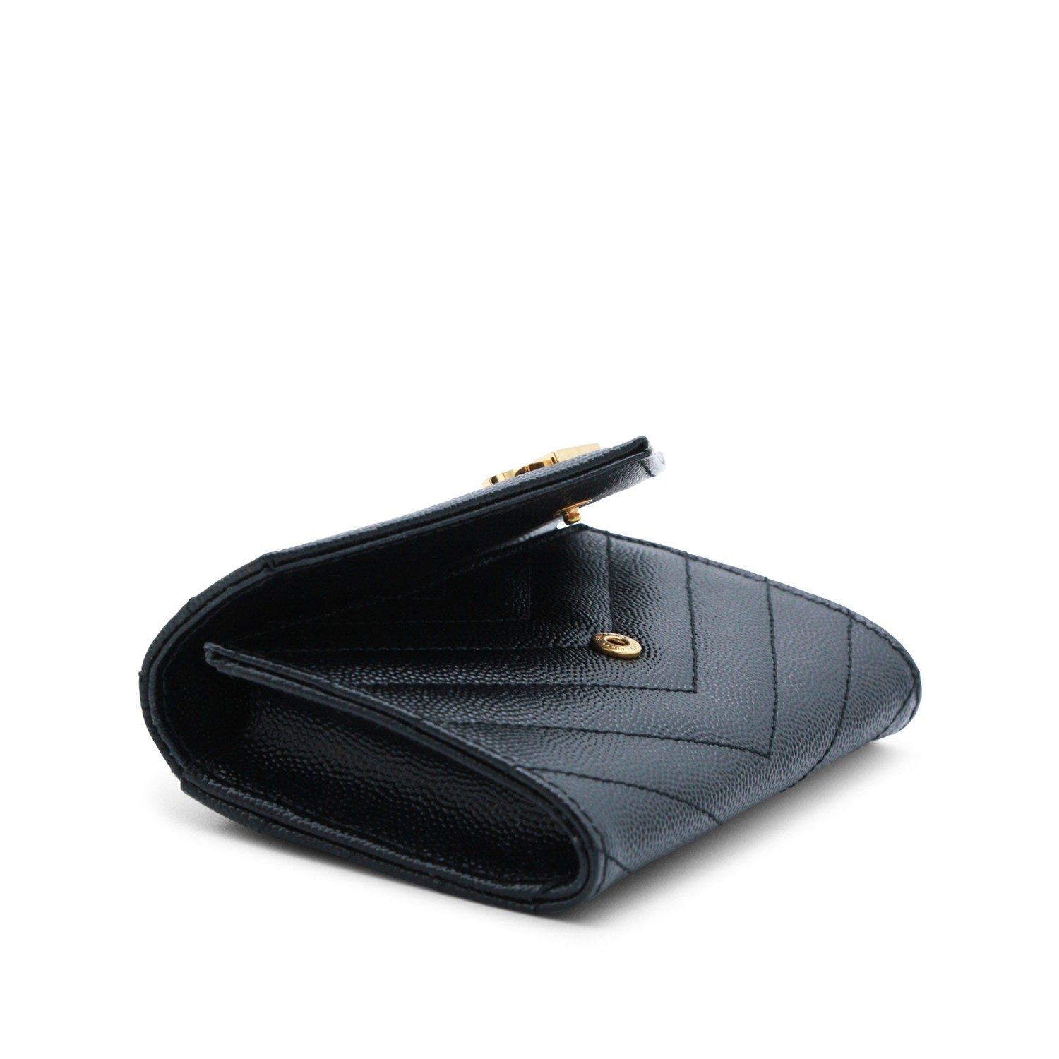 Black leather wallet from Saint Laurent featuring chevron motif, front metal lettering logo, snap button closure and compartments.