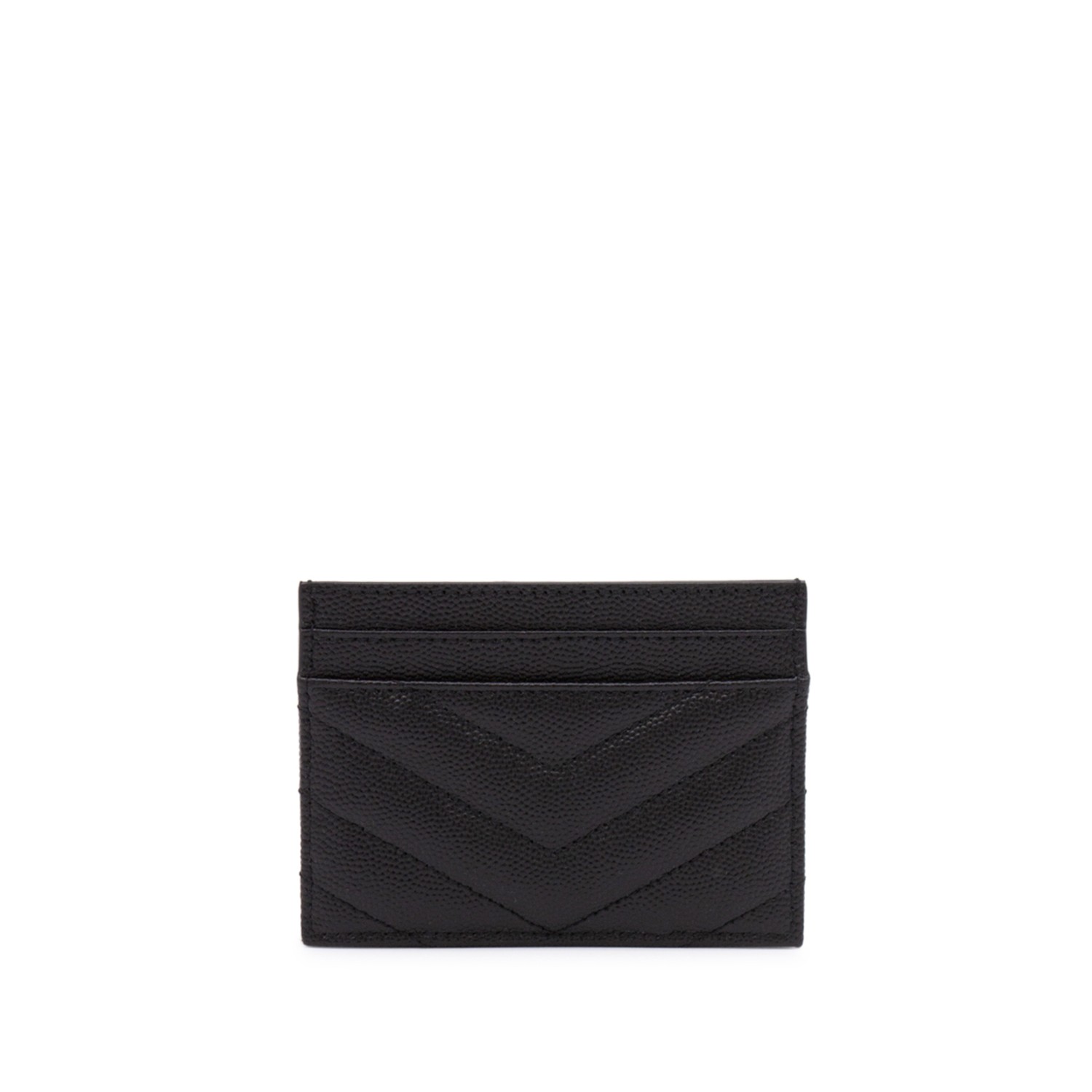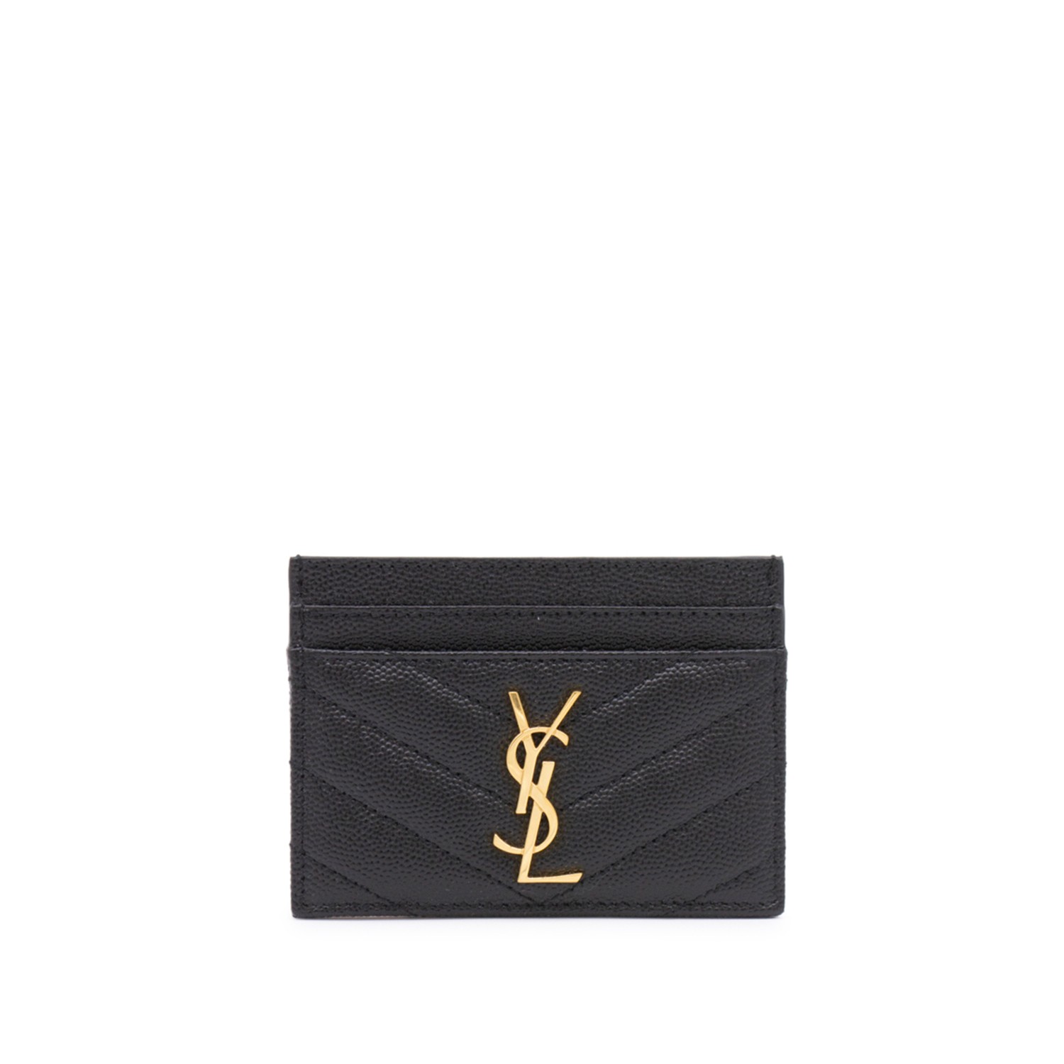 Black leather card holder from Saint Laurent featuring frontal gold tone logo and card slots.