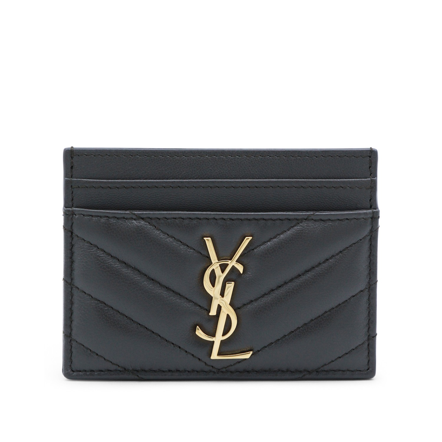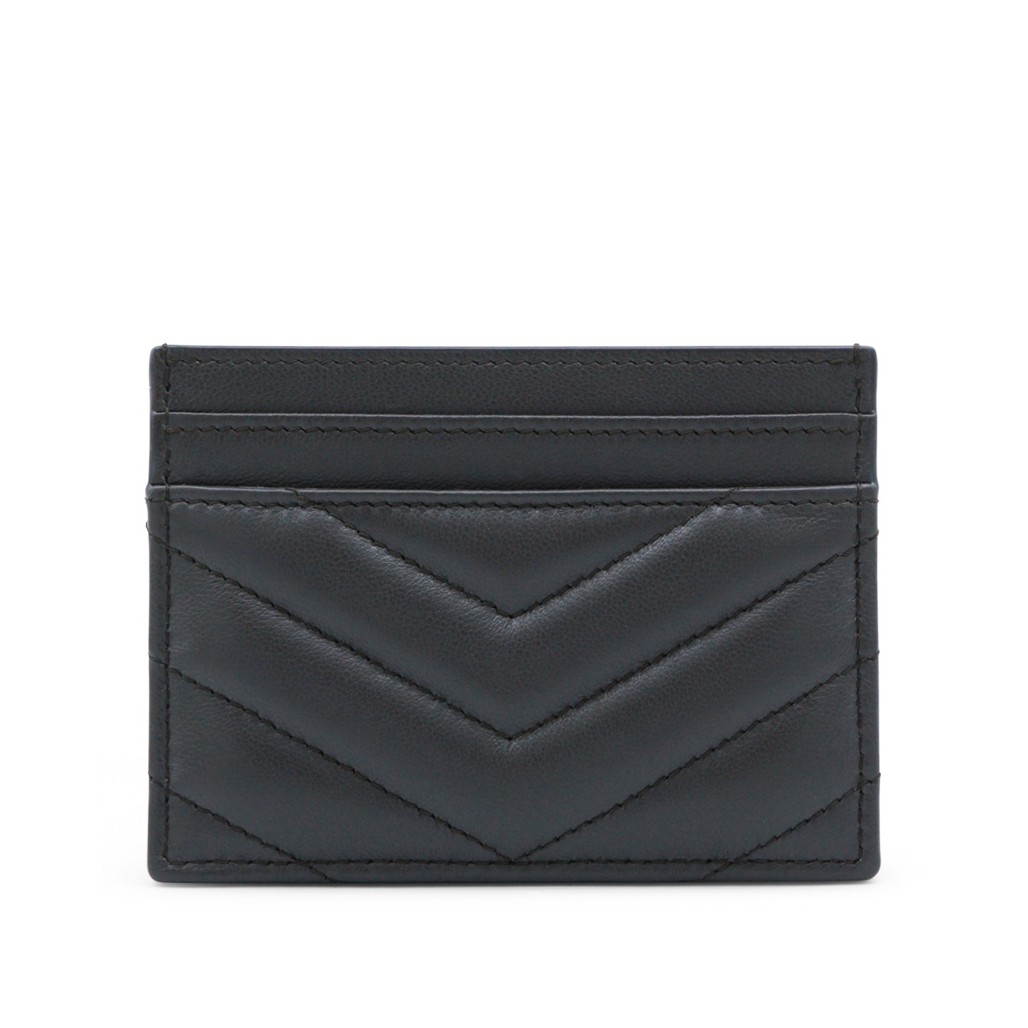 Dark grey leather card holder from Saint Laurent featuring rectangular shape, chevron details, gold metal logo and card slots.