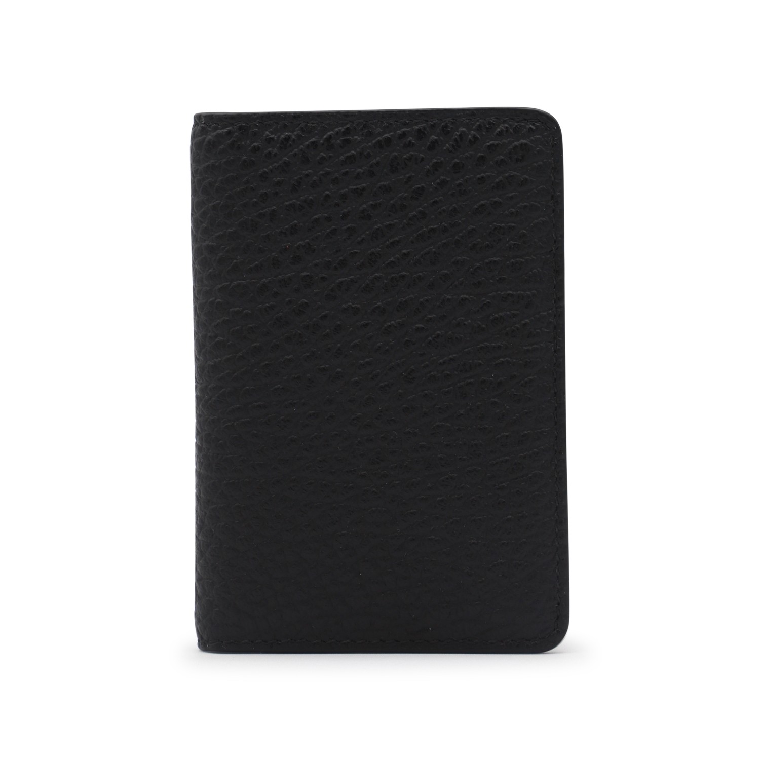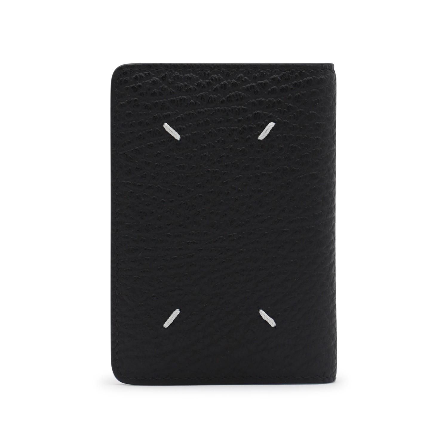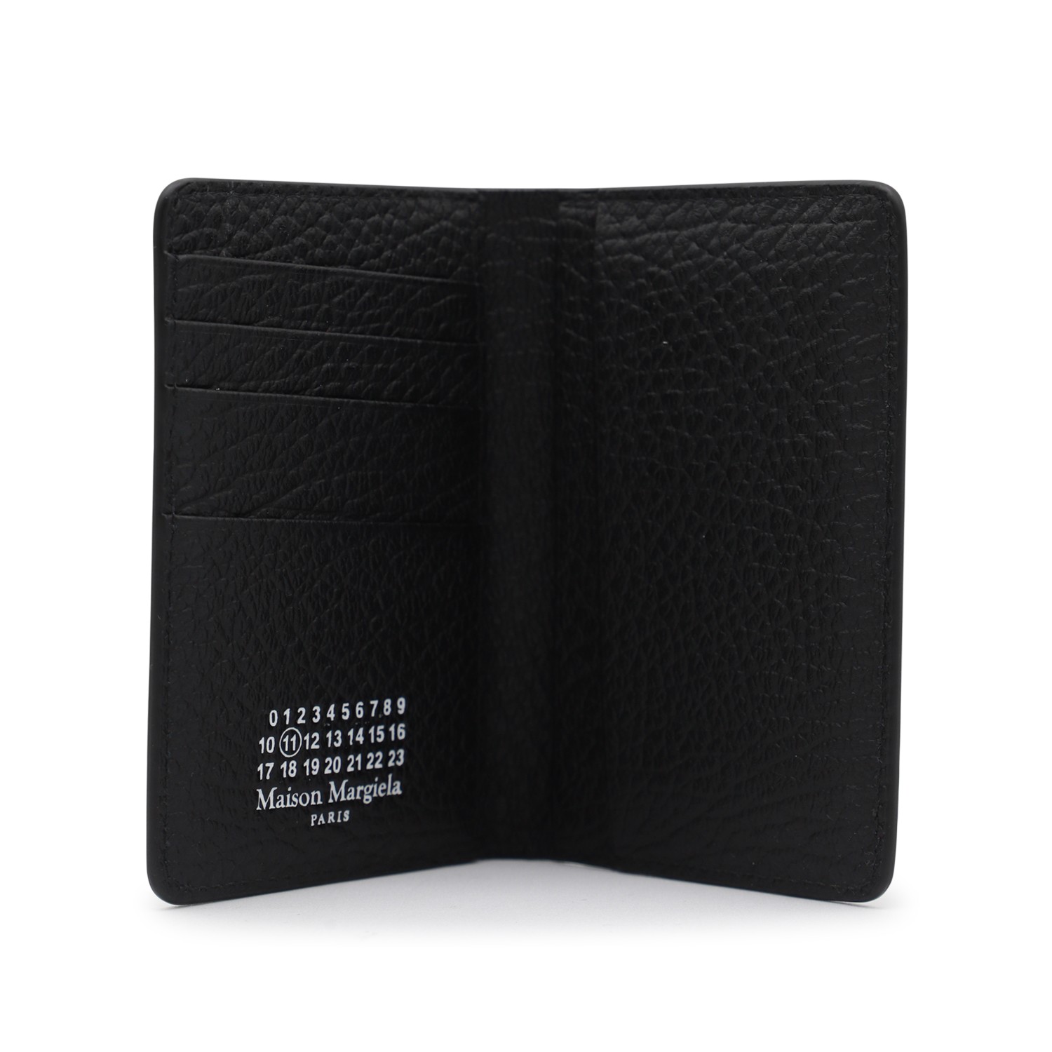 Black leather card holder from Maison Margiela featuring logo and inside pockets.