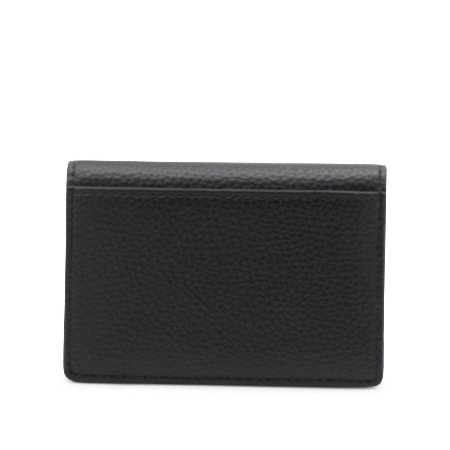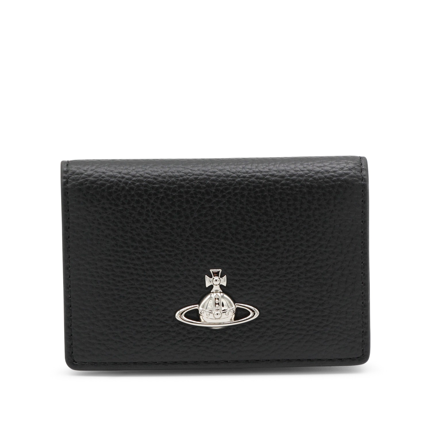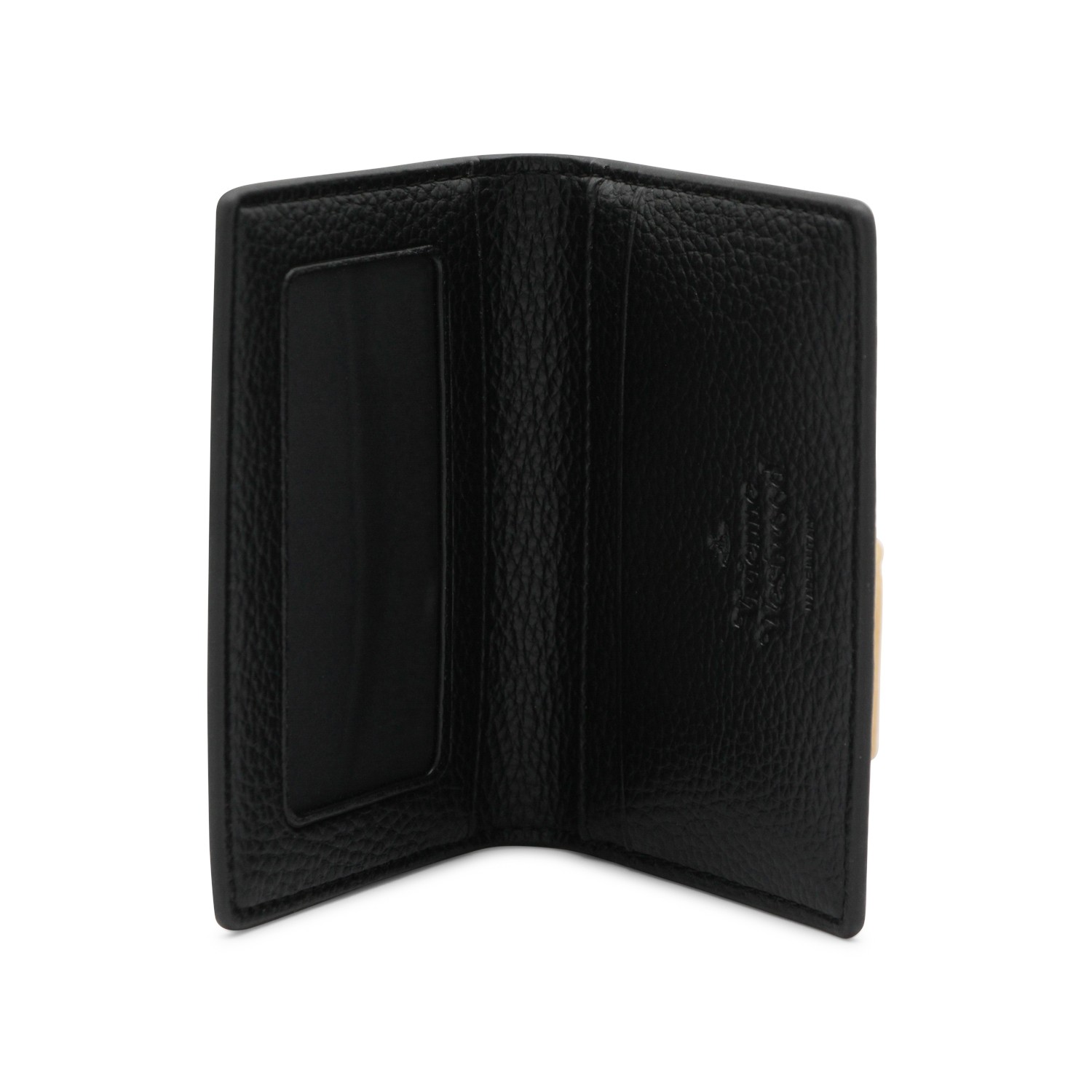 Black wallet from Vivienne Westwood featuring frontal silver tone logo and internal card holders.