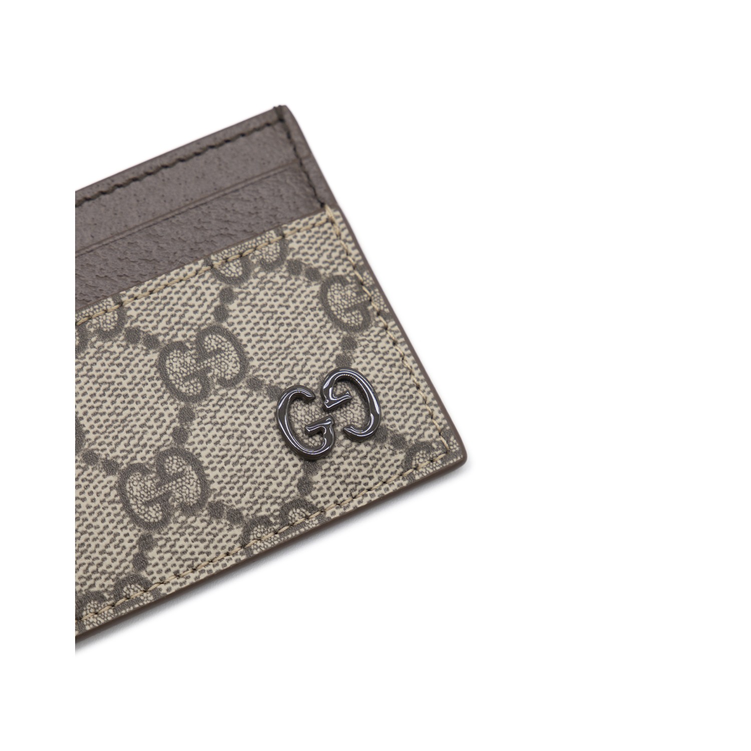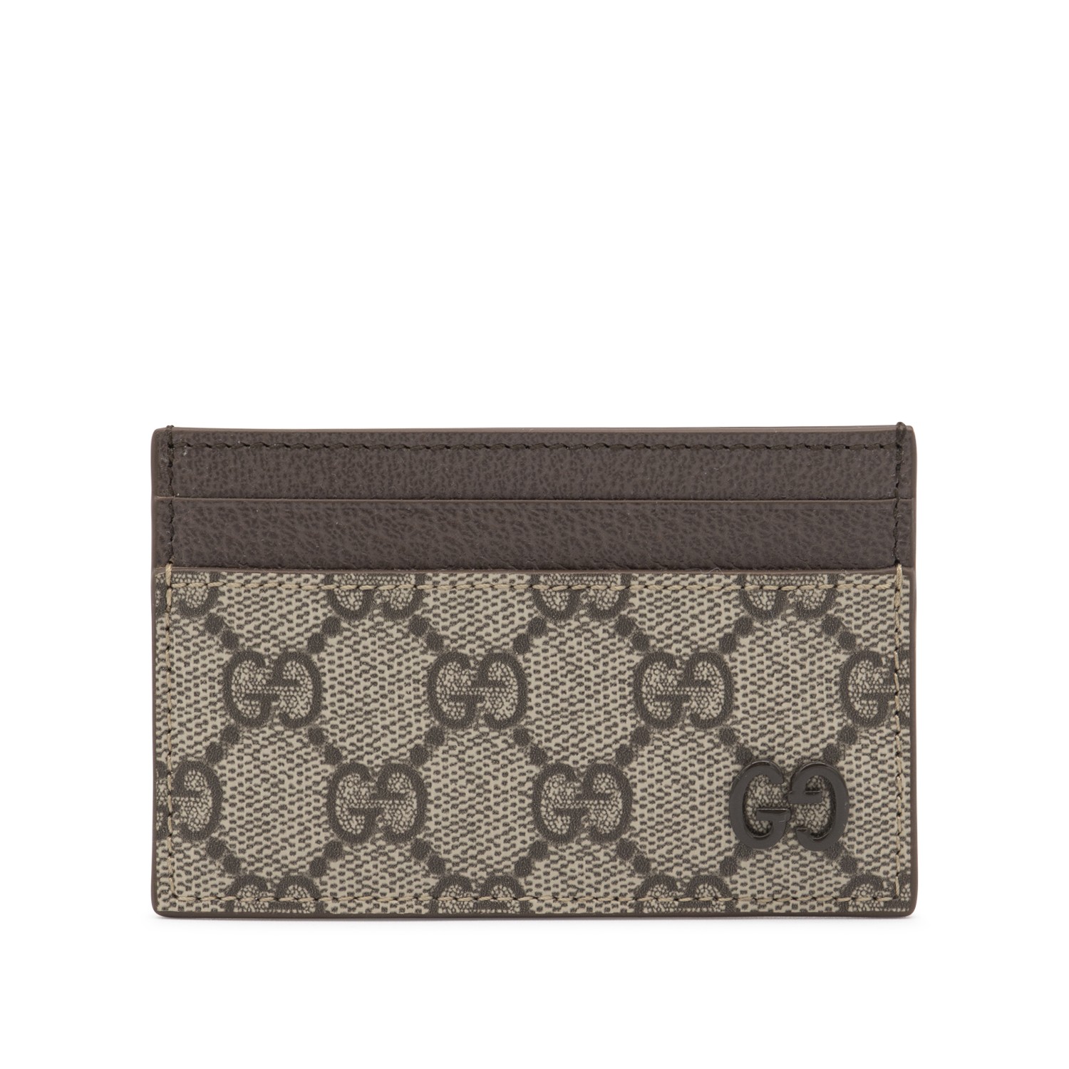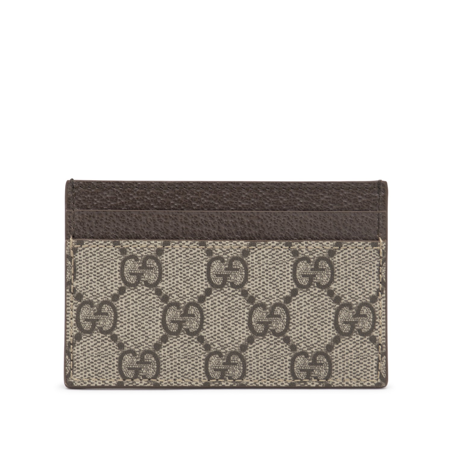 Beige card holder from Gucci featuring all-over GG motif, logo and card slots.