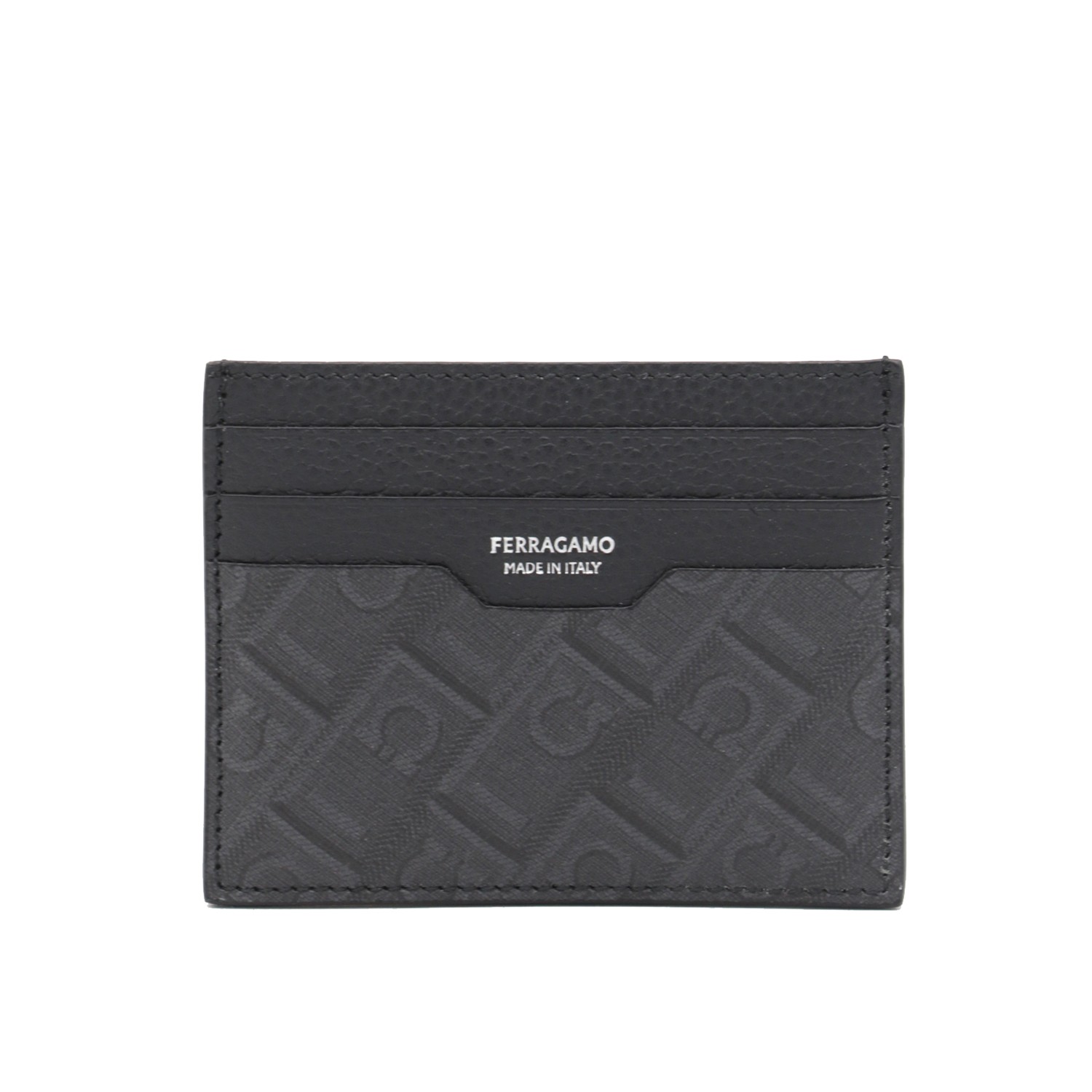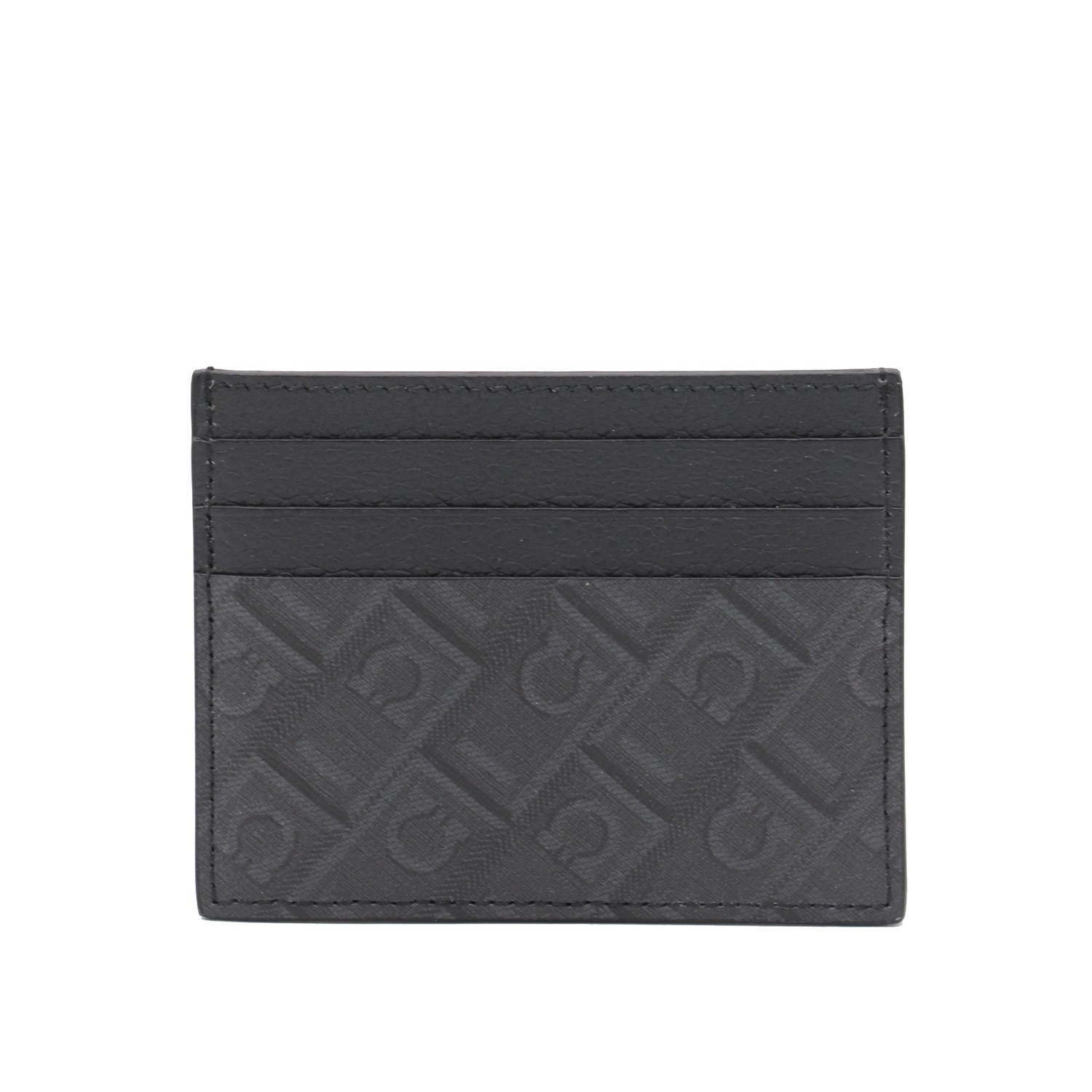 Black card holder from Ferragamo featuring card slots, all over pattern and logo.