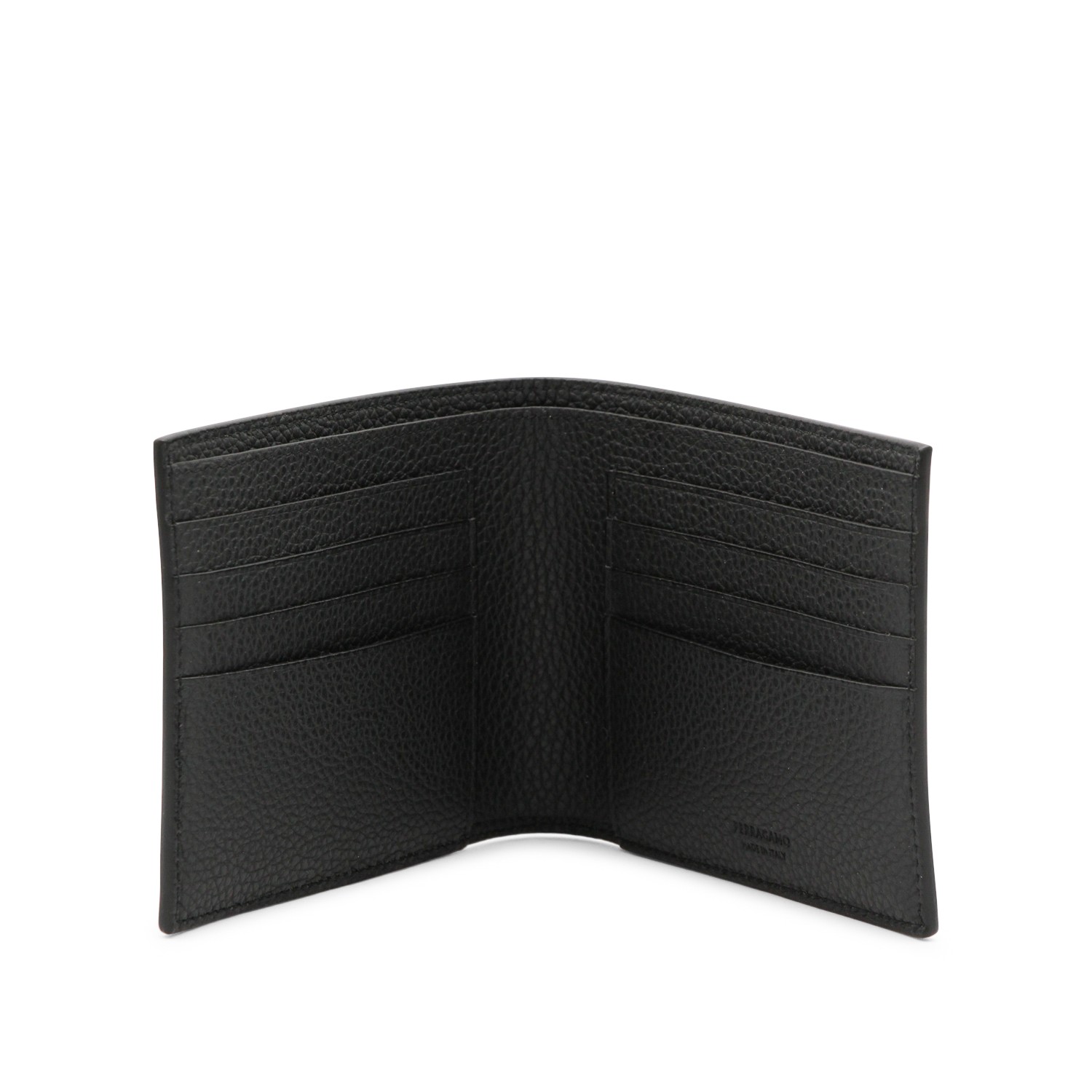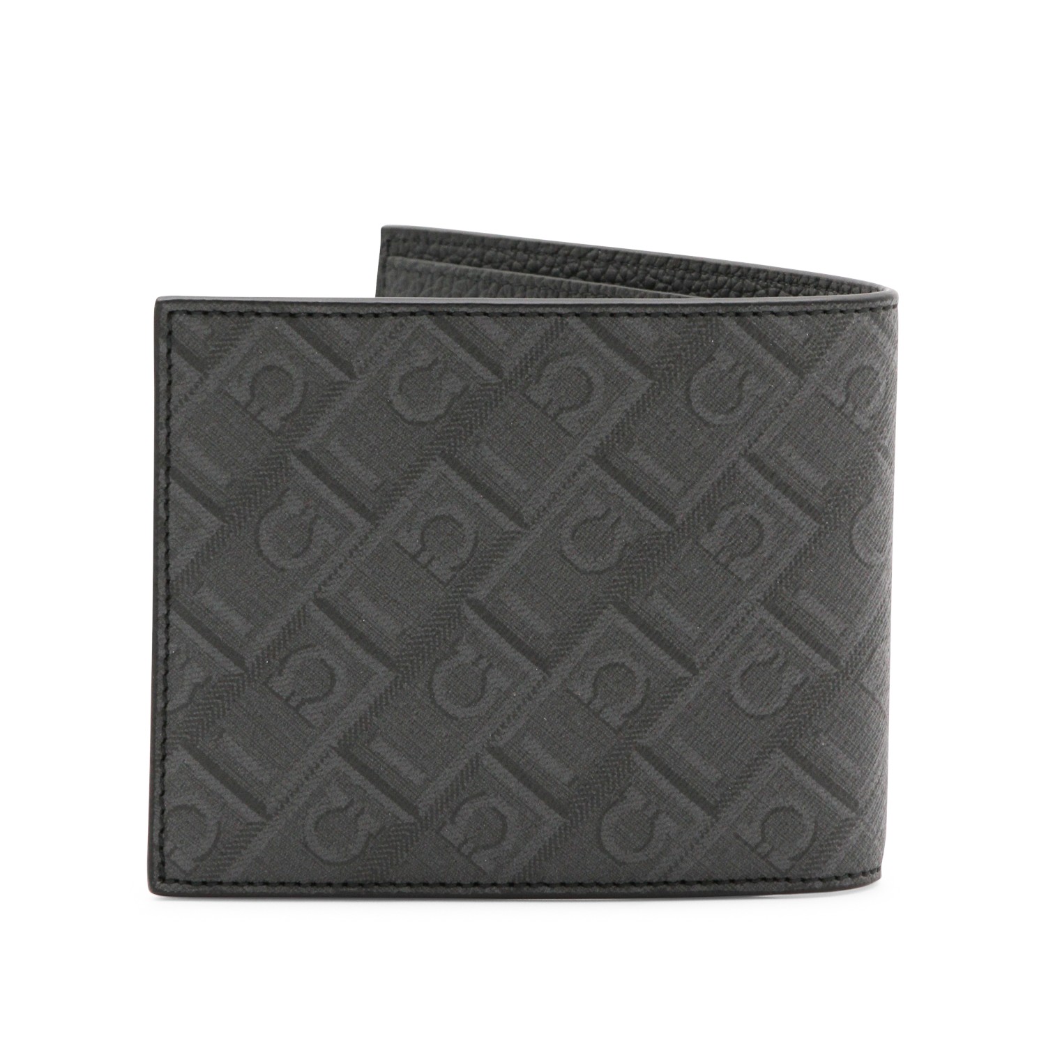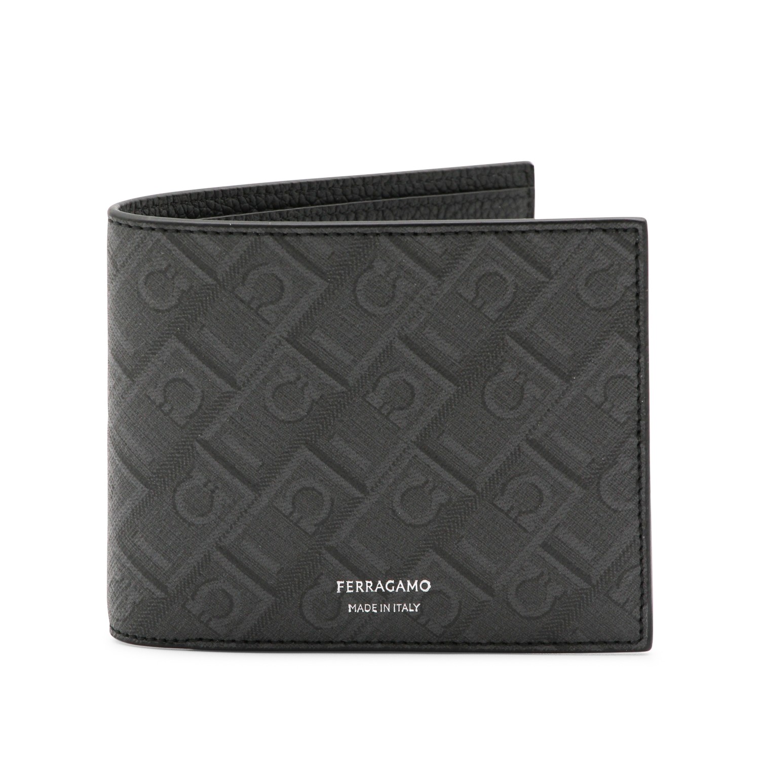 Grey leather wallet from Ferragamo featuring all over monogram, frontal logo, internal card slots and pocket.