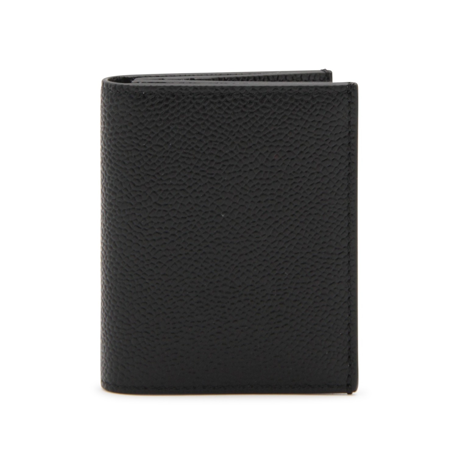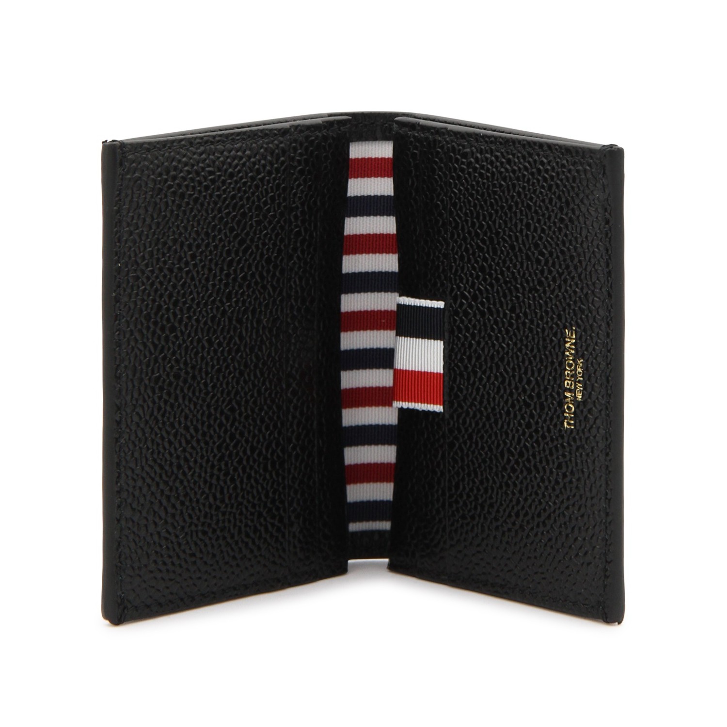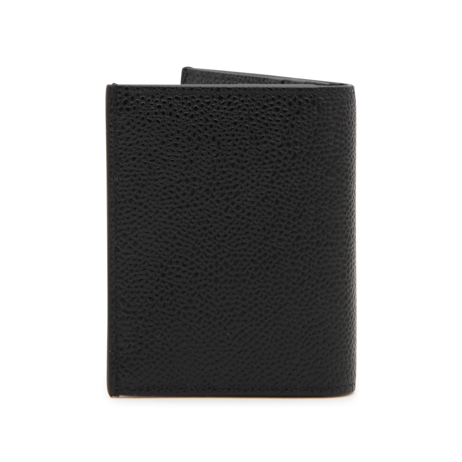 Black card holder from Thom Browne featuring card slots, pockets and internal logo.