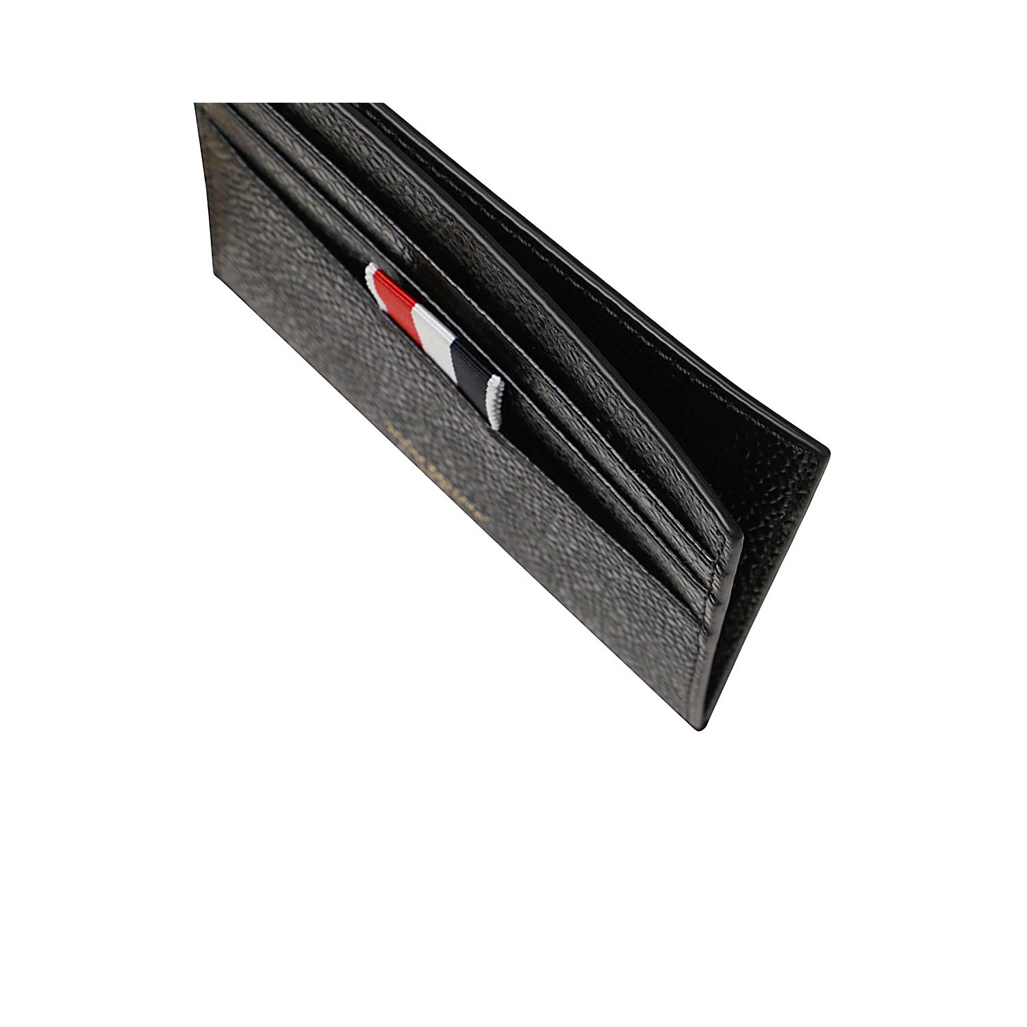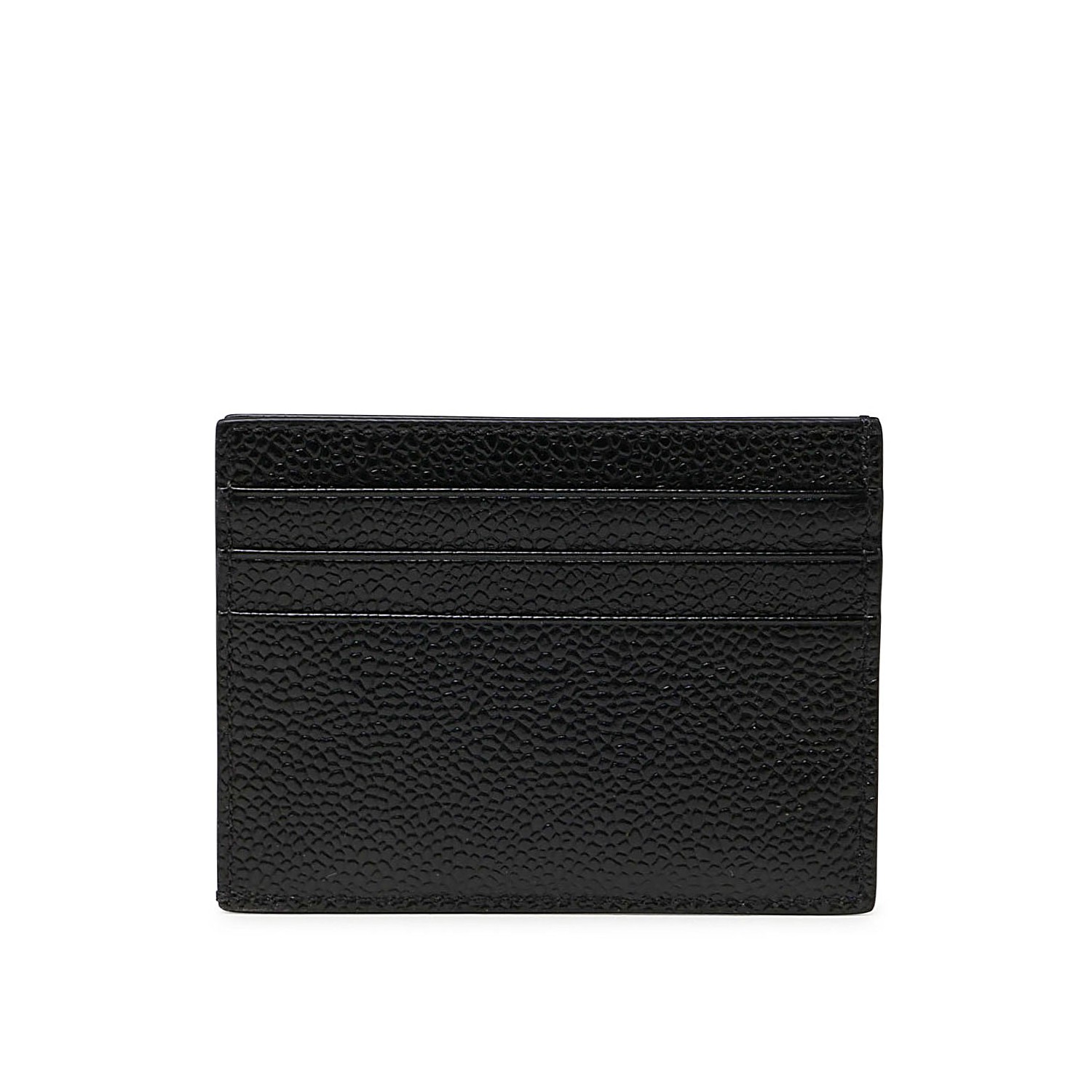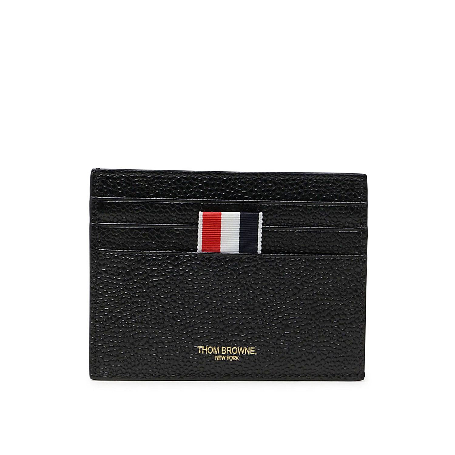 Black leather cardholder featuring a pebbled leather texture, a signature tri-colour striped trim, a front centre logo stamp and multiple card slots.