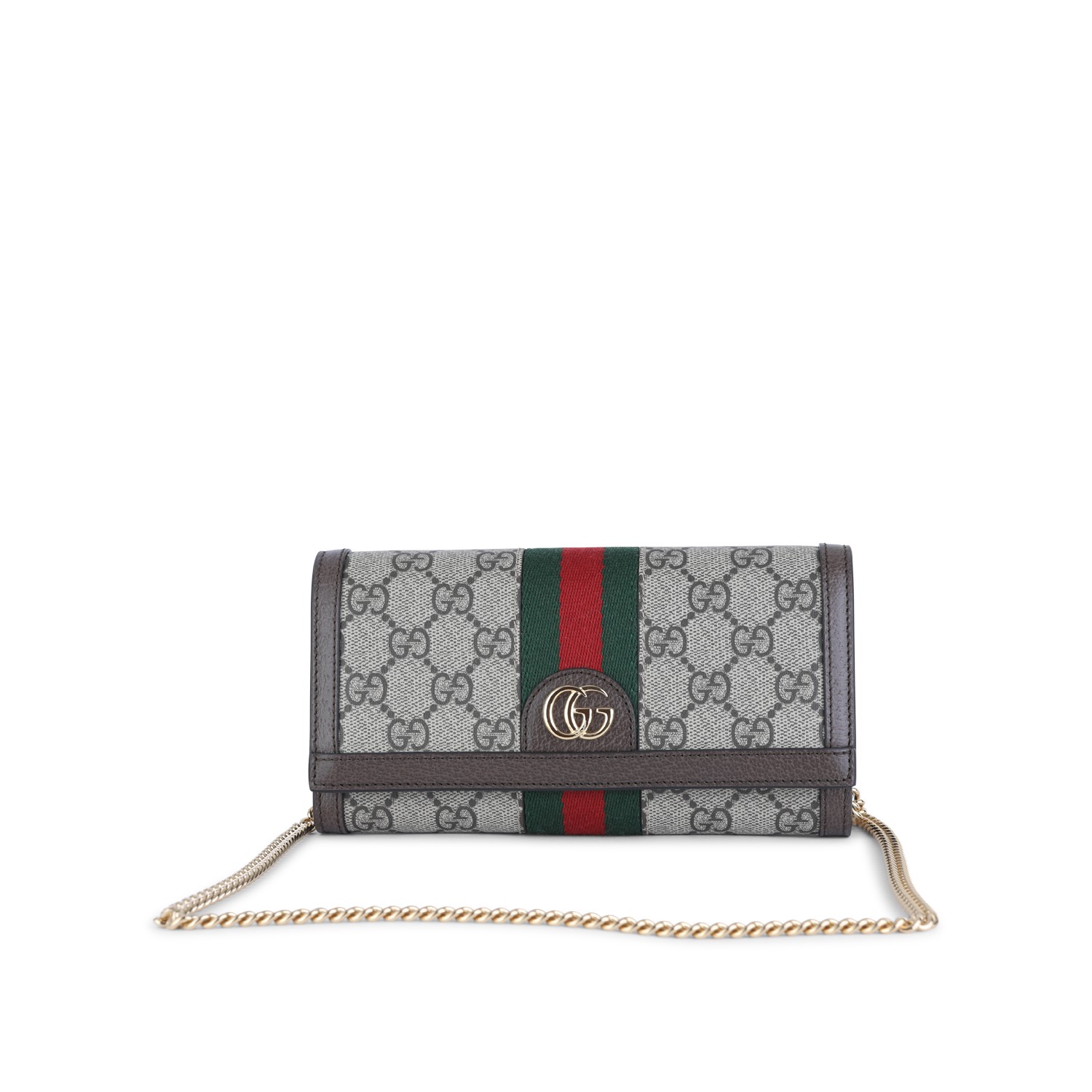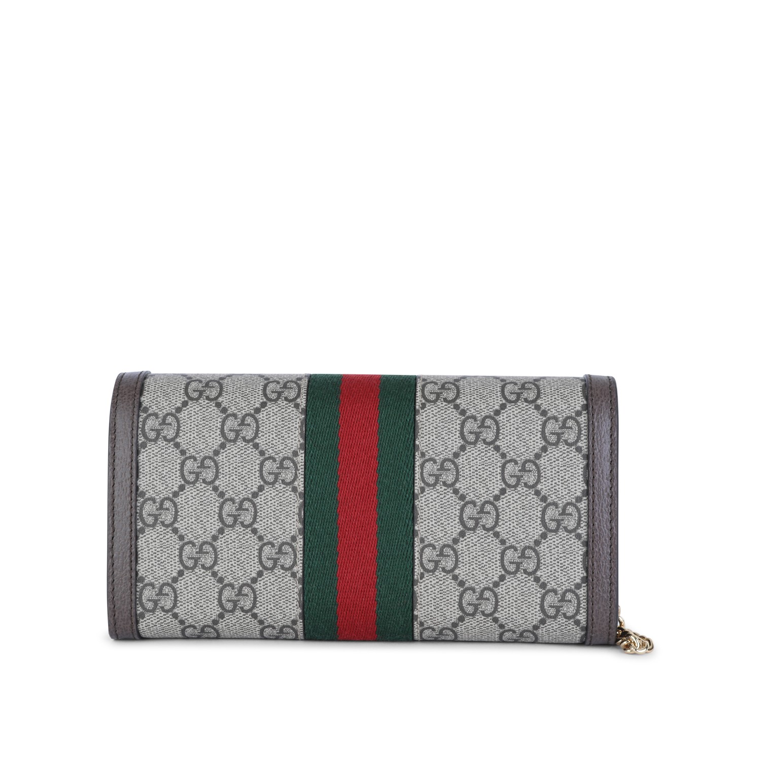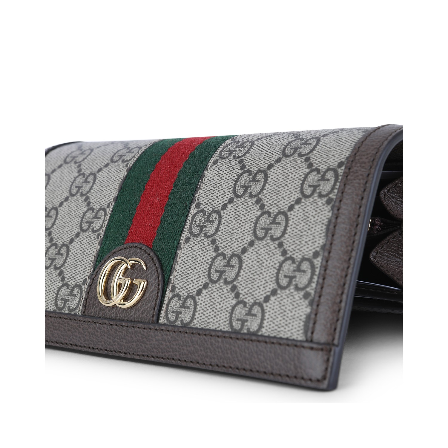 Ebony Ophidia wallet from Gucci featuring gold tone metal hardware, all over GG print, three band detail and logo magnetic closure with card slots and hidden pocket.