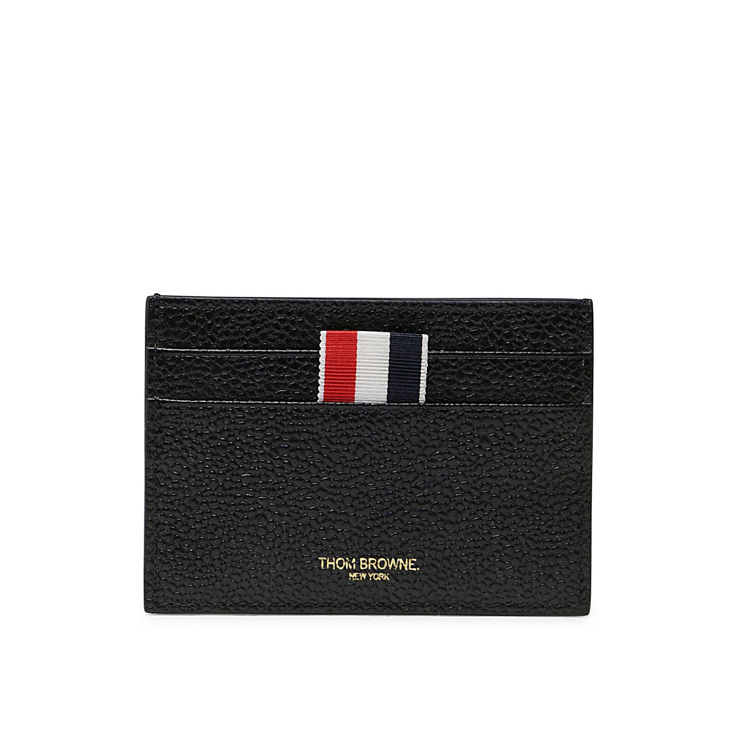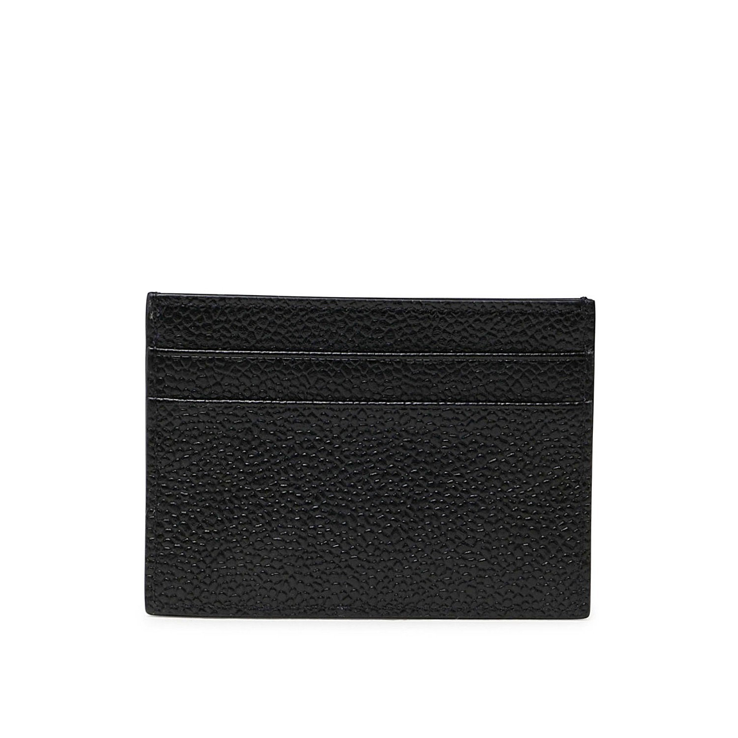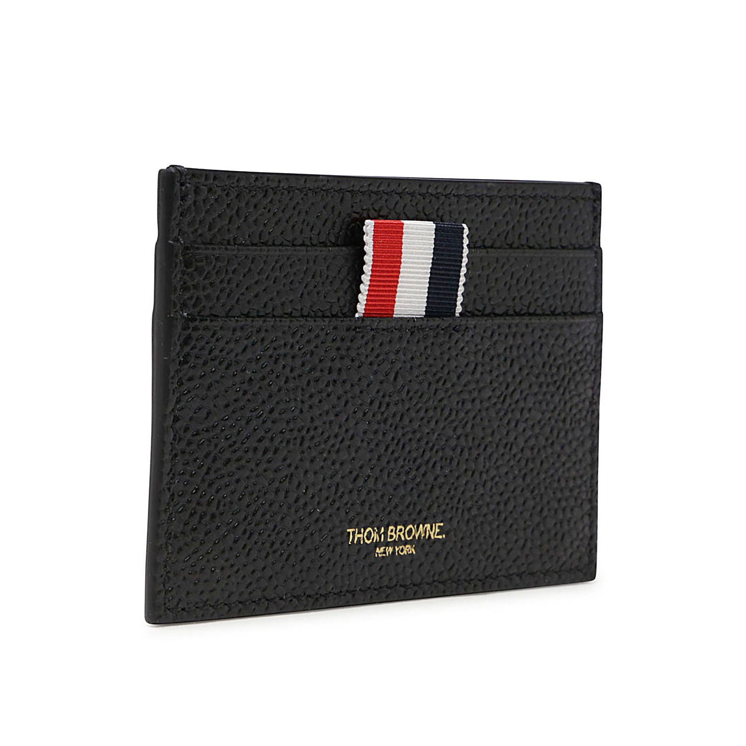 Black card holder from Thom Browne featuring card holders, gold tone logo and patch.