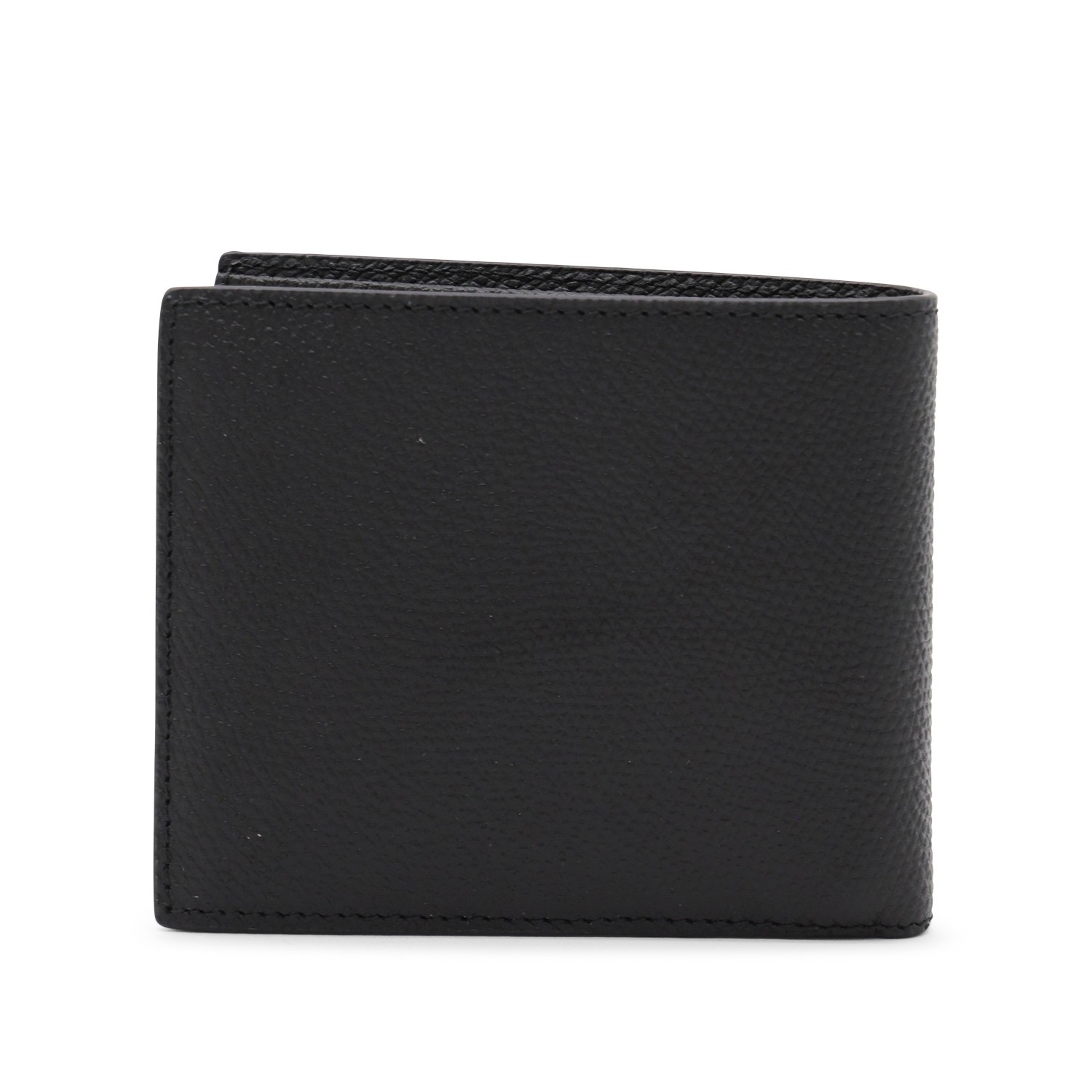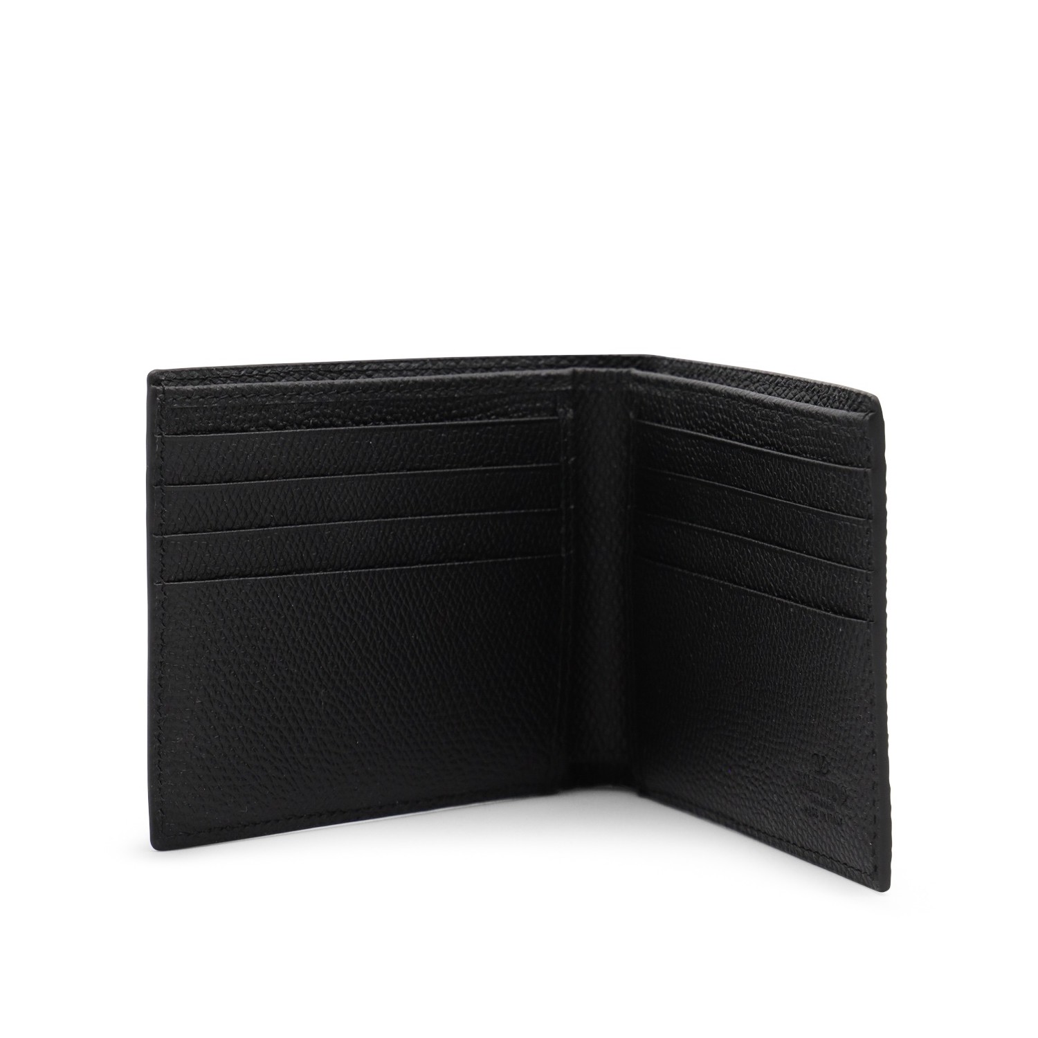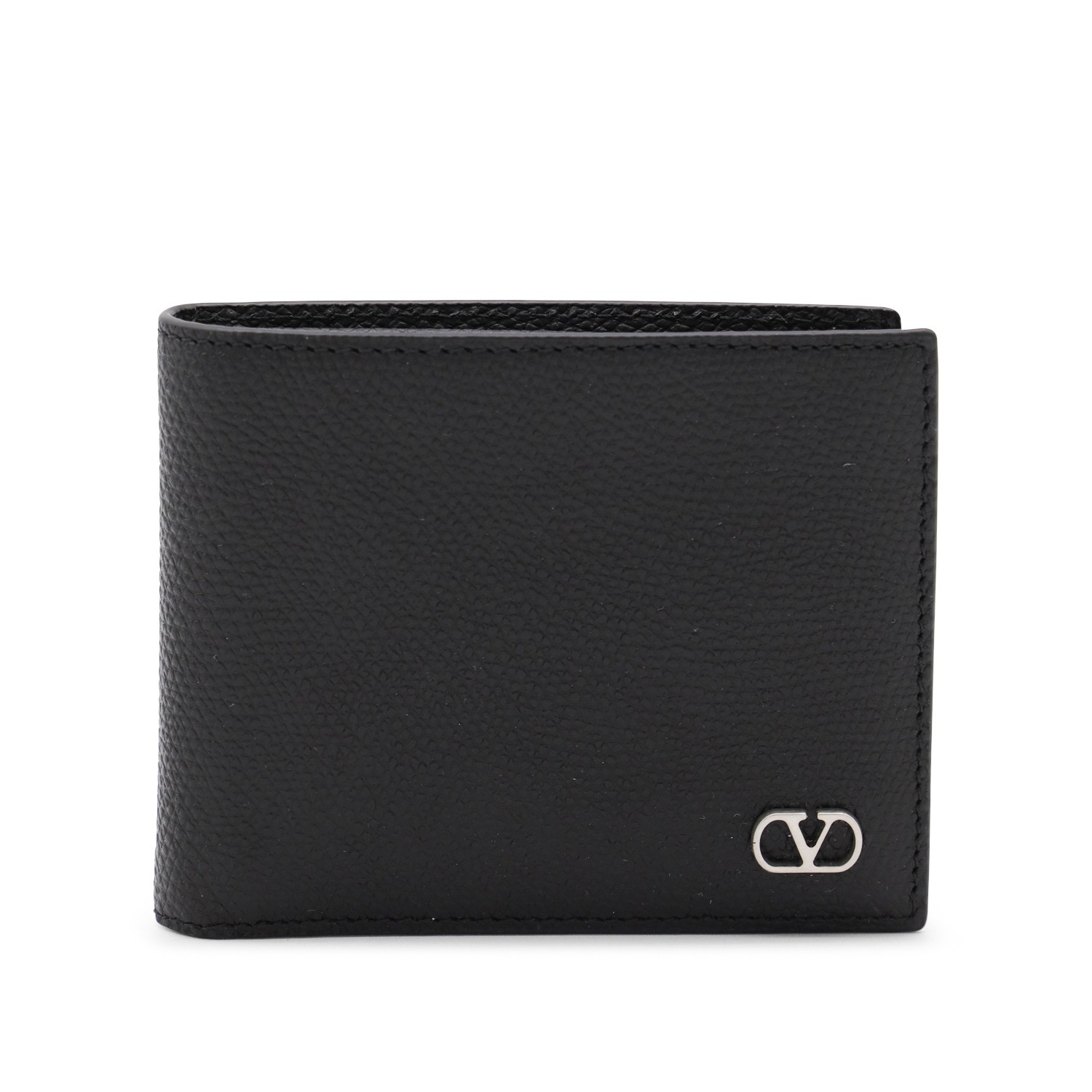 Black leather wallet from Valentino Garavani featuring bellows closure, frontal silver tone logo, card slots and pocket.