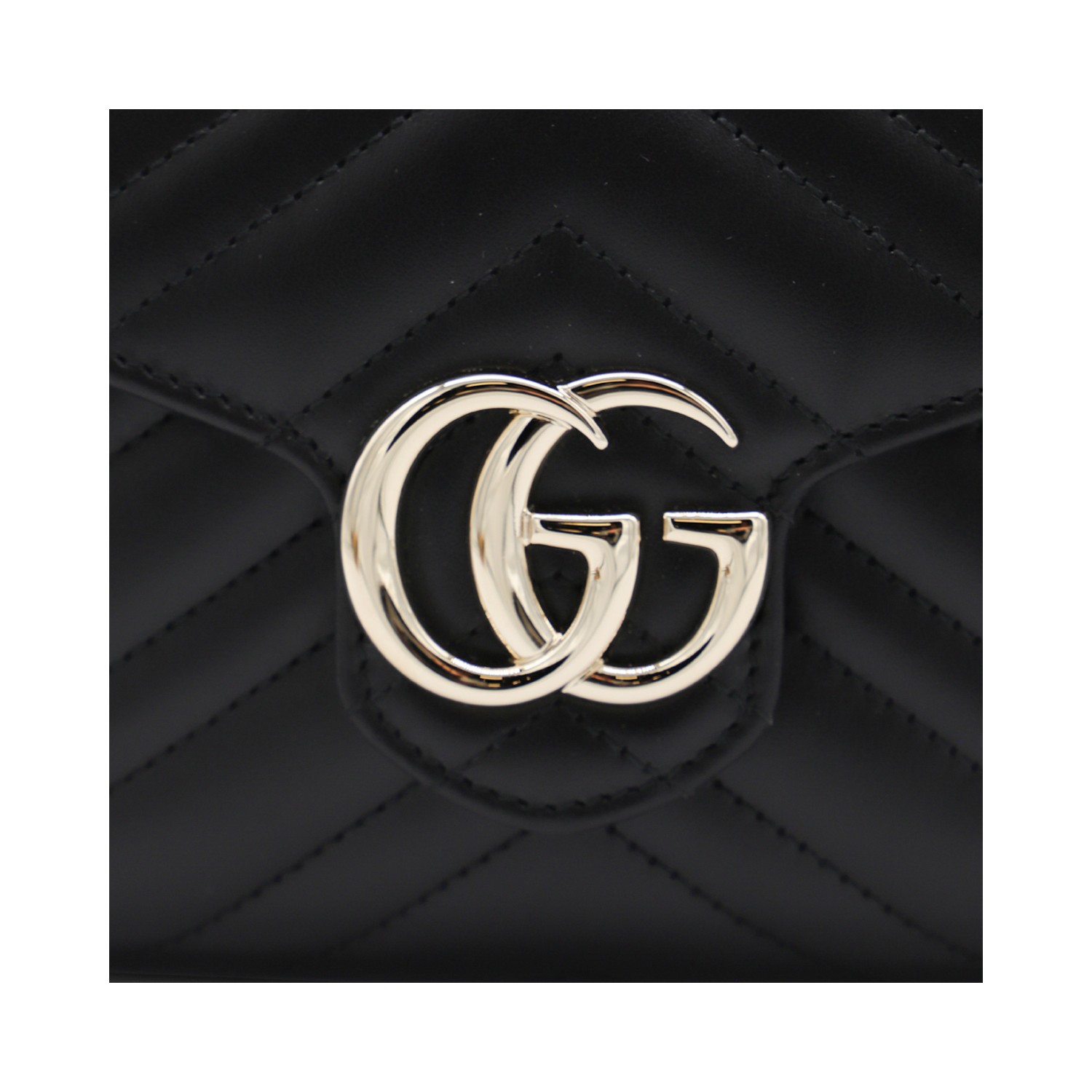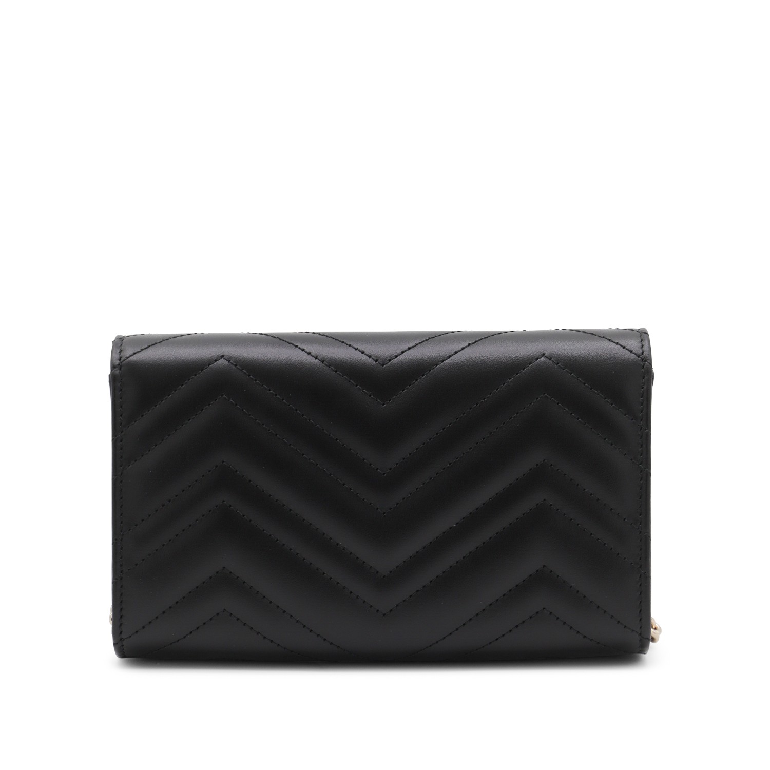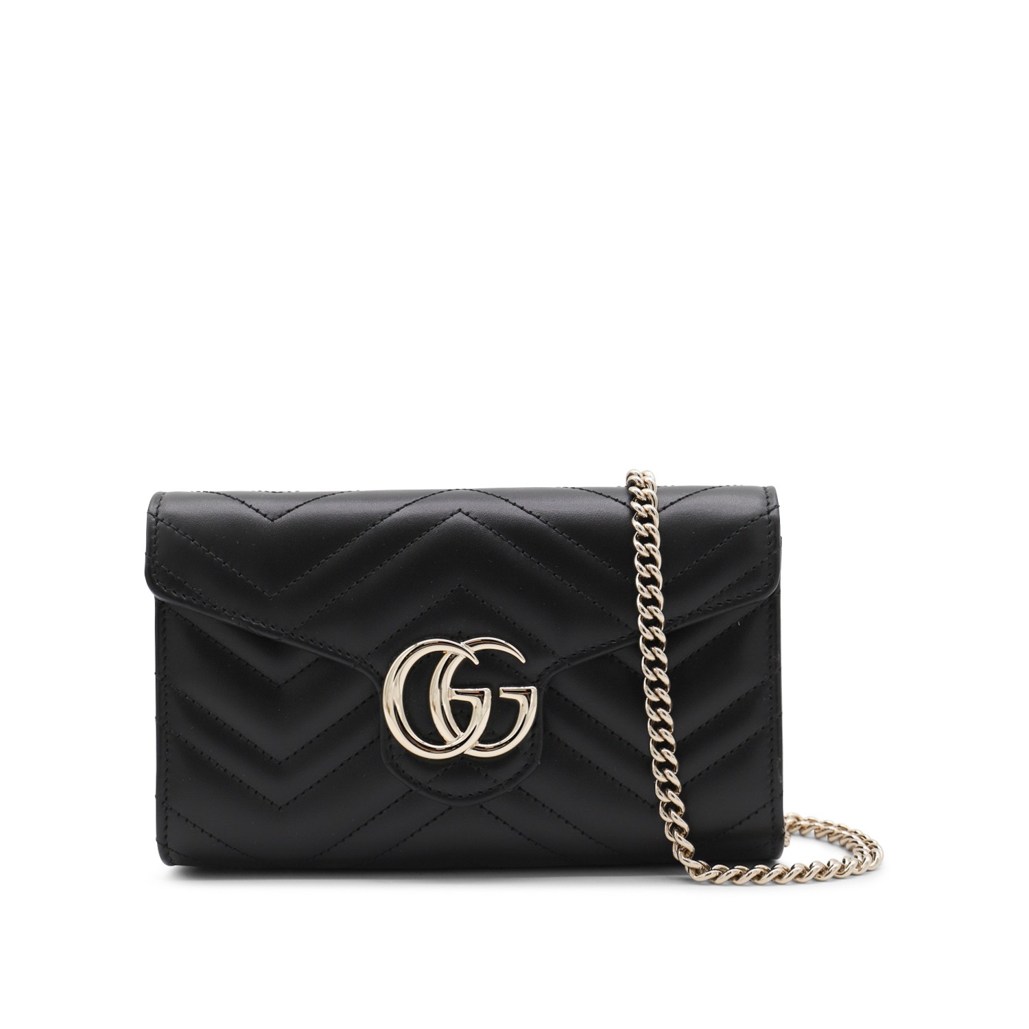 Black leather GG Marmont wallet from Gucci featuring gold tone hardware, chain-link strap, matelass frontal GG logo, card slots and internal pockets.