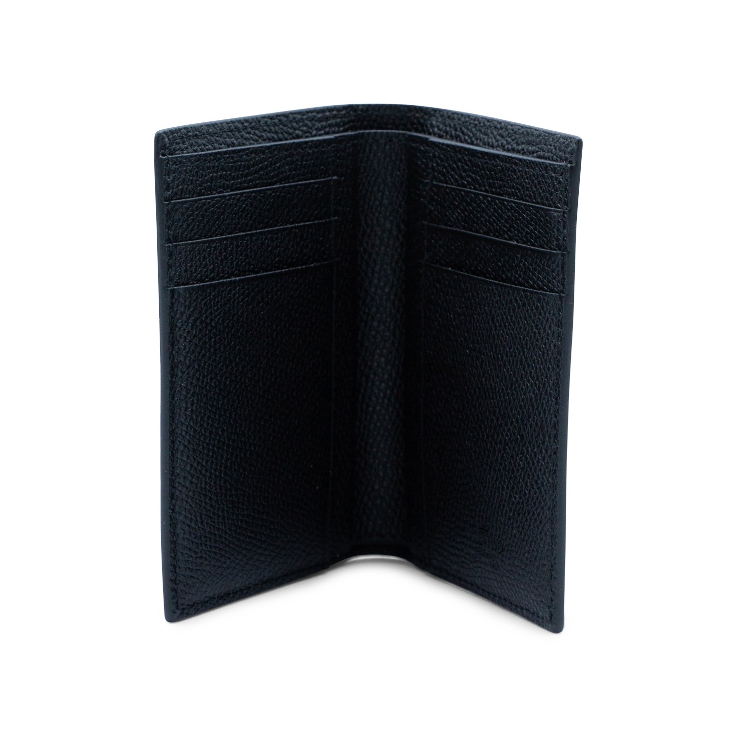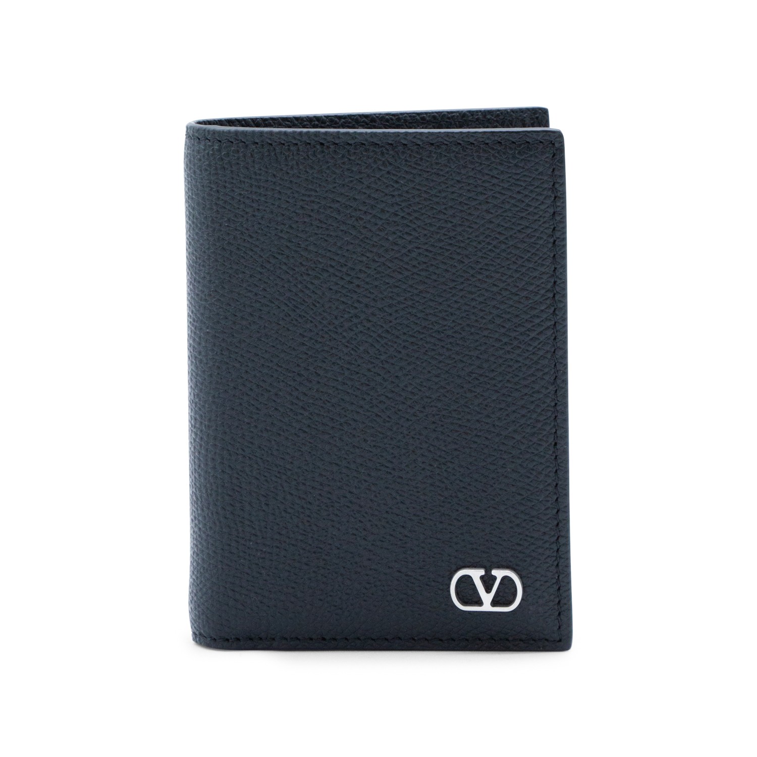 Black leather card holder from Valentino Garavani featuring rectangular shape, silver tone logo patch, cars slots and flat pockets.