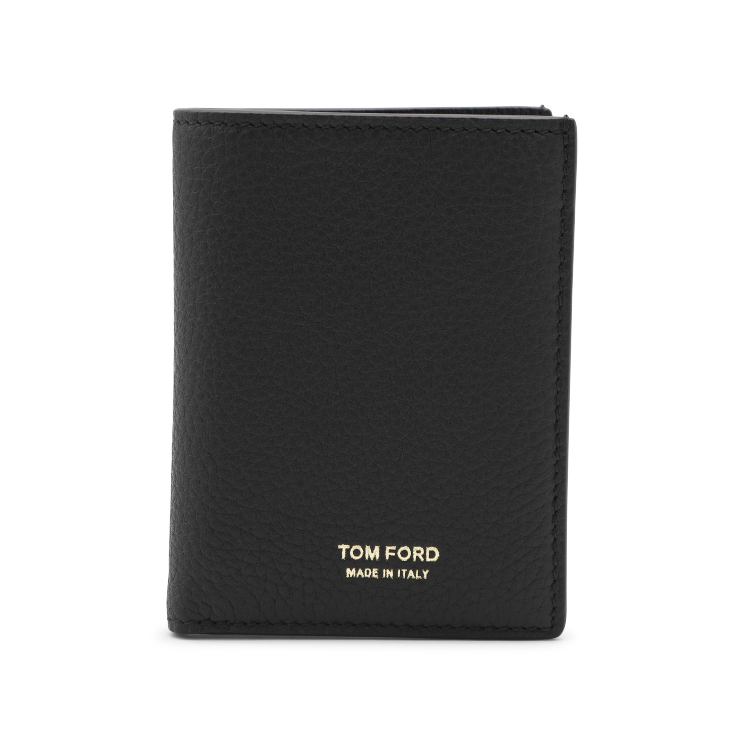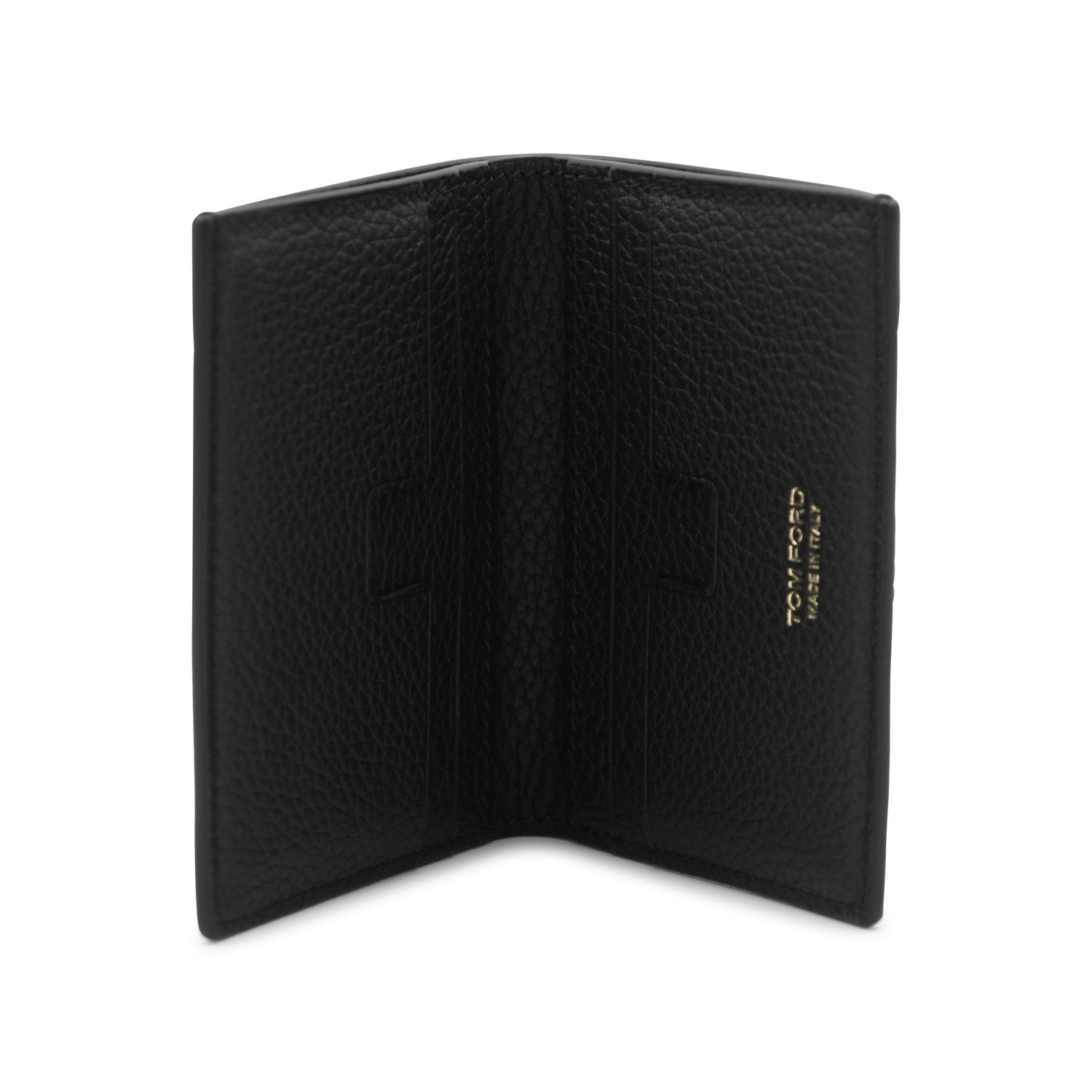 Black leather card holder from Tom Ford featuring card slots, pocket and gold tone logo.
