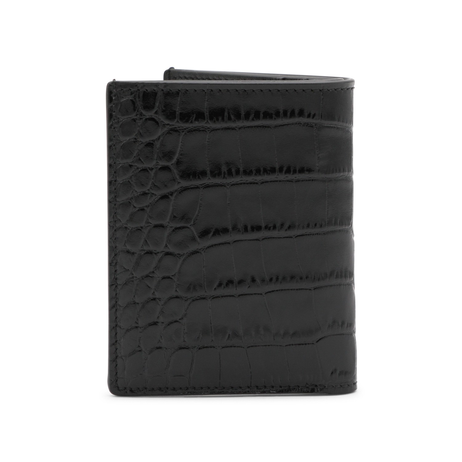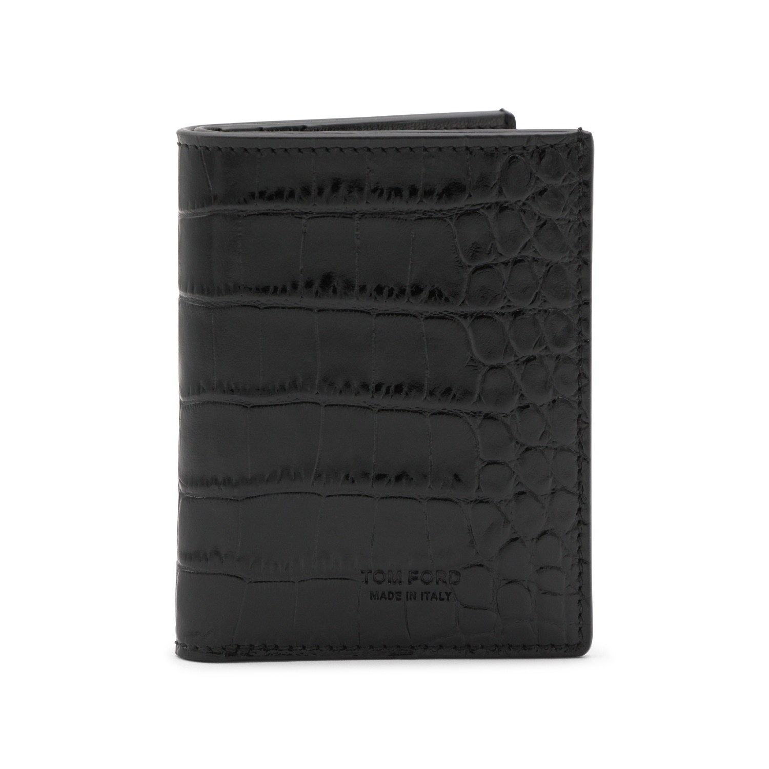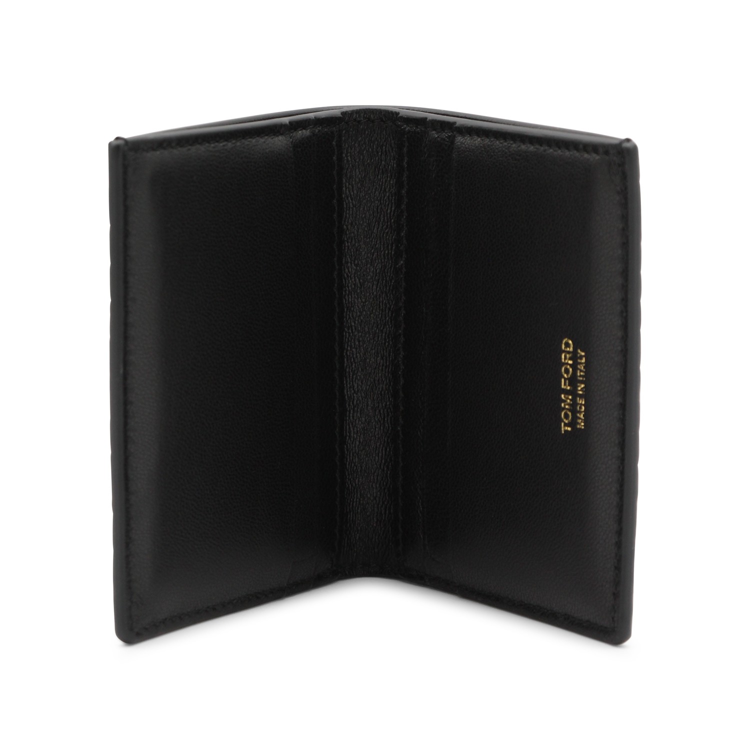 Black leather card holder from Tom Ford featuring card slots, pocket and engraved logo.