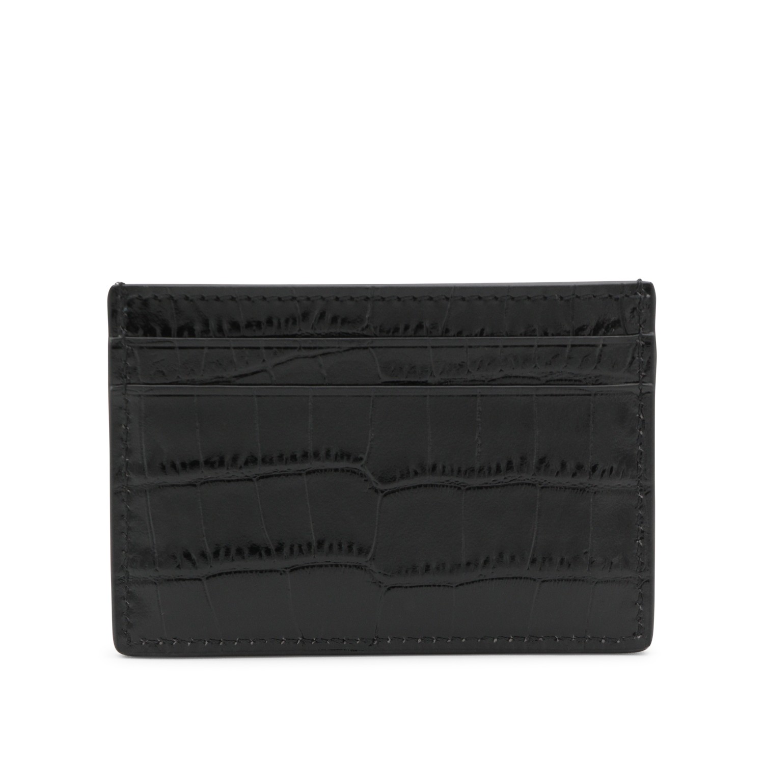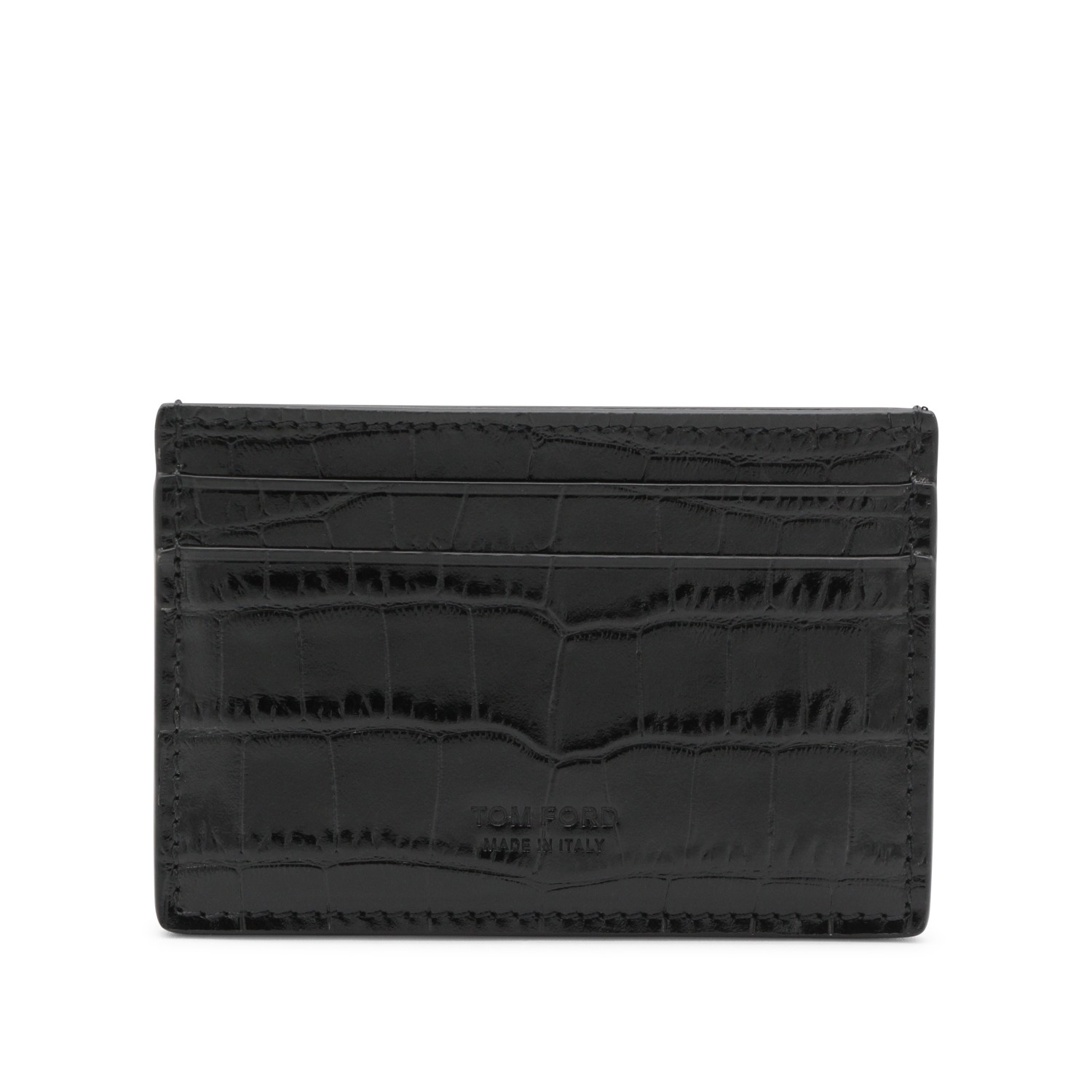 Black leather card holder from Tom Ford featuring card slots and engraved logo.