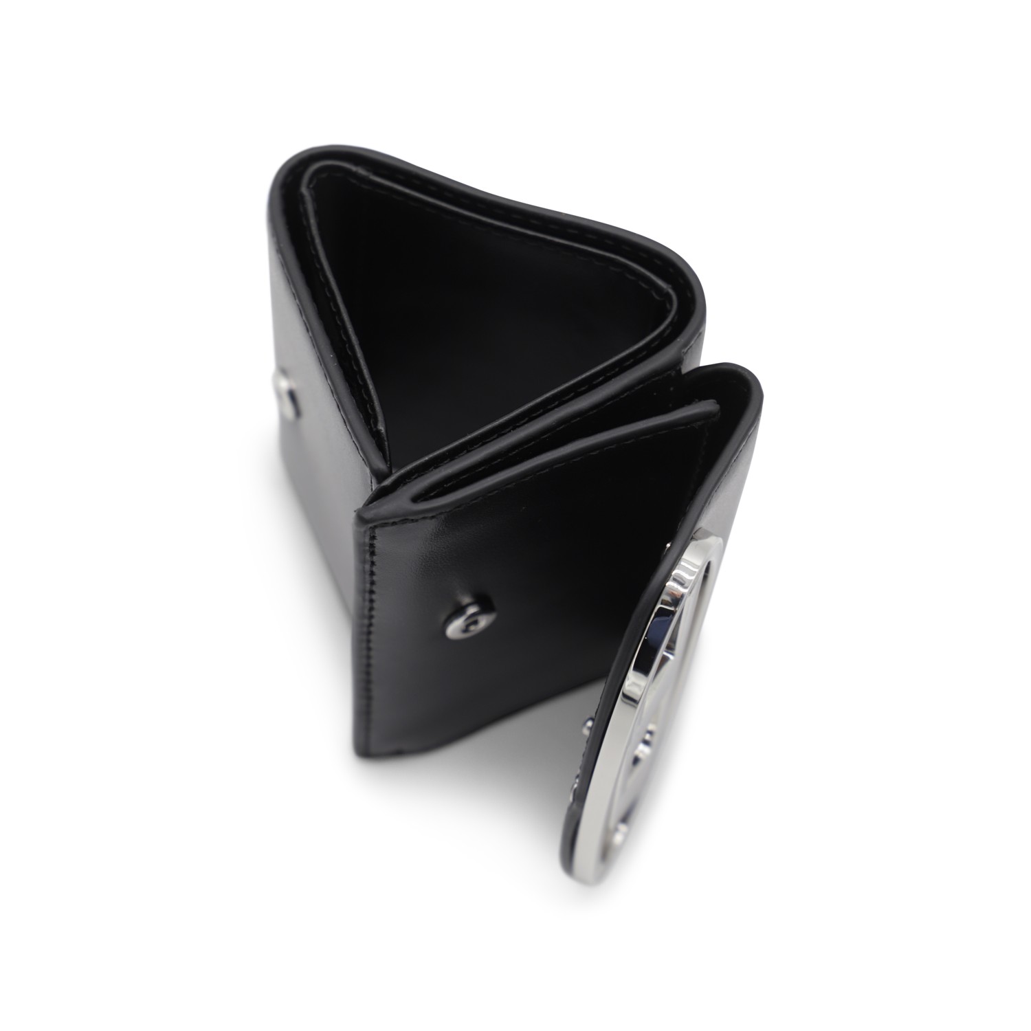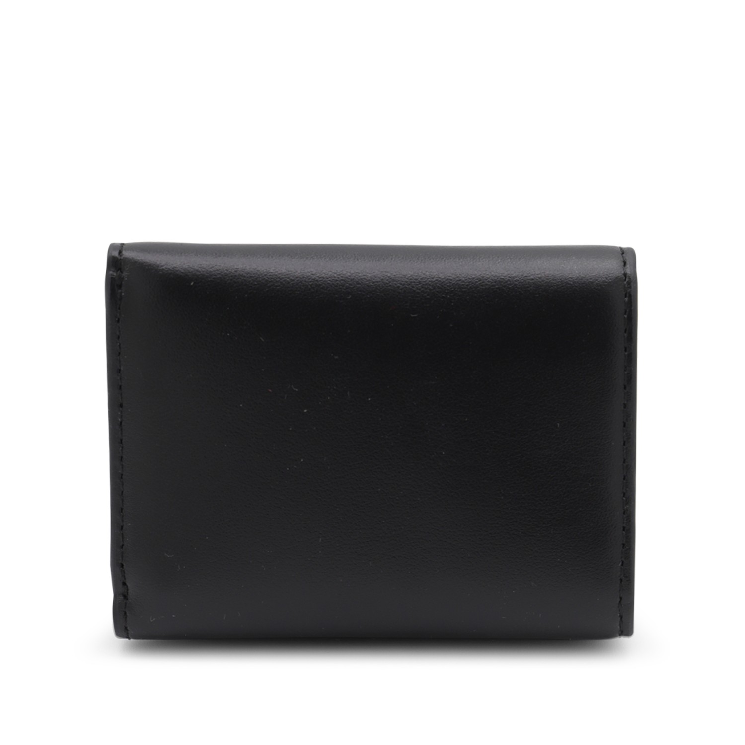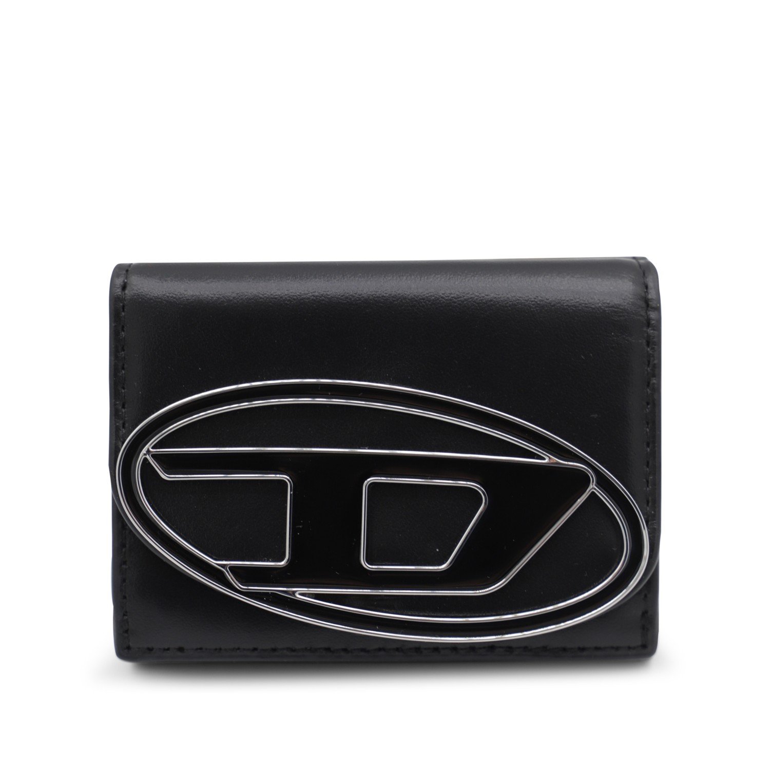 Black leather wallet from Diesel featuring logo plaque press-stud fastening, note compartment, coin pocket and tri-fold design.